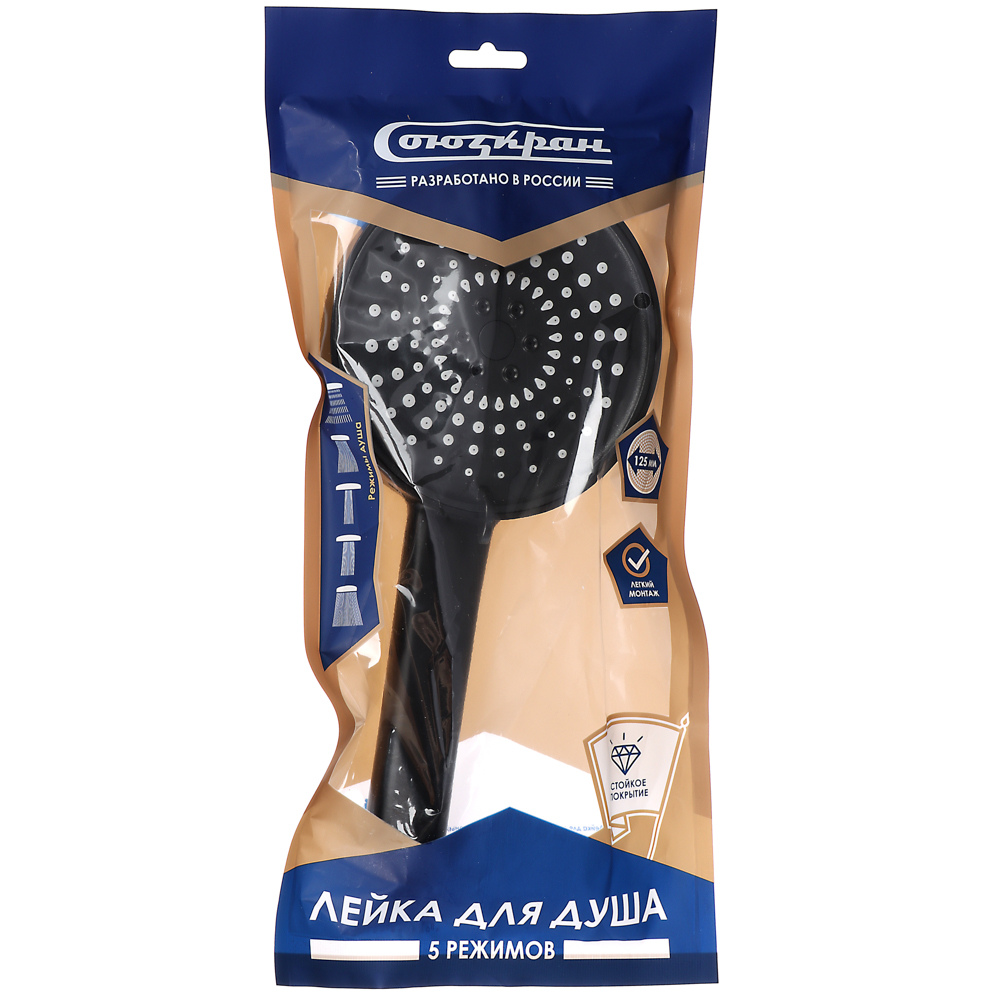 Лейка для душа СоюзКран диаметром 125 мм черного цвета – это высококачественное душевое оборудование для современной ванной комнаты. Изготовлена из прочных долговечных материалов, имеет стойкое покрытие, которое не царапается и не теряет вид с течением времени. Лейка легко очищается от отложений и разводов. Предусмотрено 5 режимов работы с разной степенью интенсивности потока: от узкого направленного до легкого тропического дождика. Легко и быстро присоединяется к душевому шлангу и надежно фиксируется.