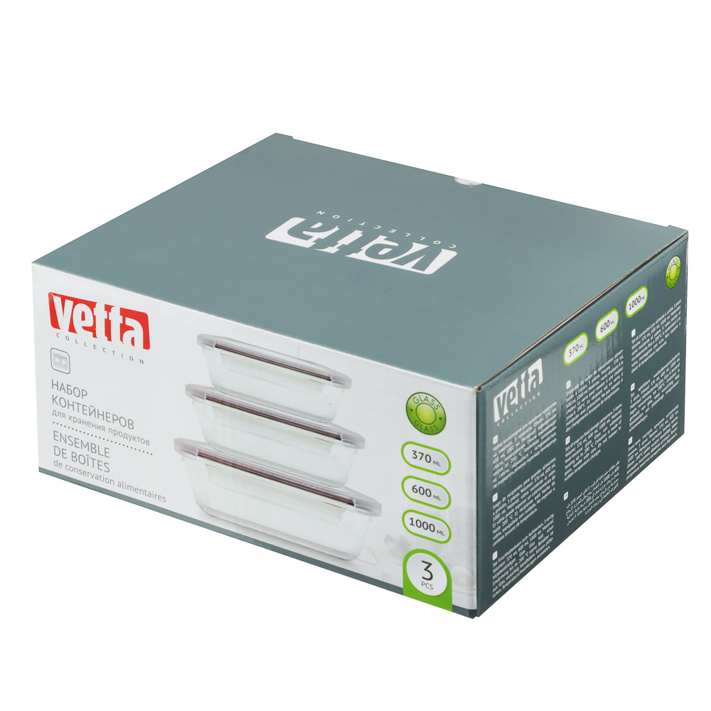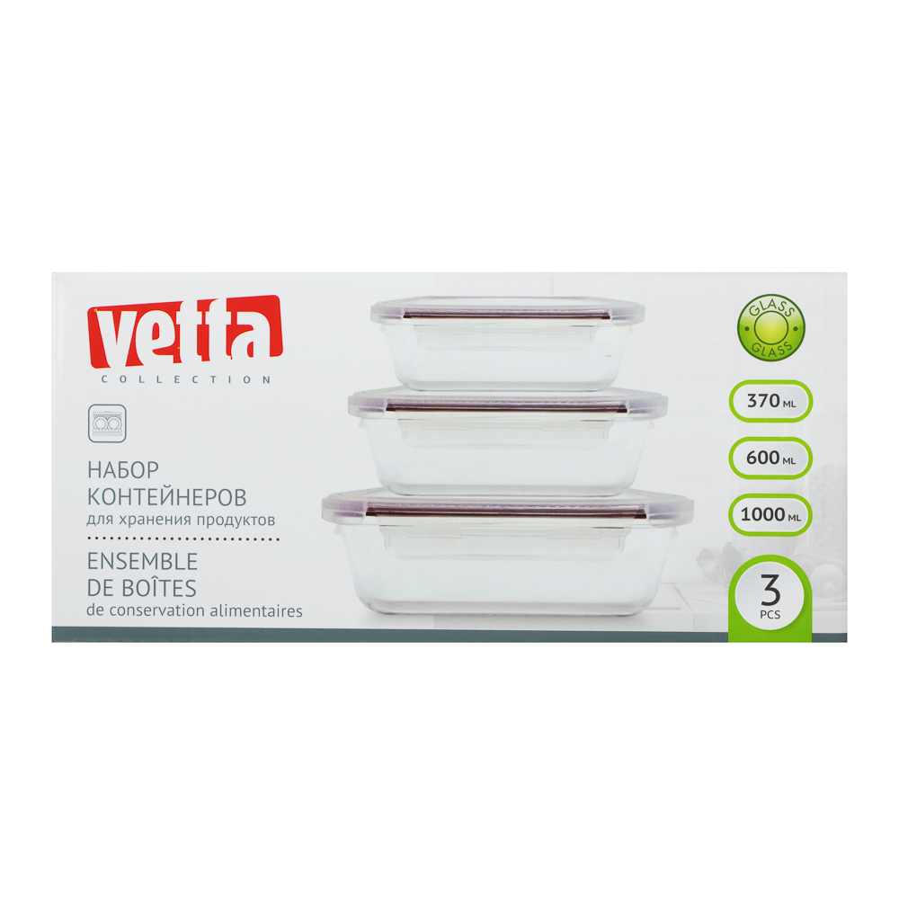 Набор контейнеров VETTA — это практичное решение для хранения продуктов. В комплект входят три контейнера с объемами 370 мл, 600 мл и 1000 мл, выполненные из жаропрочного стекла, что позволяет использовать их для хранения пищи как в холодильнике, так и для разогревания еды в микроволновой печи. Контейнеры оснащены крышками с надежными защелками, которые обеспечивают герметичность и сохранение свежести продуктов. Идеально подходят для хранения готовых блюд, заготовок и закусок, а также для удобного разогрева пищи.