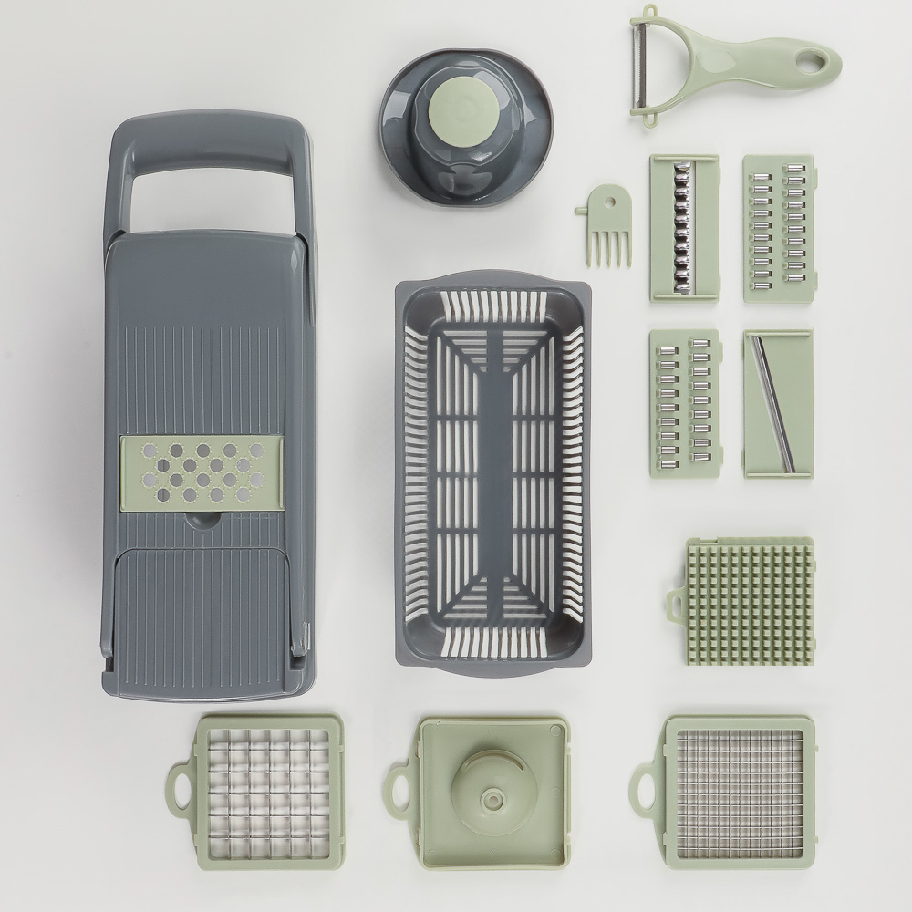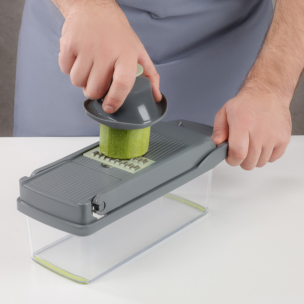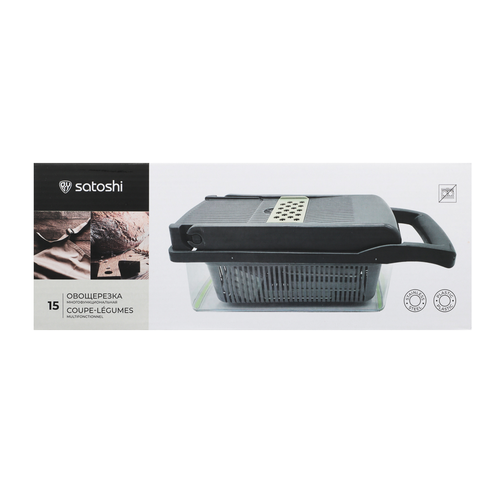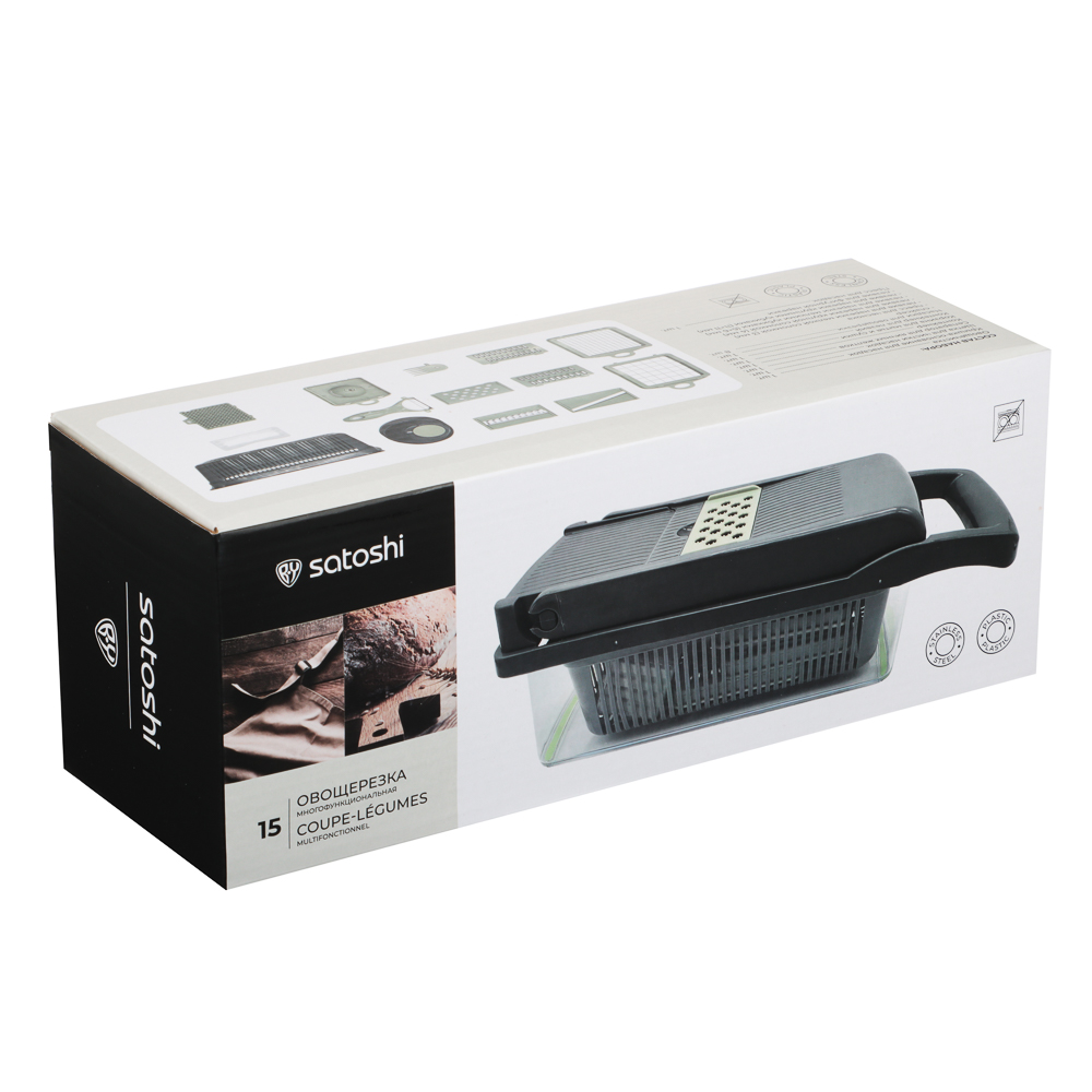 Овощерезка многофункциональная SATOSHI из 16 предметов "Мастер Слайсер" – это профессиональный кухонный помощник для идеальной нарезки овощей, фруктов и других продуктов. В комплекте 16 сменных насадок для различных видов шинковки, нарезки соломкой, кубиками и слайсами. Овощерезка значительно ускорит процесс приготовления любых блюд: супов, салатов и свежих и отварных овощей, вторых блюд, заготовок для заморозки. Набор также включает овощечистку, емкость с отверстиями для отделения жидкой фракции и пресс-ручка, которая защищает пальцы от повреждений. Корпус овощерезки и насадок изготовлен из прочного пищевого пластика, а металлические части и лезвия – из нержавеющей стали, устойчивой к коррозии и деформации. Все детали легко моются.