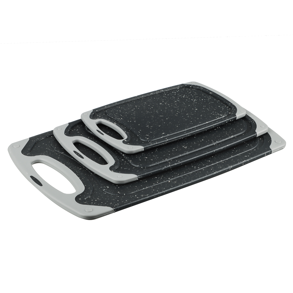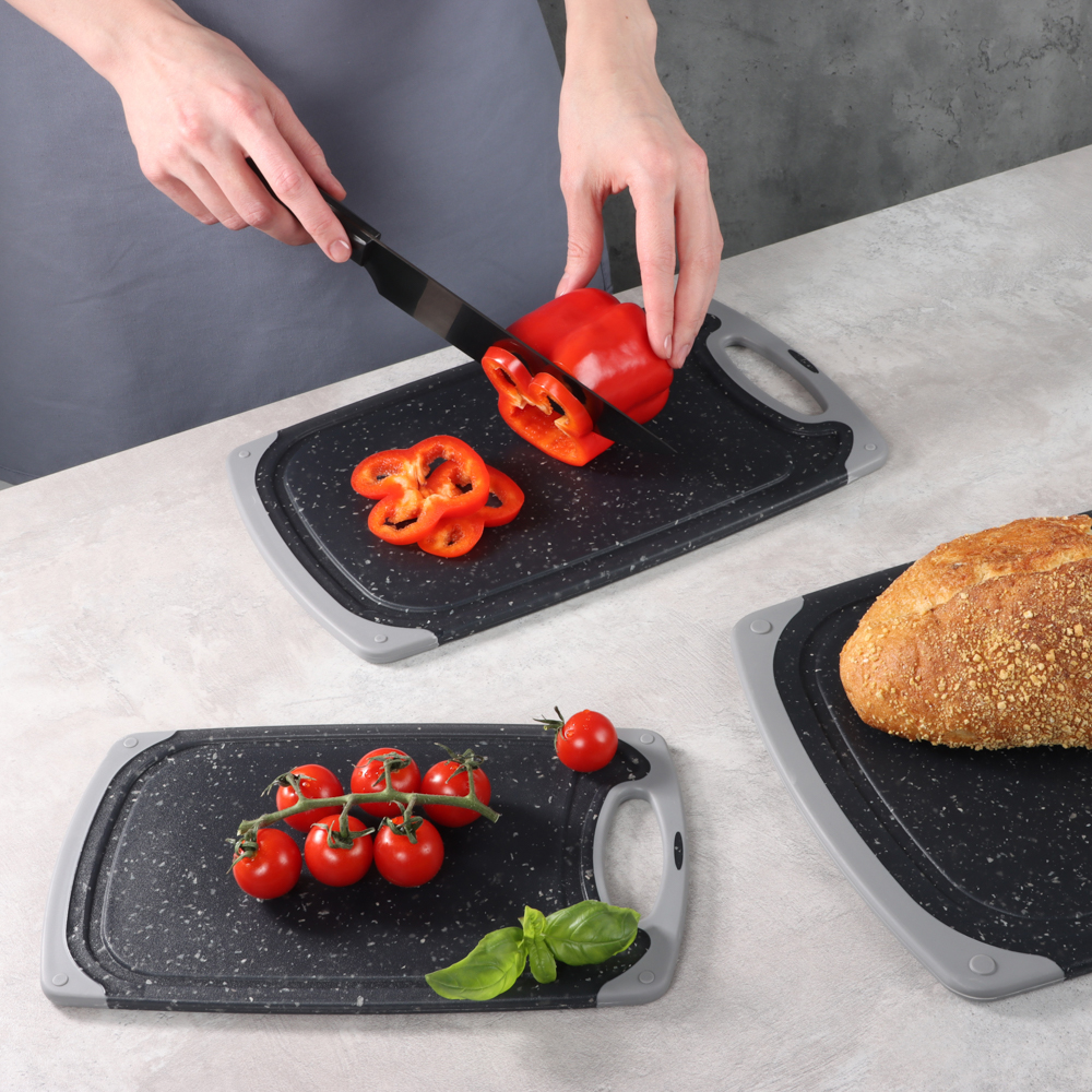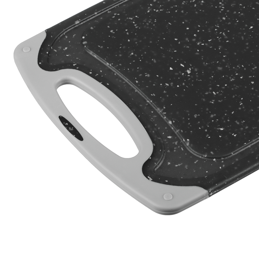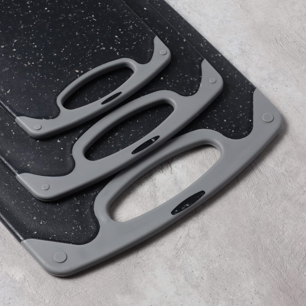 Набор пластиковых разделочных досок SATOSHI «Марсель» с прорубными ручками включает 3 доски разных размеров: 40х24х0,7 см, 33х20х0,7 см, 25х15х0,7 см, которые идеально подходят для любых задач на домашней кухне. Большая доска удобна для разделки мяса и рыбы, а также для шинковки овощей, средняя идеальна для нарезки салатов и хлеба, а маленькая – для мясных и рыбных полуфабрикатов и сыра. Доски устойчивы к деформации, не гнутся и не катаются по рабочей поверхности. Плотный пластик обладает высокой износостойкостью, легко моется и не снижает остроту заточки ножей. Черный цвет с узором «под мрамор» смотрится стильно и гармонично вписывается в интерьер современной кухни.