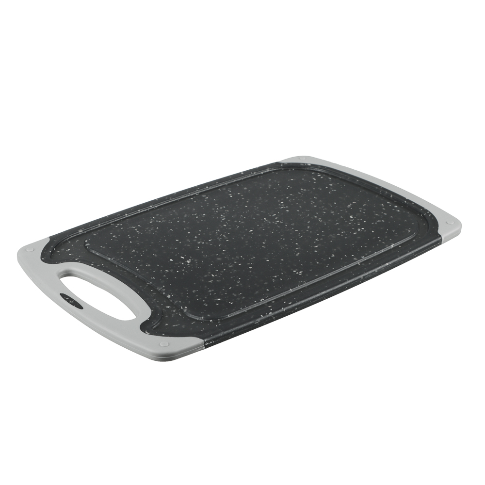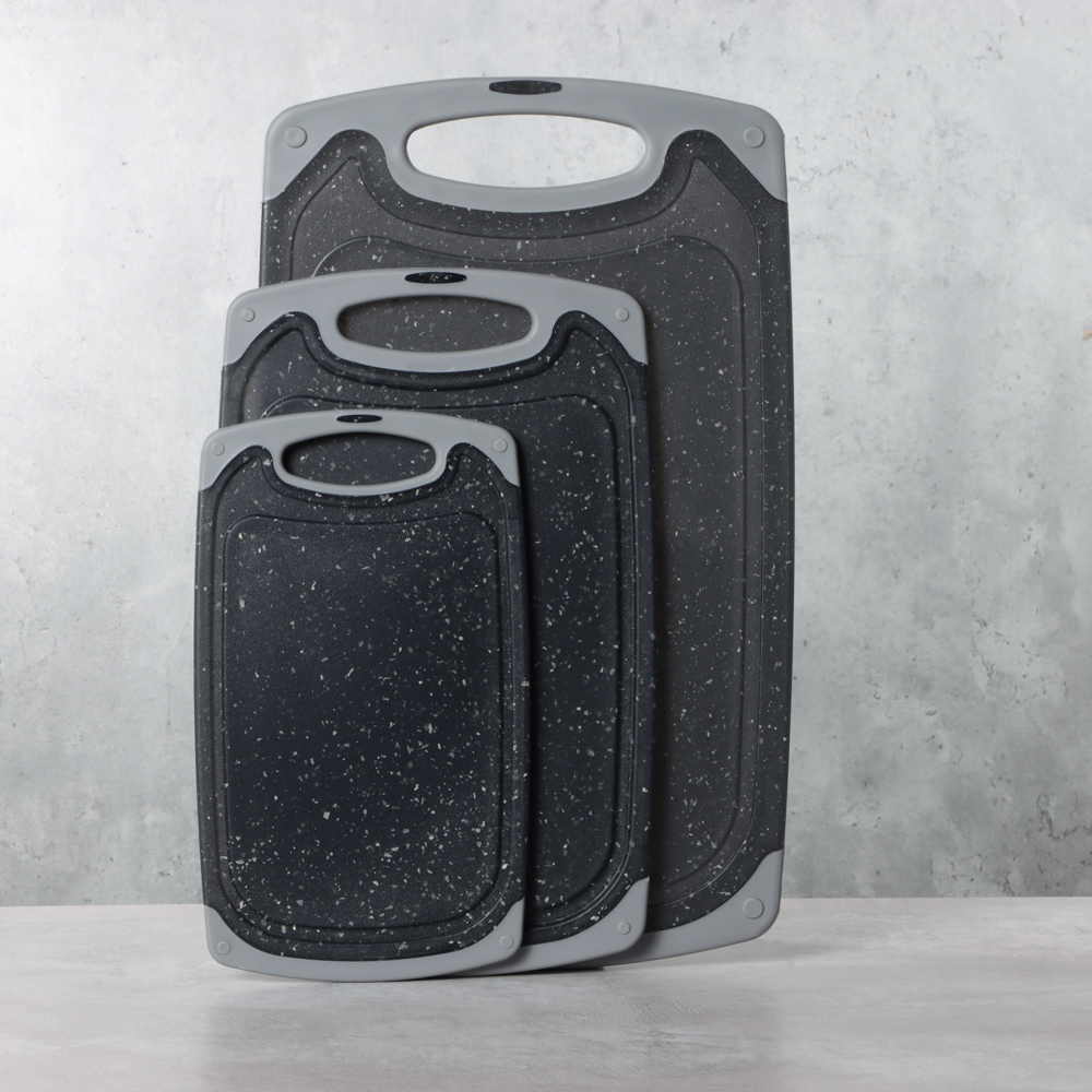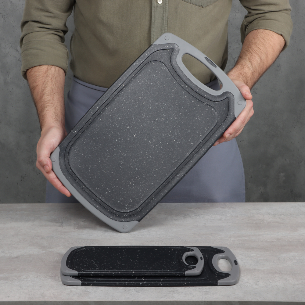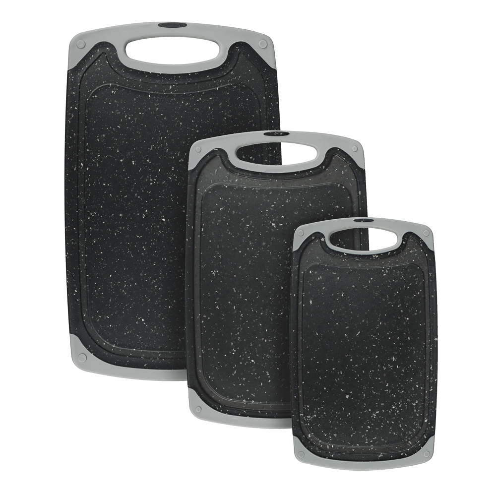 Набор пластиковых разделочных досок SATOSHI «Марсель» с прорубными ручками включает 3 доски разных размеров: 40х24х0,7 см, 33х20х0,7 см, 25х15х0,7 см, которые идеально подходят для любых задач на домашней кухне. Большая доска удобна для разделки мяса и рыбы, а также для шинковки овощей, средняя идеальна для нарезки салатов и хлеба, а маленькая – для мясных и рыбных полуфабрикатов и сыра. Доски устойчивы к деформации, не гнутся и не катаются по рабочей поверхности. Плотный пластик обладает высокой износостойкостью, легко моется и не снижает остроту заточки ножей. Черный цвет с узором «под мрамор» смотрится стильно и гармонично вписывается в интерьер современной кухни.