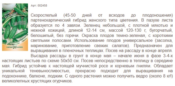 Скороспелый (45-50 дней от всходов до плодоношения) партенокарпический гибрид женского типа цветения. В пазухе листа образуется по 4 завязи. Зеленец небольшой, с плотной мякотью и нежной кожицей, длиной 12-14 см, массой 120-130 г, бугорчатый, белошипый, без горечи. Окраска плодов темно-зеленая, с короткими светлыми полосами. Использование плодов универсальное (засолка, маринование, приготовление свежих салатов). Предназначен для выращивания в пленочных теплицах. Посев на рассаду в конце апреля. Высадка рассады в грунт в конце мая – начале июня в фазе 3-4-х настоящих листьев по схеме 50х50 см. Посев непосредственно в теплицу в середине мая. Гибрид устойчив к настоящей мучнистой росе и корневым гнилям. Обладает уникальной теневыносливостью, прекрасно подходит для выращивания на подоконнике, балконе, лоджии. С одного растения можно получить ведро (около 8 кг!) великолепных хрустящих огурчиков.