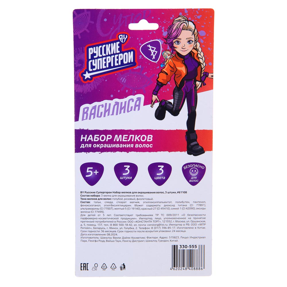 Создайте яркий и стильный образ с набором мелков для окрашивания волос BY Русские Супергерои! В комплект входят три насыщенных цвета: голубой, розовый и фиолетовый. Подходят для детей от 5 лет, обеспечивая безопасное использование благодаря гипоаллергенной формуле. Мелки легко наносятся и смываются обычным шампунем, позволяя менять образы хоть каждый день. Компактный размер и отдельная упаковка для каждого мелка делает их удобными для хранения и использования дома или на праздниках. Идеальный выбор для творчества, игр и экспериментов с внешностью — сделайте каждый день ребенка по-настоящему красочным!
