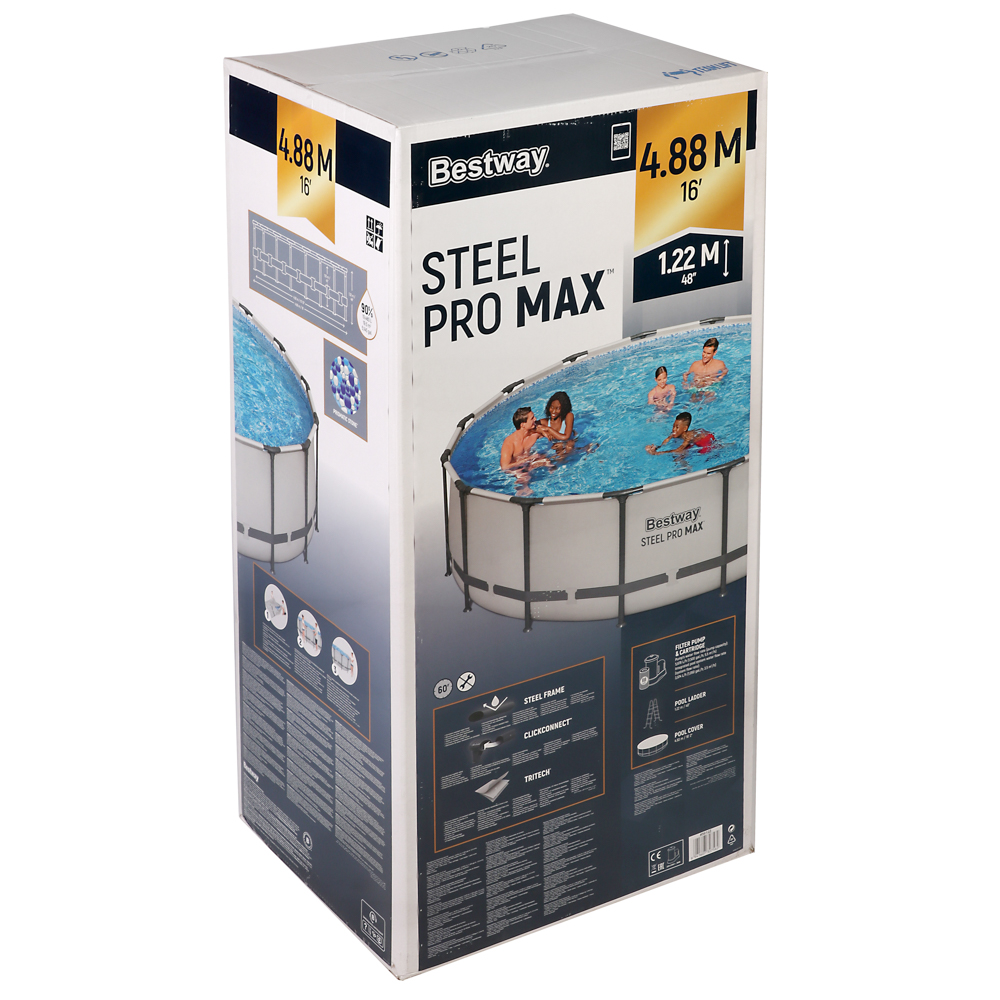 Вместительный каркасный бассейн BESTWAY — это готовый комплект для комфортного отдыха на природе. Чаша бассейна выполнена из высококачественного трехслойного ПВХ, а каркас из нержавеющего металла. Диаметр бассейна составляет 488 см, высота — 122 см. Простая конструкция позволяет легко и быстро собирать и разбирать бассейн. В комплект входит устойчивая лестница с противоскользящими ступенями для удобного пользования бассейном, фильтр-насос производительностью 5678 литров в час, обеспечивающий циркуляцию и фильтрацию воды. Благодаря сливному клапану к бассейну можно подключить садовый шланг и слить воду в любое место.