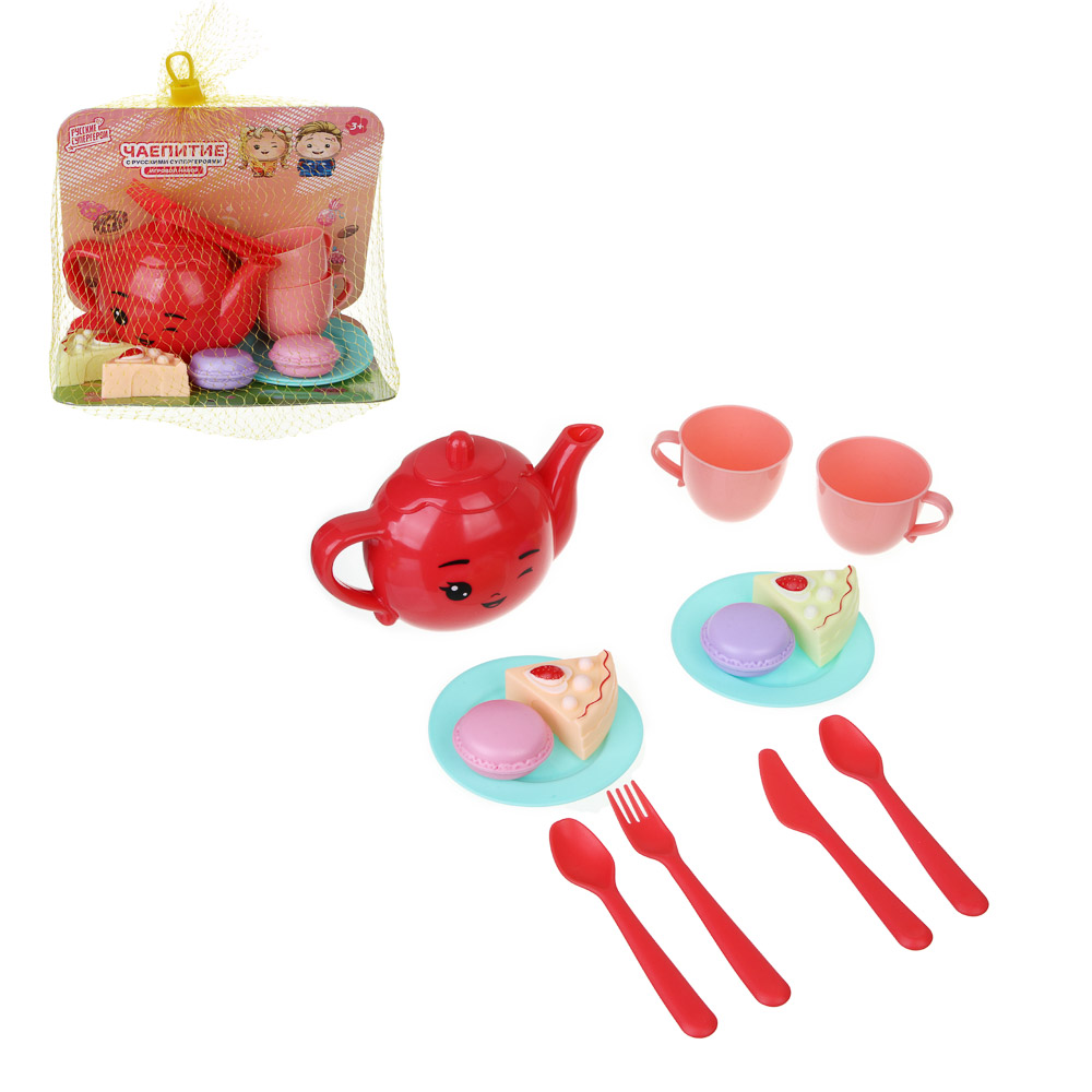 Игровой набор BY «Чаепитие c Русскими Супергероями» включает 14 пластиковых предметов для двух персон: чайничек, блюдца, кружки, столовые приборы и продукты. Компактный набор из ярких красочных предметов станет приятным подарком для девочки и поможет разнообразить досуг, помогая ребенку создать свой собственный игровой мир, наполненный сюжетами из реальной жизни. Все предметы выполнены из прочного полипропилена и безопасны для детей старше 3-х лет. Набор упакован в сетку.