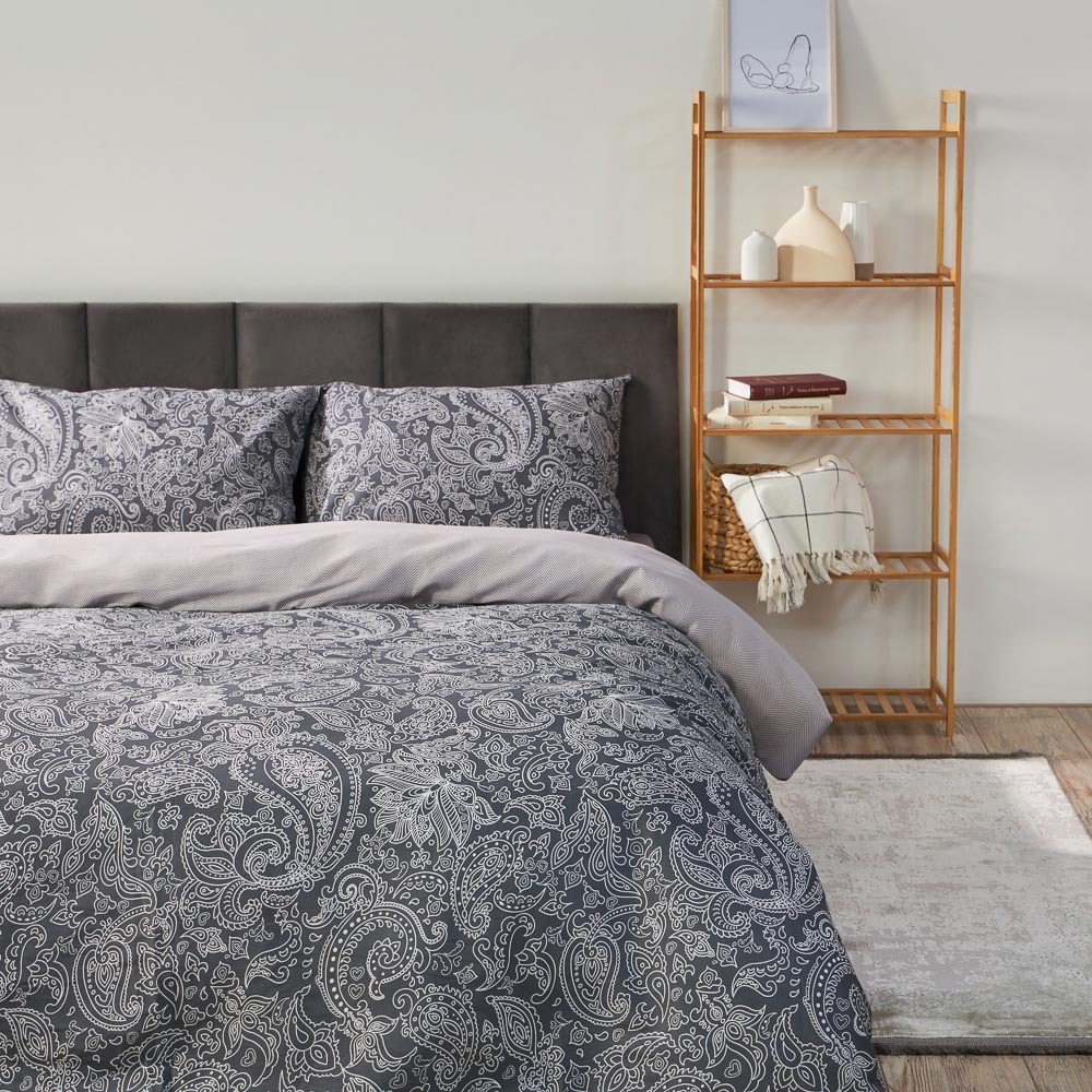 Постельное белье PROVANCE Фрэя – это стильный и практичный комплект для вашей двуспальной кровати. Выполненный из прочной и дышащей бязи из 100% хлопка, он обеспечит комфортный и здоровый сон. Серый цвет в сочетании с элегантным узором пейсли придает комплекту утонченный вид. Пододеяльник и наволочки сшиты из основной ткани, а простынь и обратная сторона пододеяльника выполнены из ткани-компаньона, что добавляет комплекту особый шарм. Этот набор станет отличным выбором для тех, кто ценит качественные материалы и гармоничный дизайн.