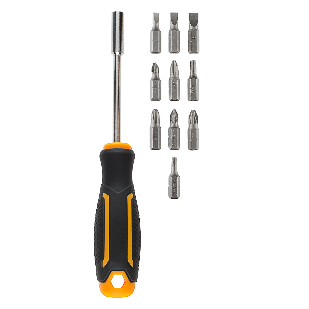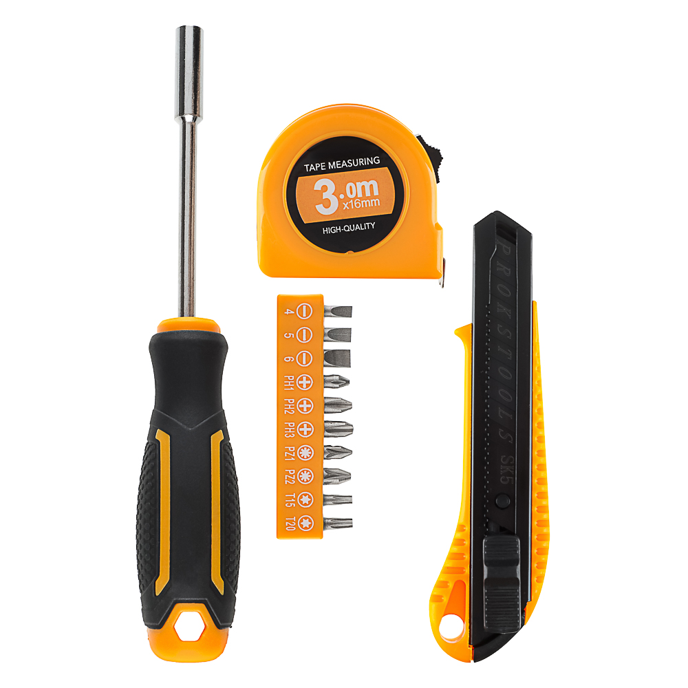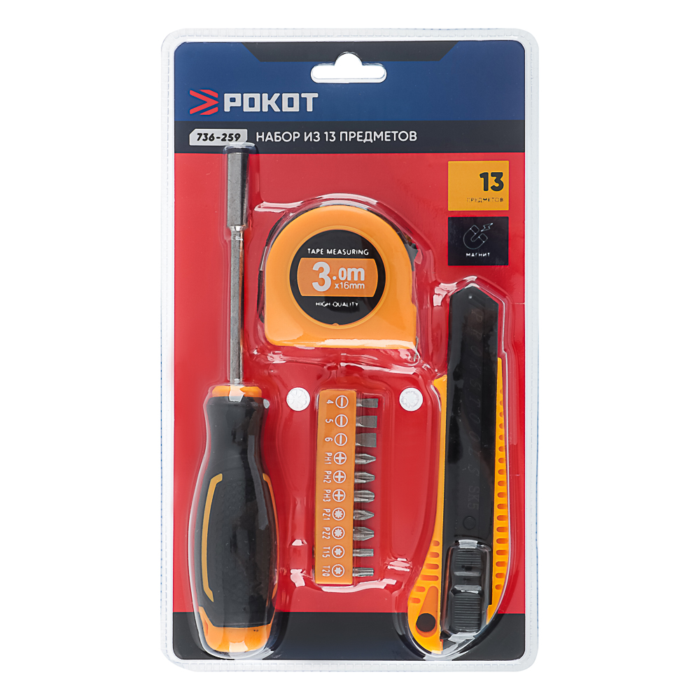 РОКОТ — универсальный набор инструментов из 13 предметов, включающий отвёртку под биты, 10 бит, сегментный нож 18 мм и рулетку 3 метра. Отвёртка оснащена магнитным наконечником для удобства работы с крепежами. В наборе также представлены 10 бит разных размеров для работы с различными типами винтов и крепёжных элементов. Сегментный нож позволяет легко разрезать провода или другие материалы, а рулетка 3 метра обеспечивает точность измерений. Этот набор идеально подходит для строительных работ и является незаменимым помощником в арсенале мастера.