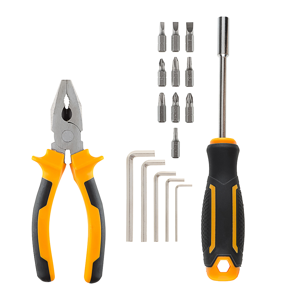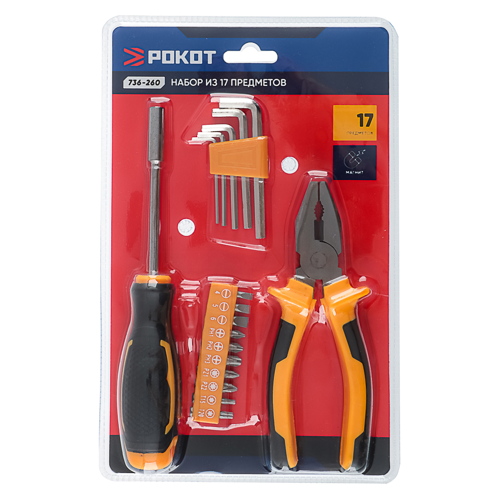 Набор инструментов Рокот — идеальный выбор для строительных работ. В комплекте: отвёртка под биты, 10 бит, 5 шестигранников и пассатижи длиной 150 мм. Магнитные наконечники облегчают работу с мелкими деталями. Инструменты изготовлены из углеродистой стали и пластика.