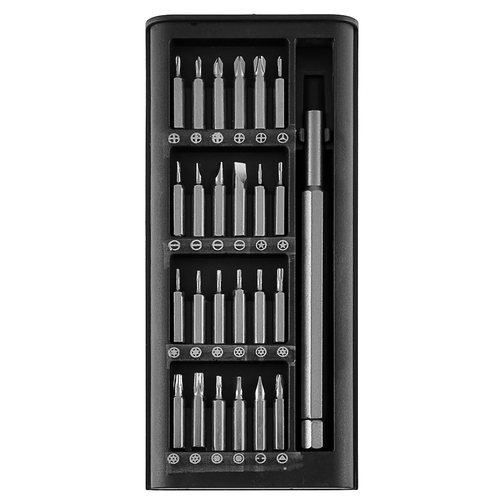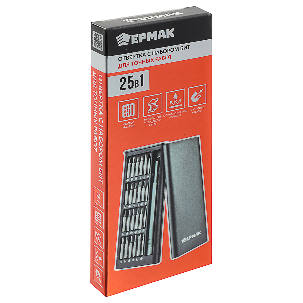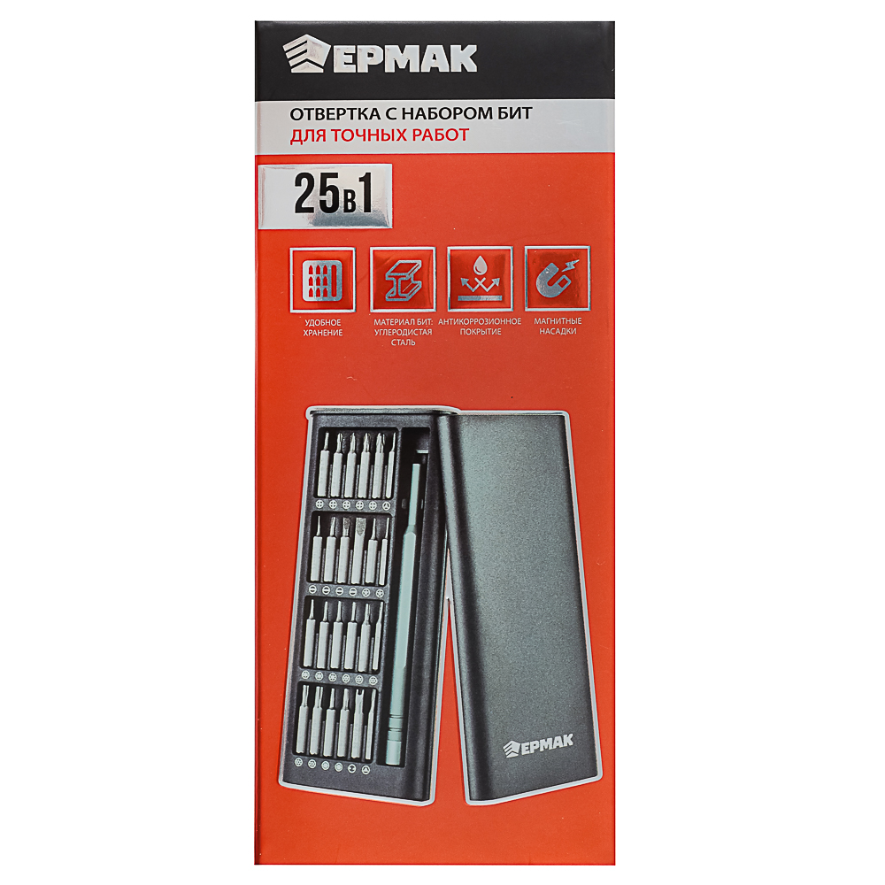 ЕРМАК Набор для точных работ 25в1 — это универсальный и компактный инструмент для выполнения широкого спектра задач. В набор входит удобная отвертка с магнитным держателем и 24 сменные биты длиной 25 мм, изготовленные из прочного фосфорированного материала, что обеспечивает долговечность и устойчивость к износу. Биты покрыты защитным слоем, предотвращающим коррозию и увеличивающим срок службы. Все элементы набора аккуратно хранятся в пластиковом кейсе, который обеспечивает удобство переноски и хранения.