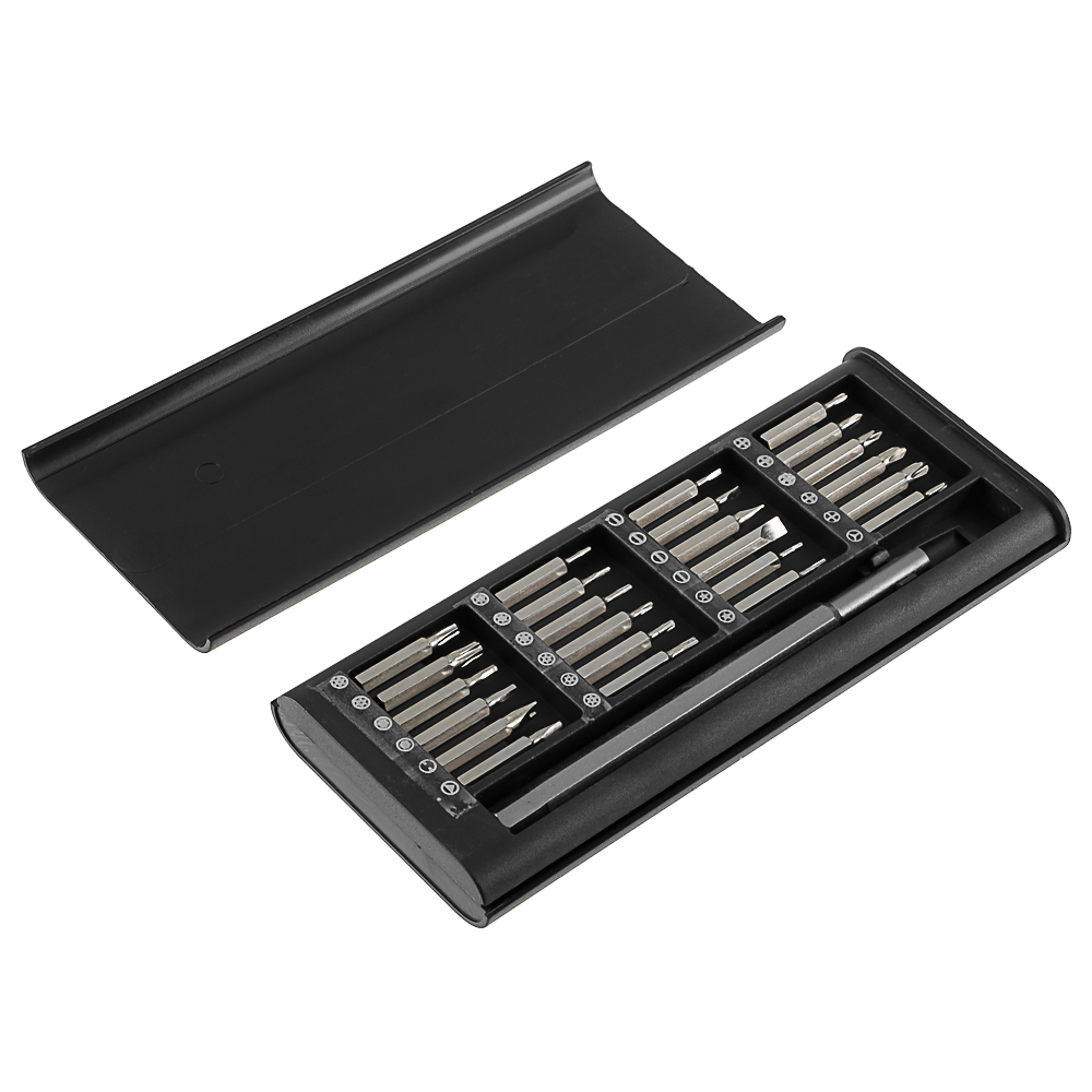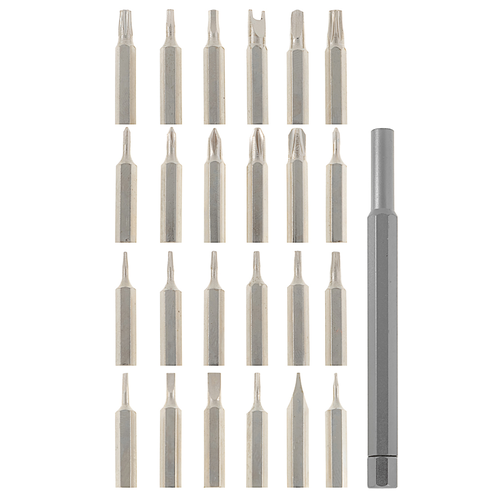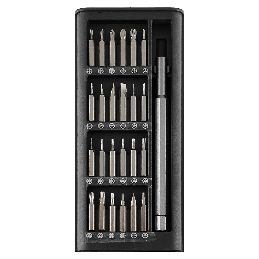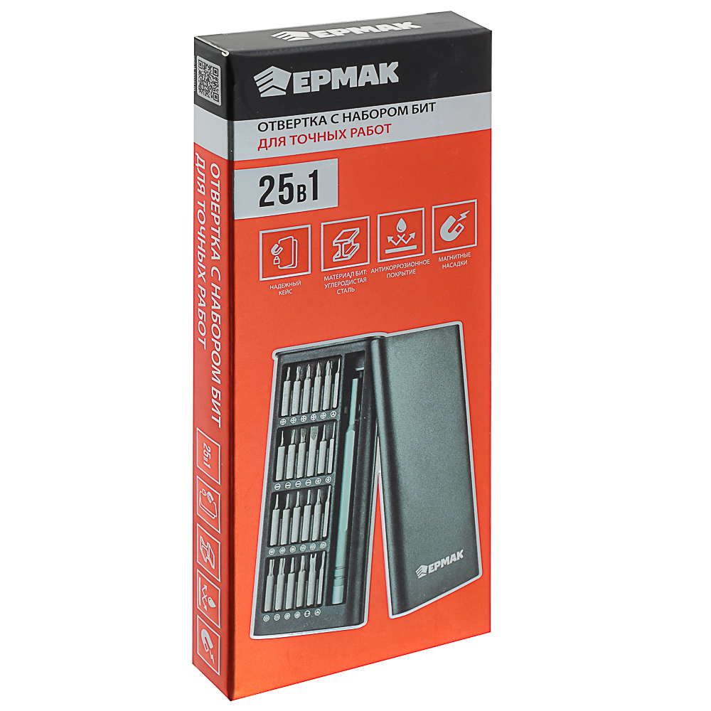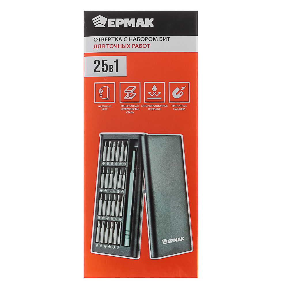 ЕРМАК Набор для точных работ 25в1 — это универсальный и компактный инструмент, созданный для выполнения широкого спектра задач. В набор входит удобная отвертка с магнитным держателем, что обеспечивает надежную фиксацию бит и упрощает работу с мелкими крепежными элементами. В комплекте также 24 сменные биты длиной 25 мм, изготовленные из прочного никелированного материала, который обеспечивает высокую износостойкость и защиту от коррозии. Все элементы набора аккуратно хранятся в пластиковом кейсе, который обеспечивает удобство переноски и хранения. Этот набор идеально подходит для точных работ, таких как сборка мебели, ремонт электроники, бытовой техники и других задач, требующих аккуратности и надежности.