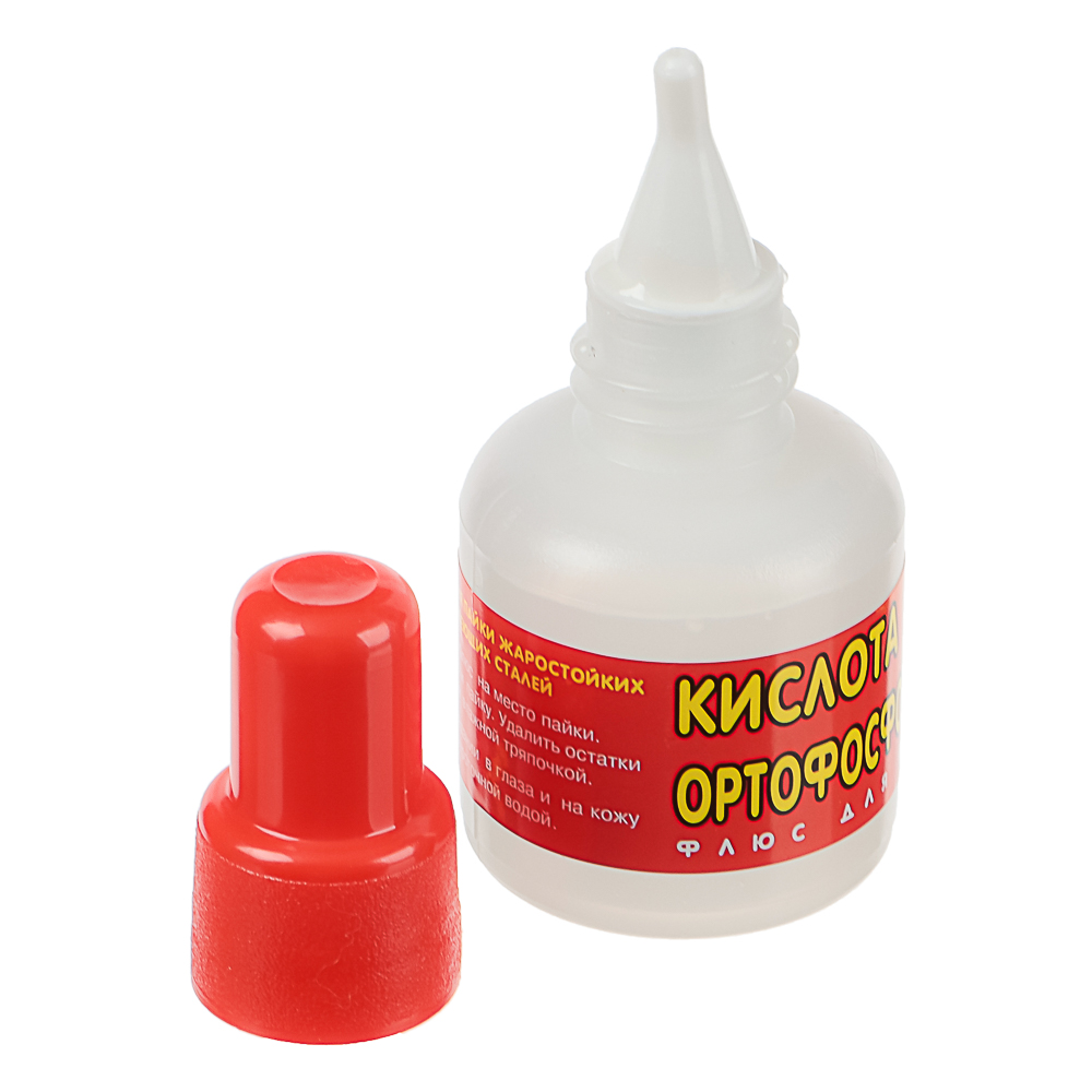 Кислота ортофосфорная (флюс для пайки) в удобном флаконе объемом 25 мл – это специализированное средство для пайки жаростойких и нержавеющих сталей, обеспечивающее высокое качество соединений. Ортофосфорная кислота эффективно удаляет оксидные пленки и загрязнения с поверхностей, что особенно важно при работе с трудносплавляемыми материалами. Она создает идеальные условия для сцепления припоя с металлом, обеспечивая прочные и долговечные соединения даже в условиях высоких температур. Компактный флакон с удобным носиком позволяет точно дозировать средство, что делает процесс пайки более аккуратным и экономичным.