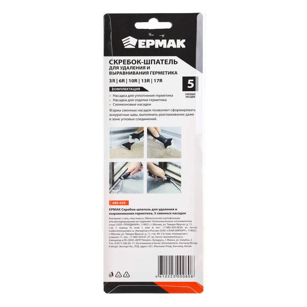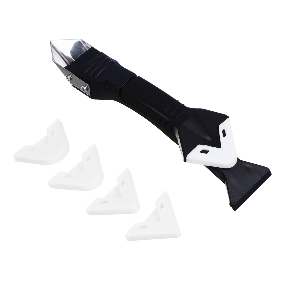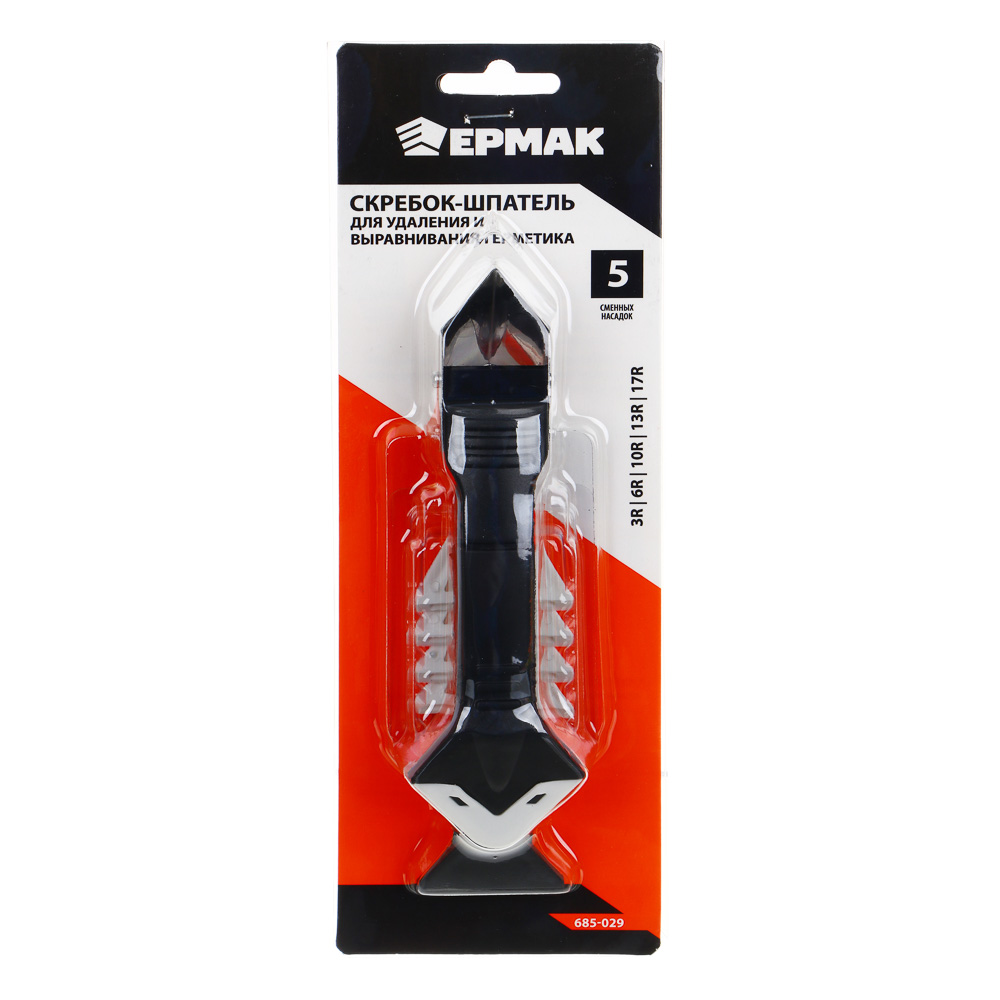 Скребок-шпатель ЕРМАК с пятью сменными насадками различных радиусов предназначены для ремонта и строительства. Многофункциональный ручной инструмент используется для выравнивания, формирования углов и удаления излишков герметика при отделочных или ремонтных работах. Угловой нож отлично справится с удалением силиконового герметика, клея или шпаклевки в угловых соединениях, швах плитки или пластиковых окон. Лезвие имеет специальную форму, которая позволяет убирать герметик, двигая его в двух направлениях. Набор инструментов для дома отлично обработает стыки душевой кабины, ванны, раковины и унитаза.