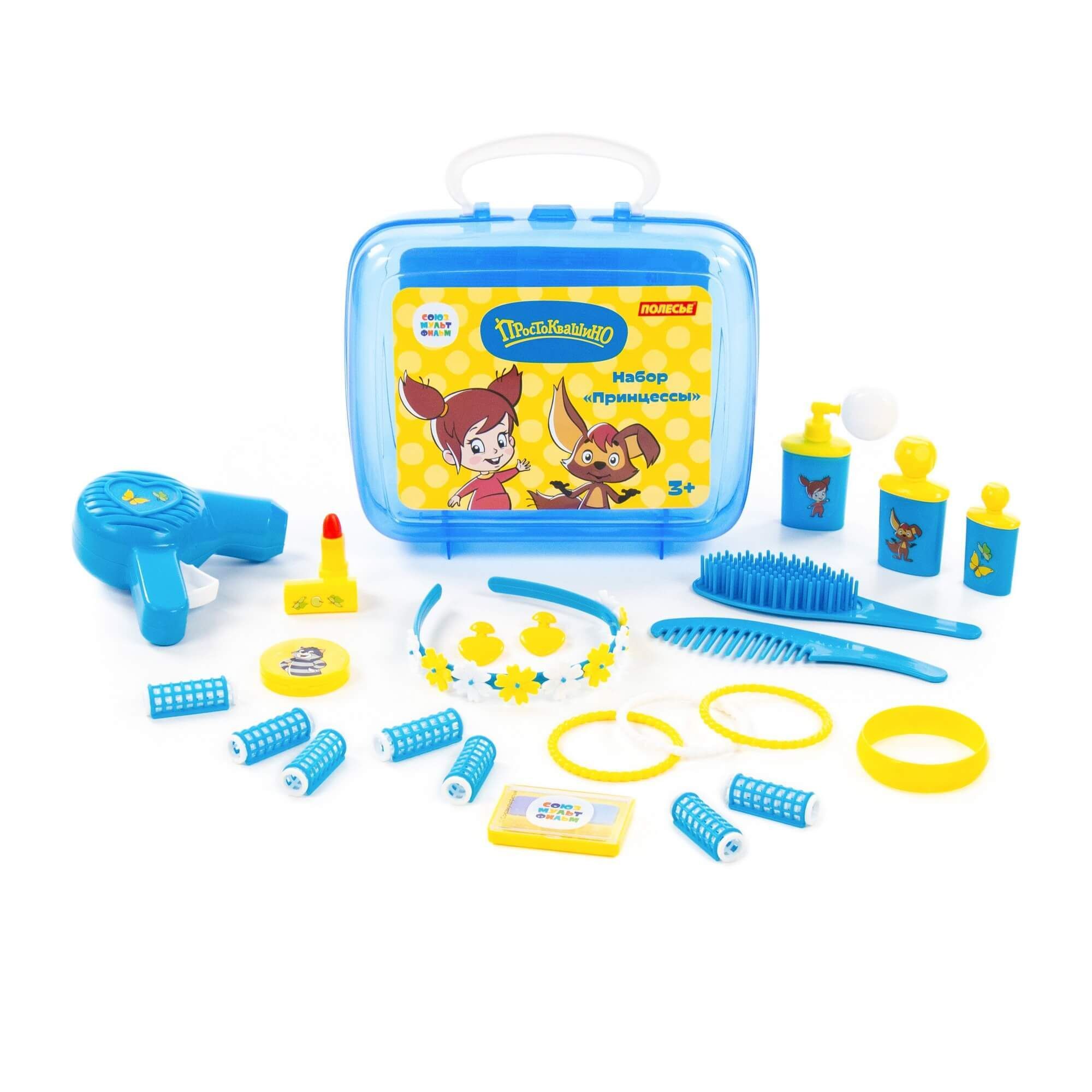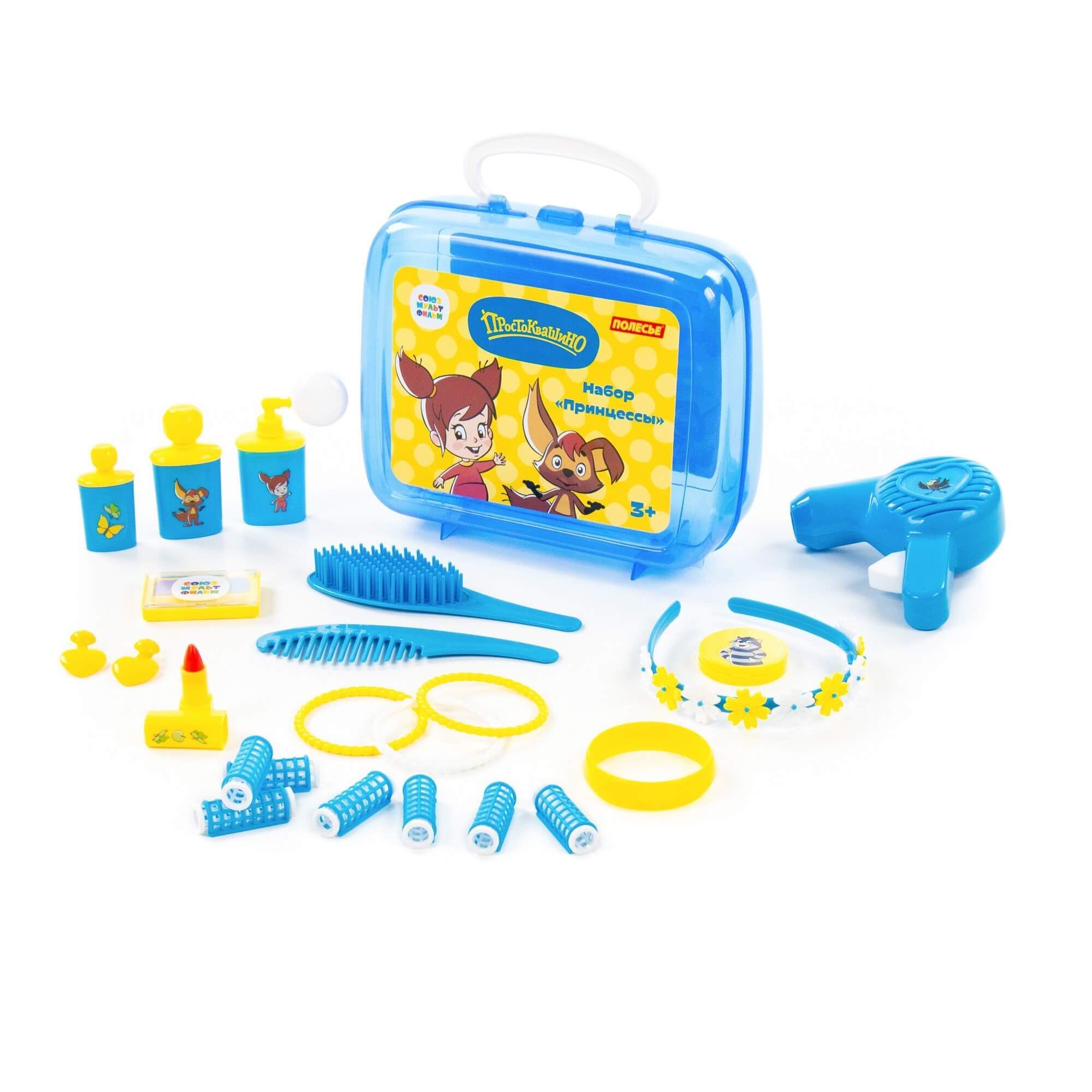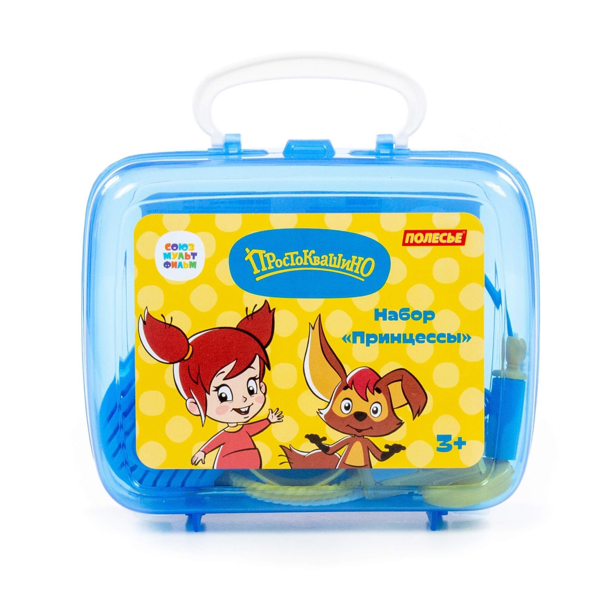 Устроить салон красоты даже на прогулке позволит игровой набор принцессы «Простоквашино» от компании «Полесье». Он компактный, его всегда удобно брать с собой в гости, в путешествие... Набор выполнен в яркой цветовой гамме, украшен наклейками с изображением персонажей известного мультсериала производства киностудии «Союзмультфильм» (герои новых серий мультфильма «Простоквашино»!). С игровым набором девочка научится следить за собой, наряжаться, фантазировать и делать причёски. Все аксессуары для маленькой принцессы упакованы в красочный чемоданчик, в котором их удобно хранить и перемещать. В набор входят: