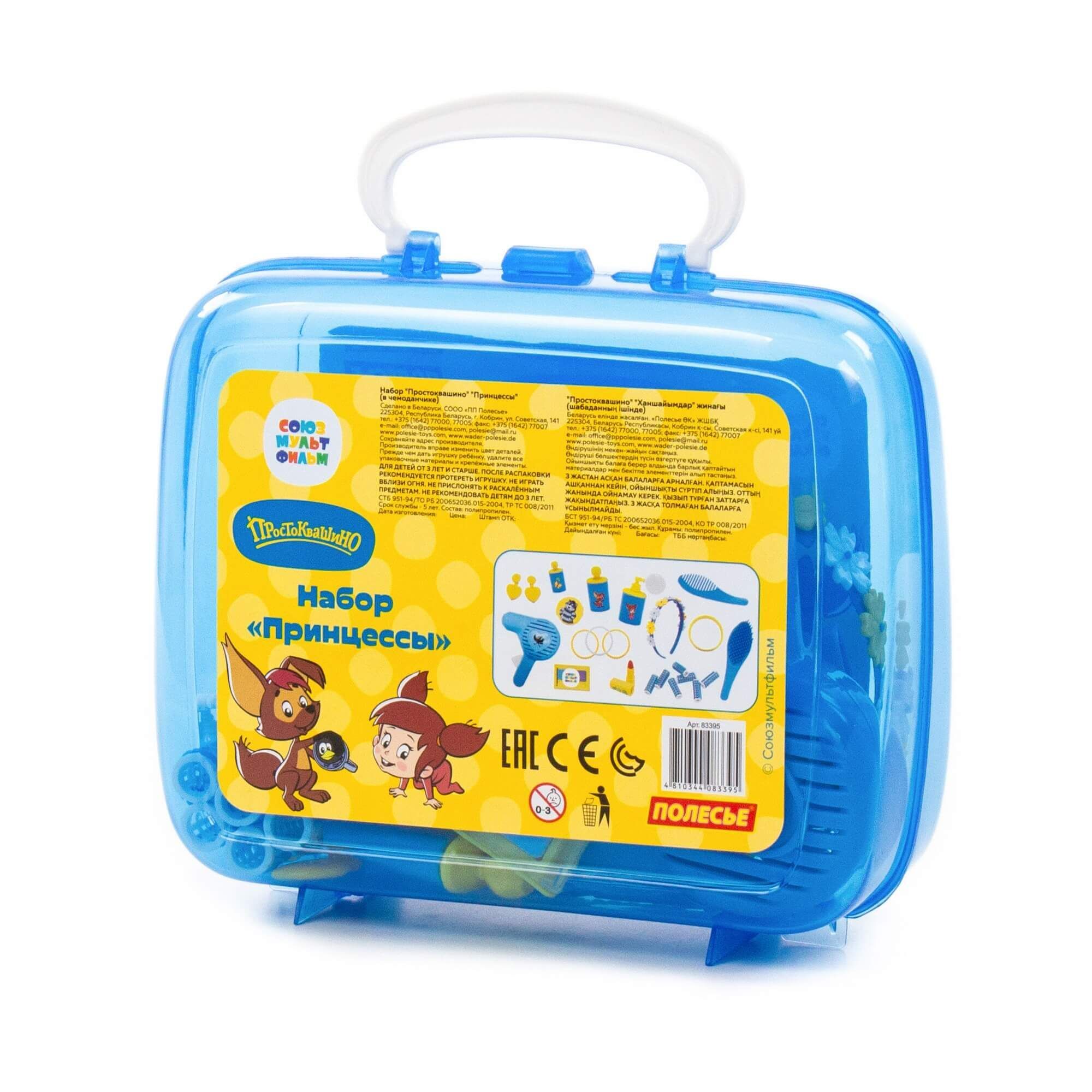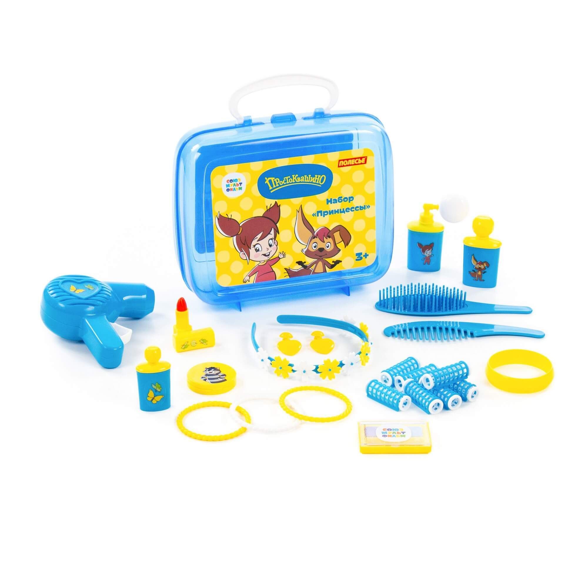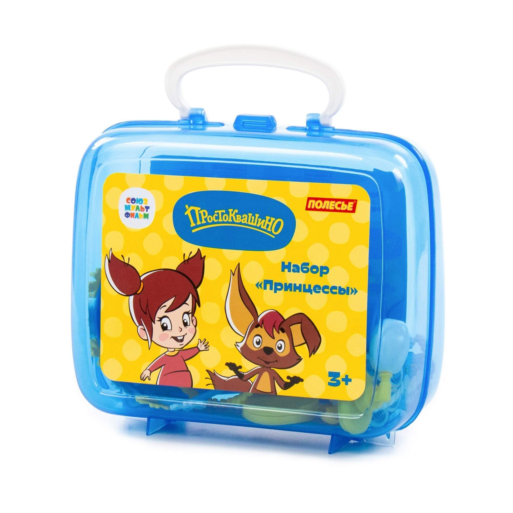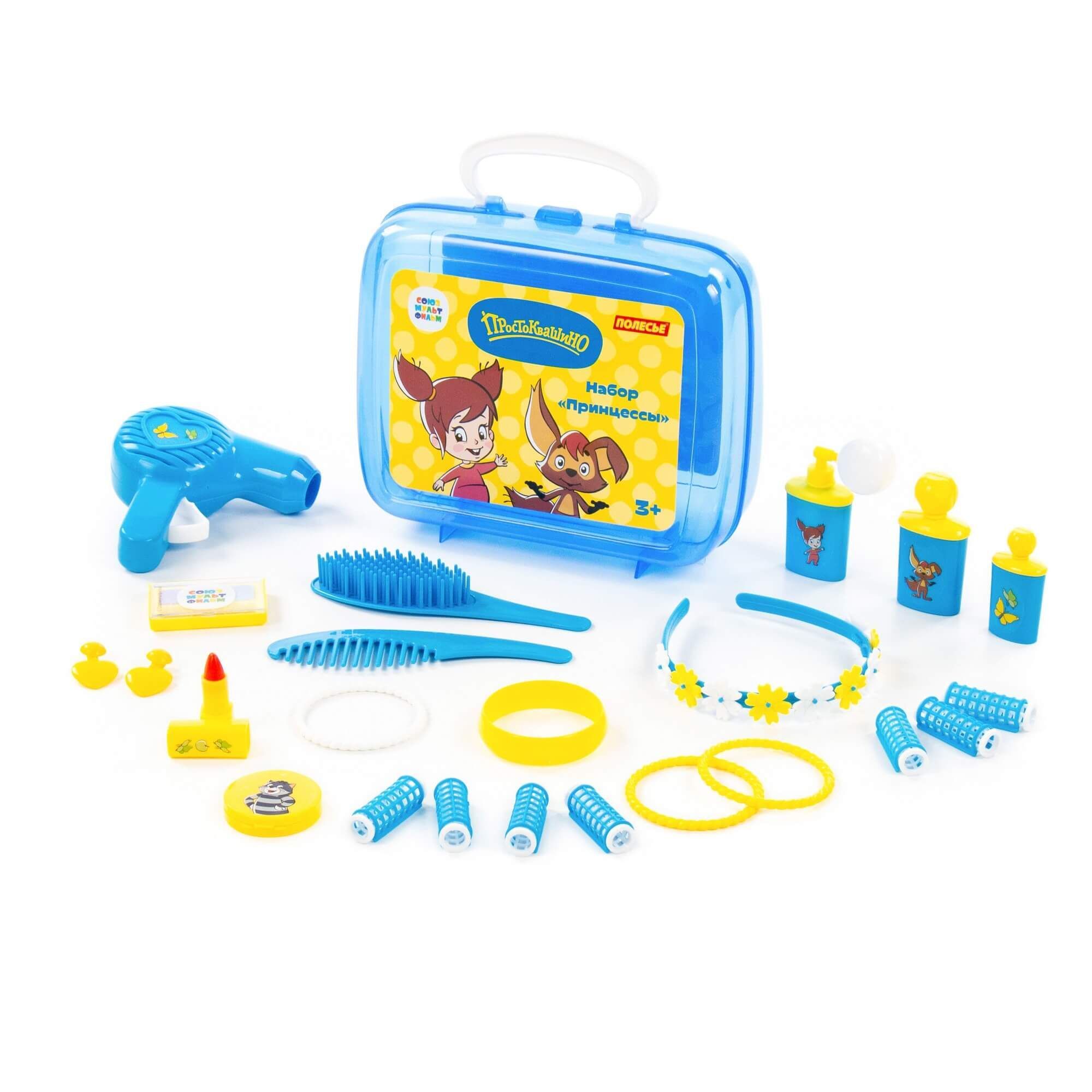 Устроить салон красоты даже на прогулке позволит игровой набор принцессы «Простоквашино» от компании «Полесье». Он компактный, его всегда удобно брать с собой в гости, в путешествие... Набор выполнен в яркой цветовой гамме, украшен наклейками с изображением персонажей известного мультсериала производства киностудии «Союзмультфильм» (герои новых серий мультфильма «Простоквашино»!). С игровым набором девочка научится следить за собой, наряжаться, фантазировать и делать причёски. Все аксессуары для маленькой принцессы упакованы в красочный чемоданчик, в котором их удобно хранить и перемещать. В набор входят:
