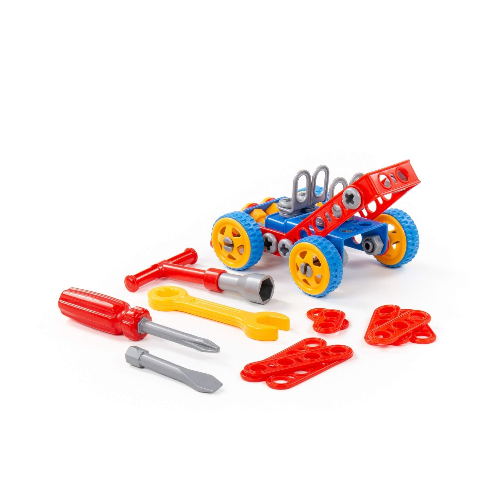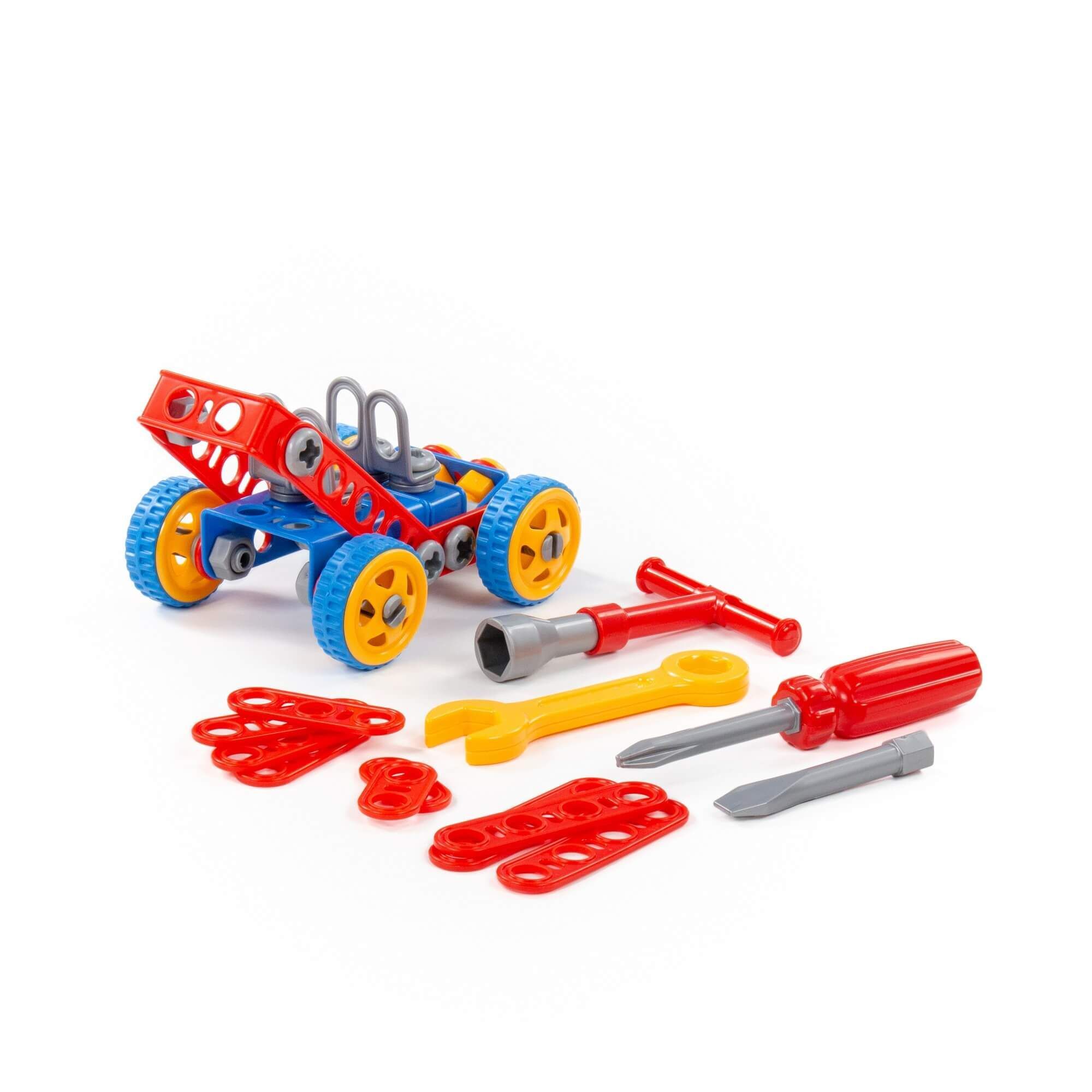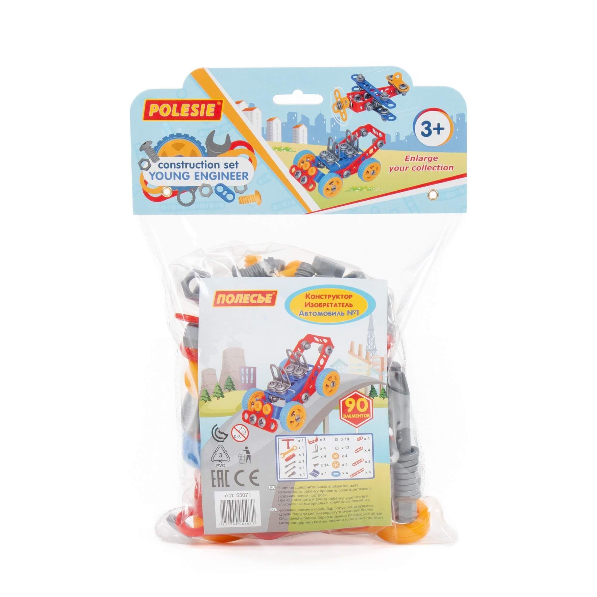 Конструктор «Изобретатель» — «Автомобиль № 1» (90 элементов) от фабрики «Полесье» отличается особым функционалом. Элементы выполнены в виде планок, пазы которых соединяются при помощи болтов и гаек. В комплект конструктора входят подробные инструкции, следуя которым можно собрать модели, представленные на упаковке игрушки. При этом ребёнок будет развивать усидчивость и внимание. Игра с данной серией конструкторов не ограничивается сборкой моделей по инструкции, дети всегда могут попробовать создать что-то новое, используя свою фантазию, пространственное и ассоциативное мышление. Игры с конструктором могут определить будущую профессию малыша, раскрыв в нём творческий потенциал. Все конструкторы серии «Изобретатель» совершенно разные, поэтому из них можно собрать целую коллекцию, которая превратится в творческую мастерскую Вашего ребёнка!