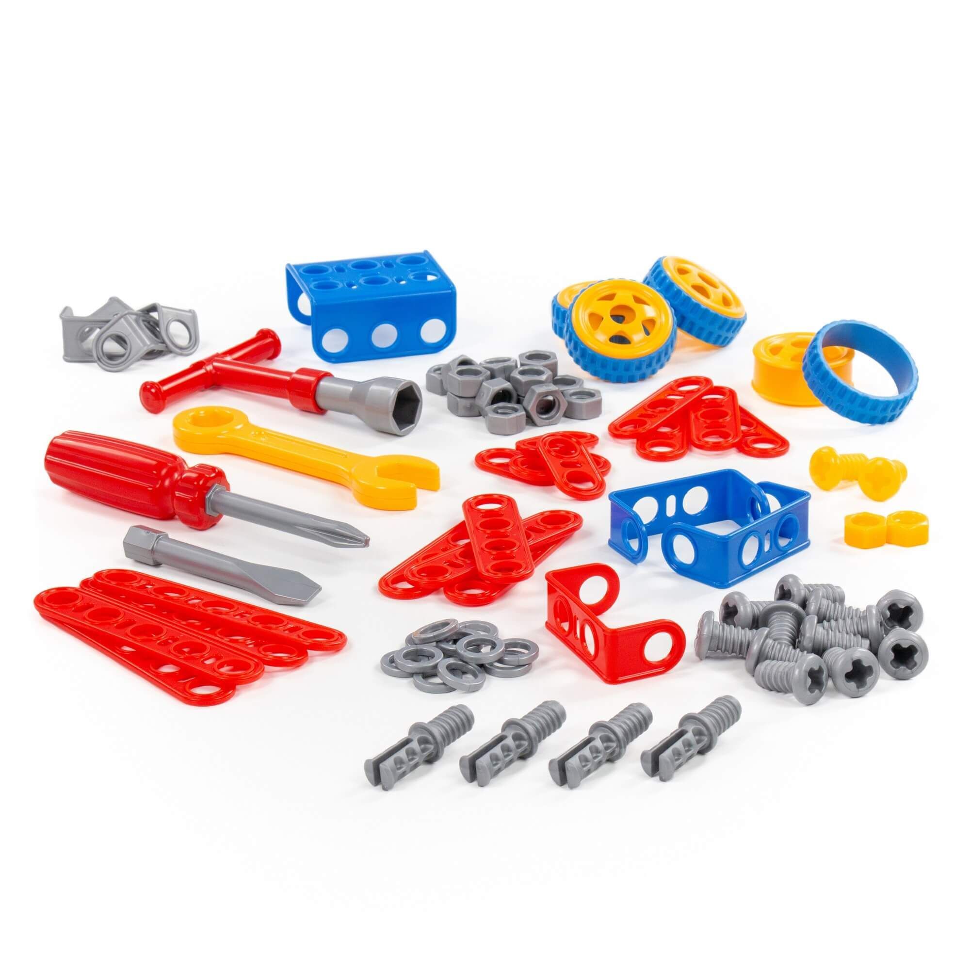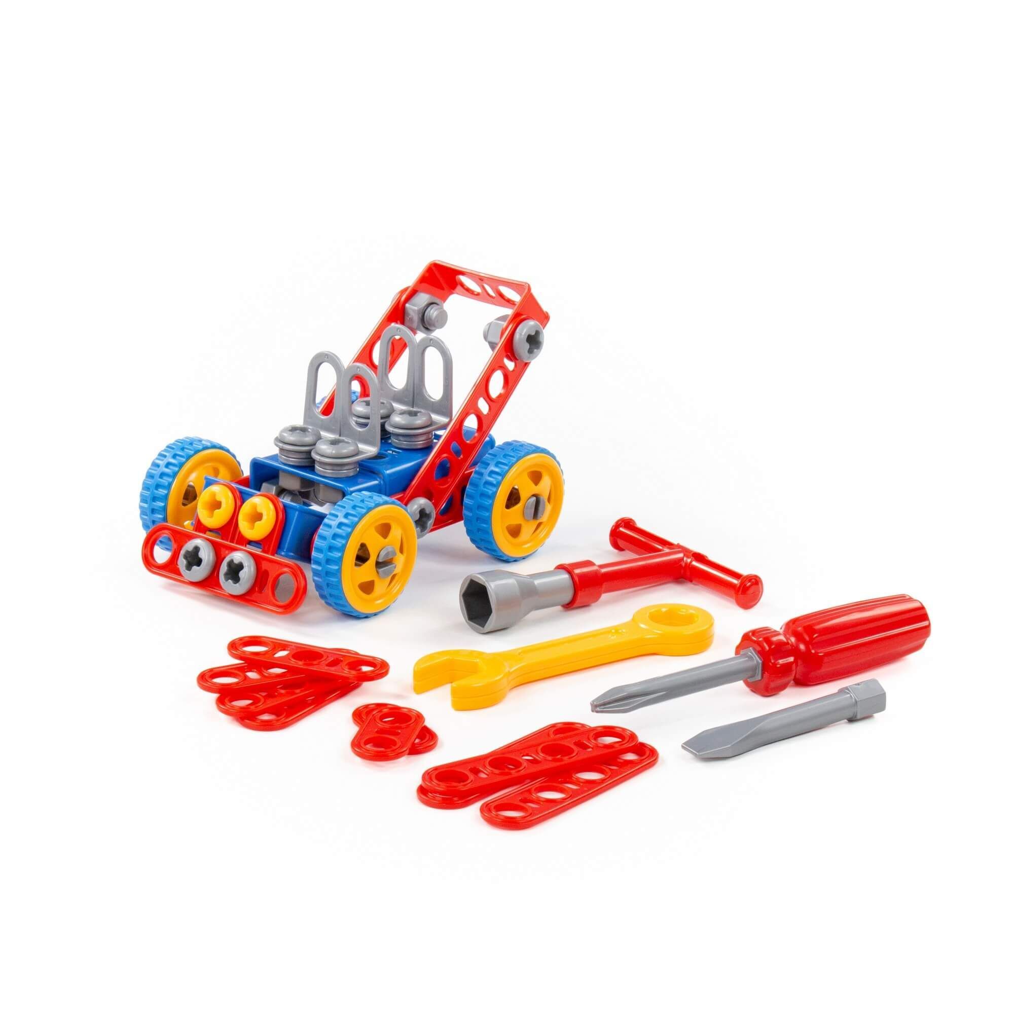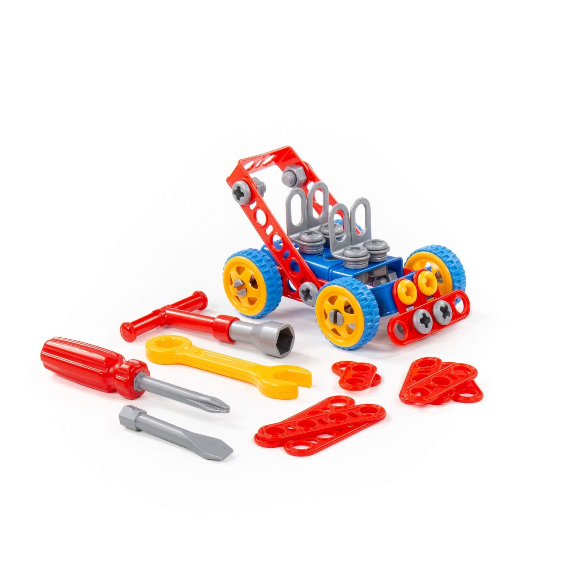 Конструктор «Изобретатель» — «Автомобиль № 1» (90 элементов) от фабрики «Полесье» отличается особым функционалом. Элементы выполнены в виде планок, пазы которых соединяются при помощи болтов и гаек. В комплект конструктора входят подробные инструкции, следуя которым можно собрать модели, представленные на упаковке игрушки. При этом ребёнок будет развивать усидчивость и внимание. Игра с данной серией конструкторов не ограничивается сборкой моделей по инструкции, дети всегда могут попробовать создать что-то новое, используя свою фантазию, пространственное и ассоциативное мышление. Игры с конструктором могут определить будущую профессию малыша, раскрыв в нём творческий потенциал. Все конструкторы серии «Изобретатель» совершенно разные, поэтому из них можно собрать целую коллекцию, которая превратится в творческую мастерскую Вашего ребёнка!