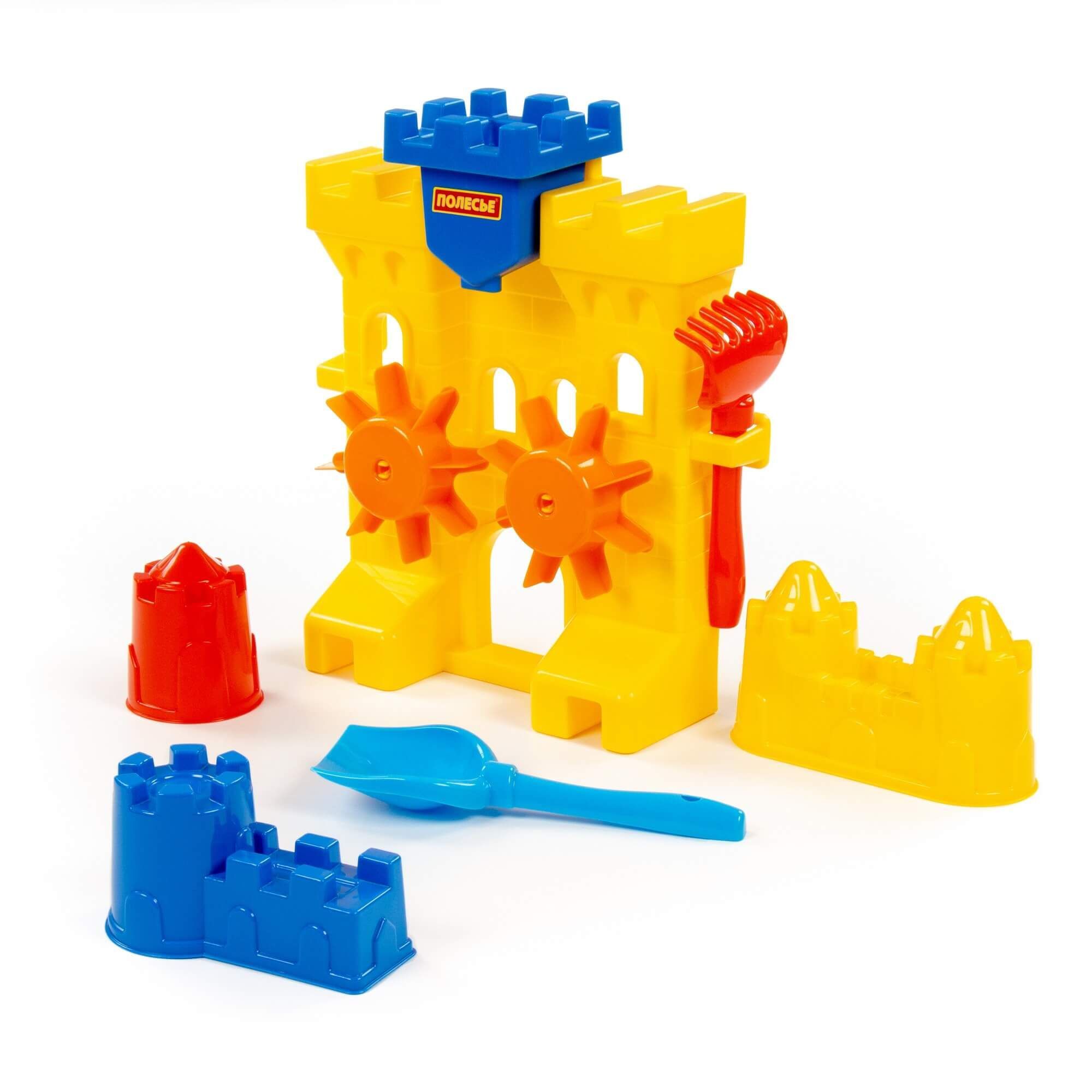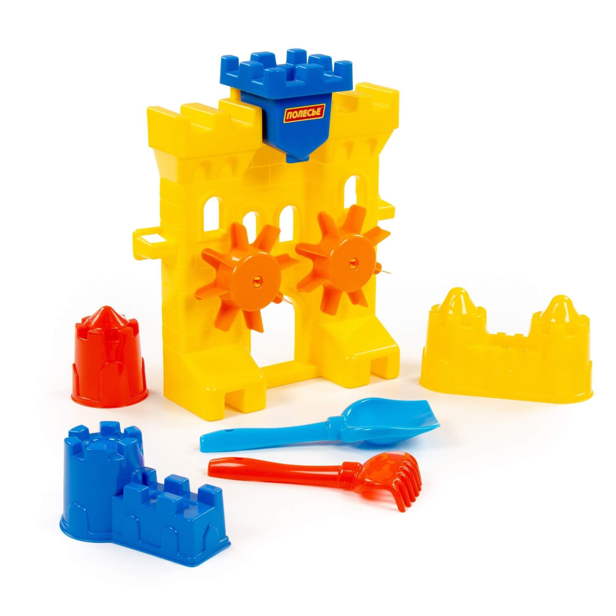 Песочная мельница "Крепость", лопатка №5, грабельки №5, формочки (замок мост + замок башня + замок стена с двумя башнями)