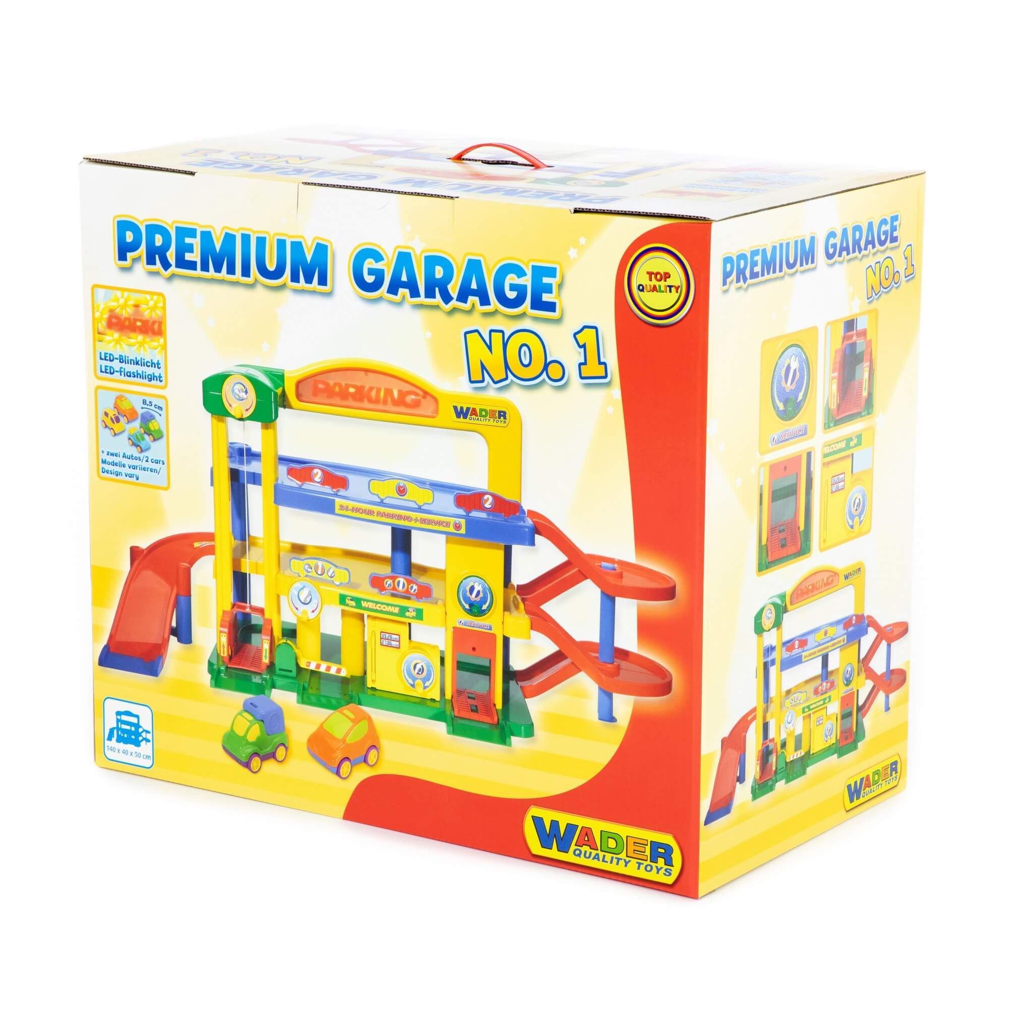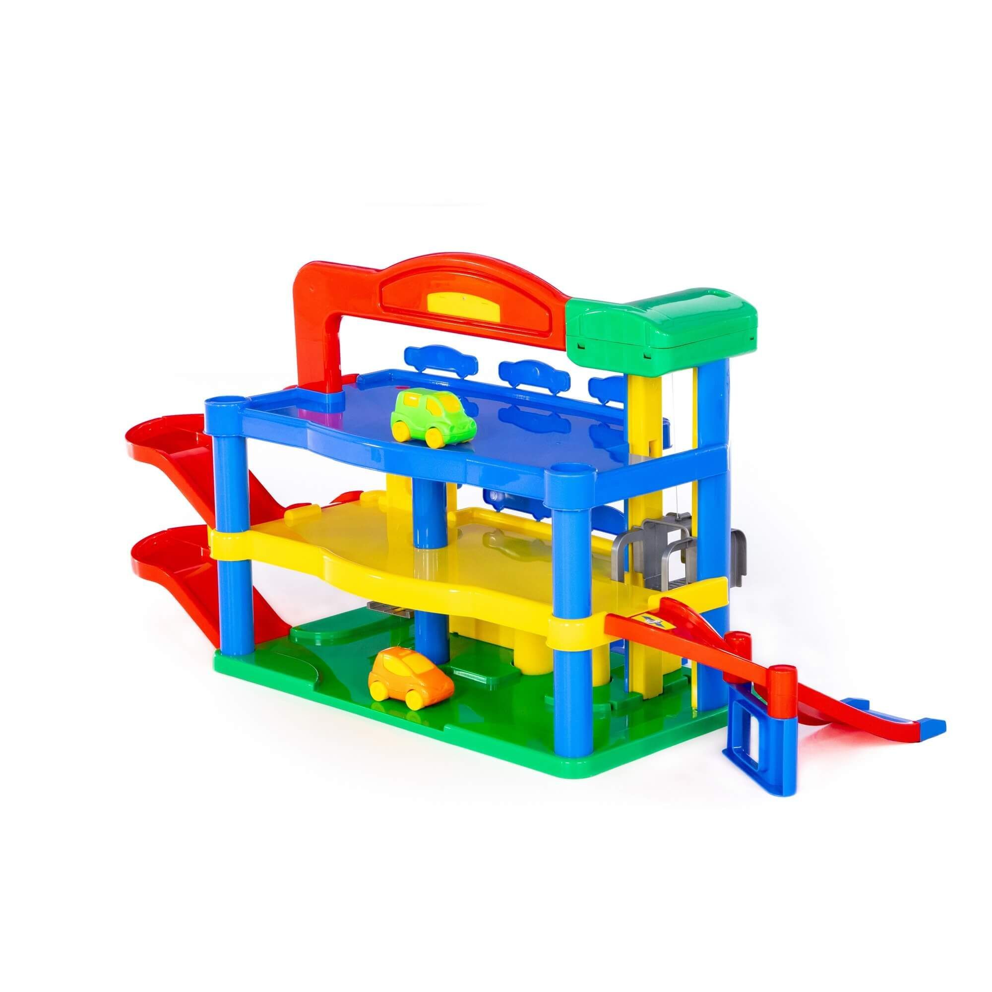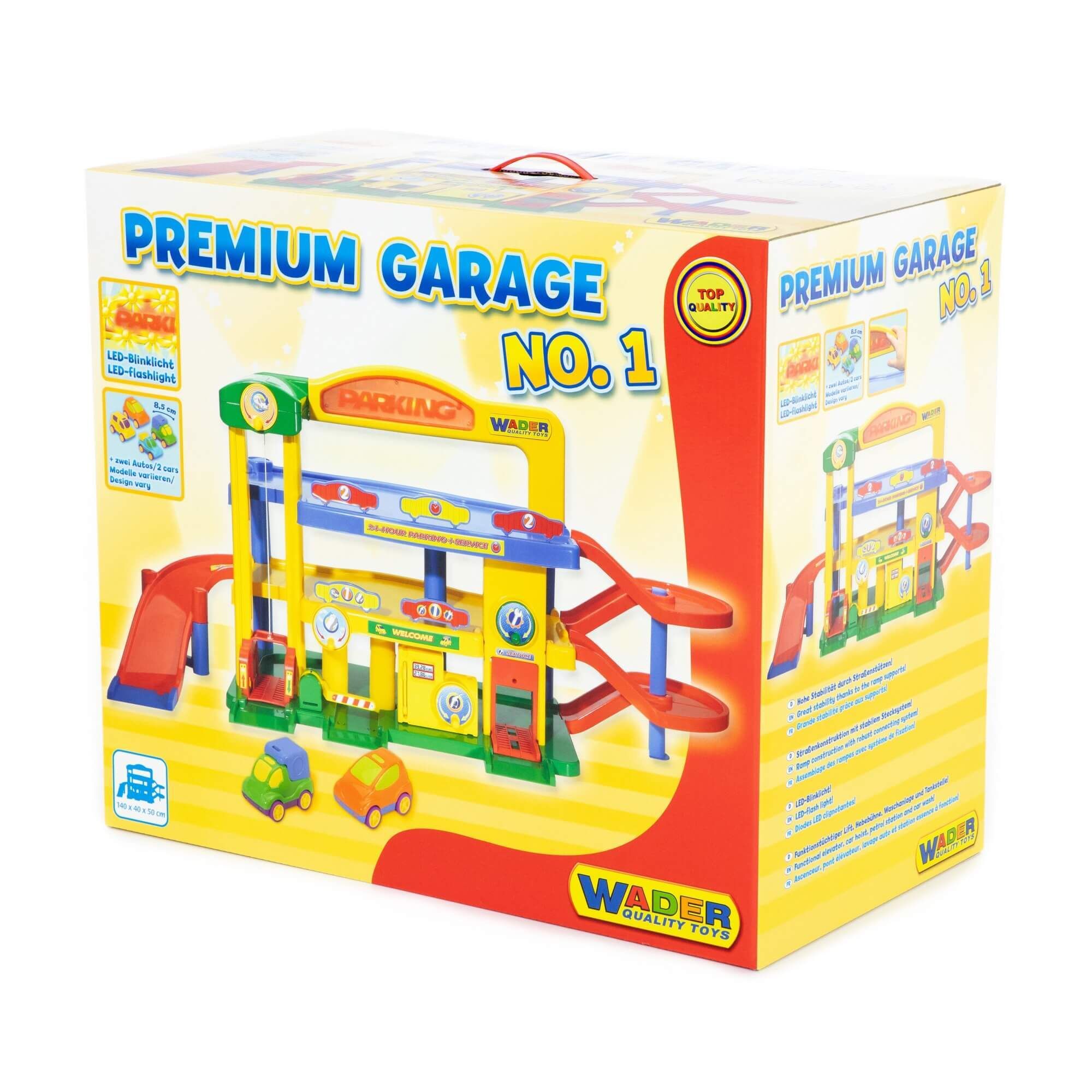 Гараж представляет собой трехуровневую парковку для входящих в набор автомобилей (2 шт.). Вывеска гаража "PARKING" с подсветкой. На первом уровне паркинга находятся заправочная станция, автомастерская (подъемник), автомойка. На второй и третий уровень автомобили могут попасть на лифте, а спуститься по съездам. Все указанные игровые элементы приводятся в движение с помощью ручного привода, то есть для игры ребенку нужно повернуть рукоятку возле подвижного элемента.