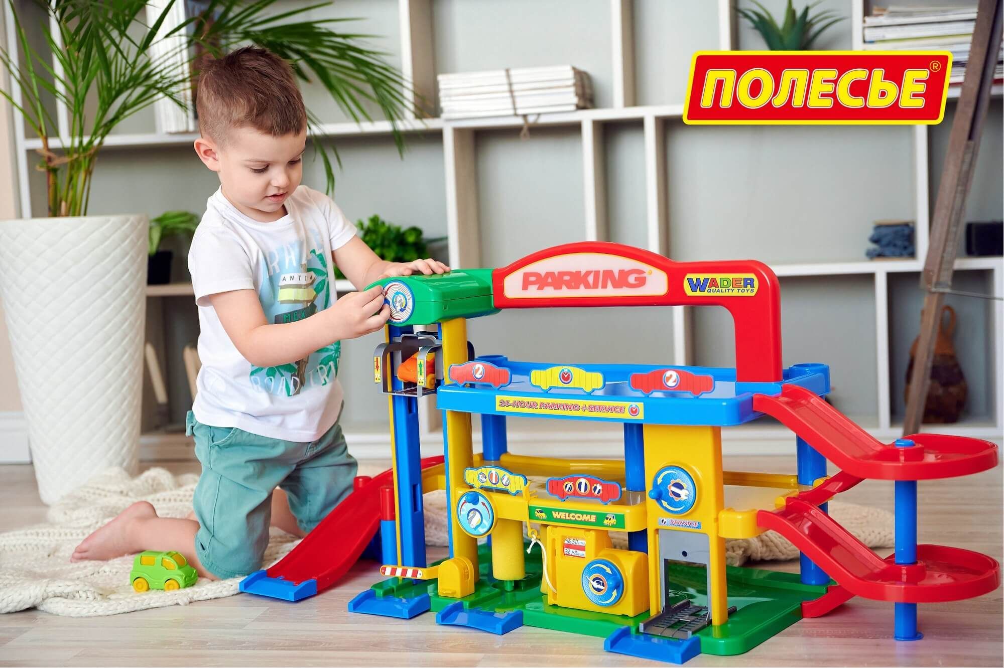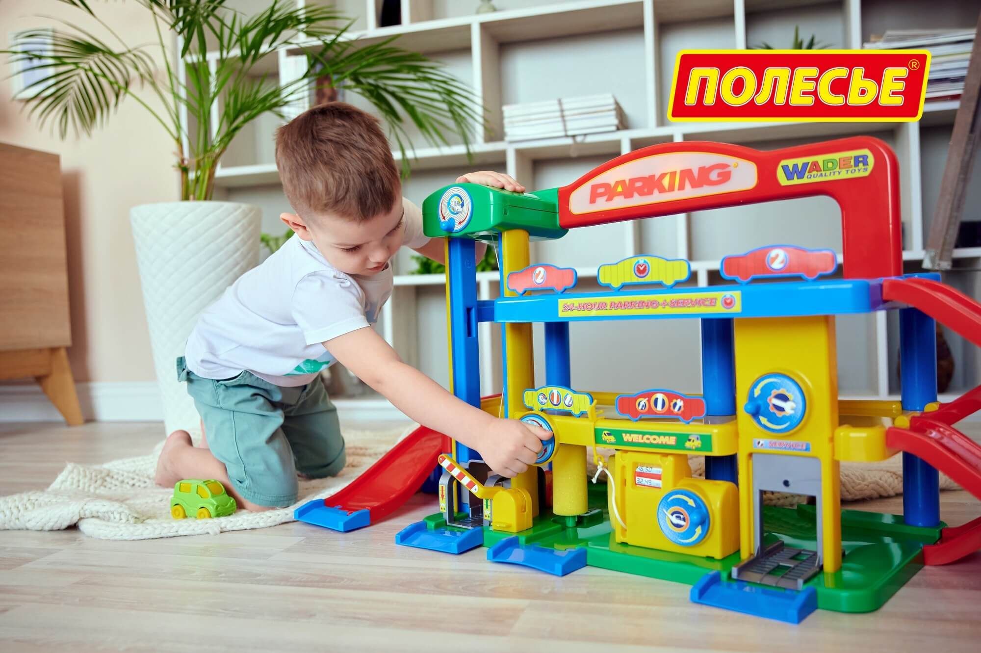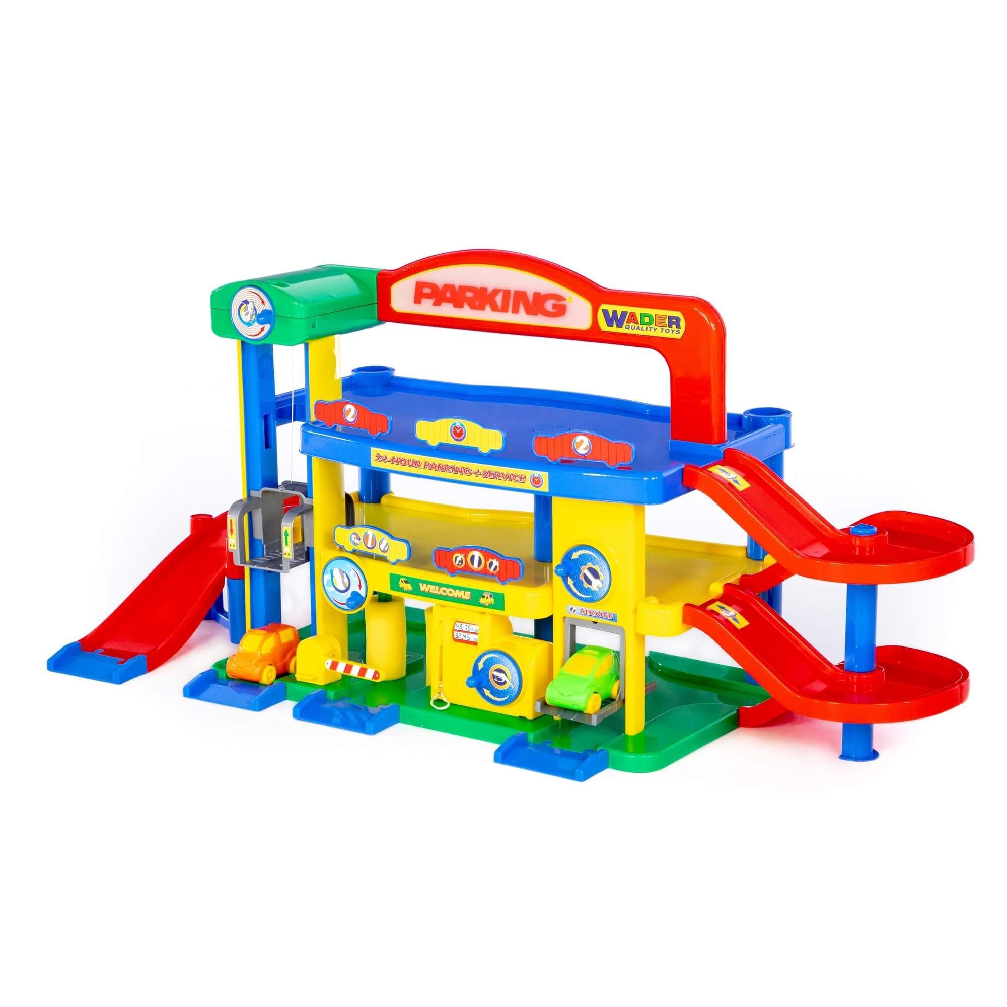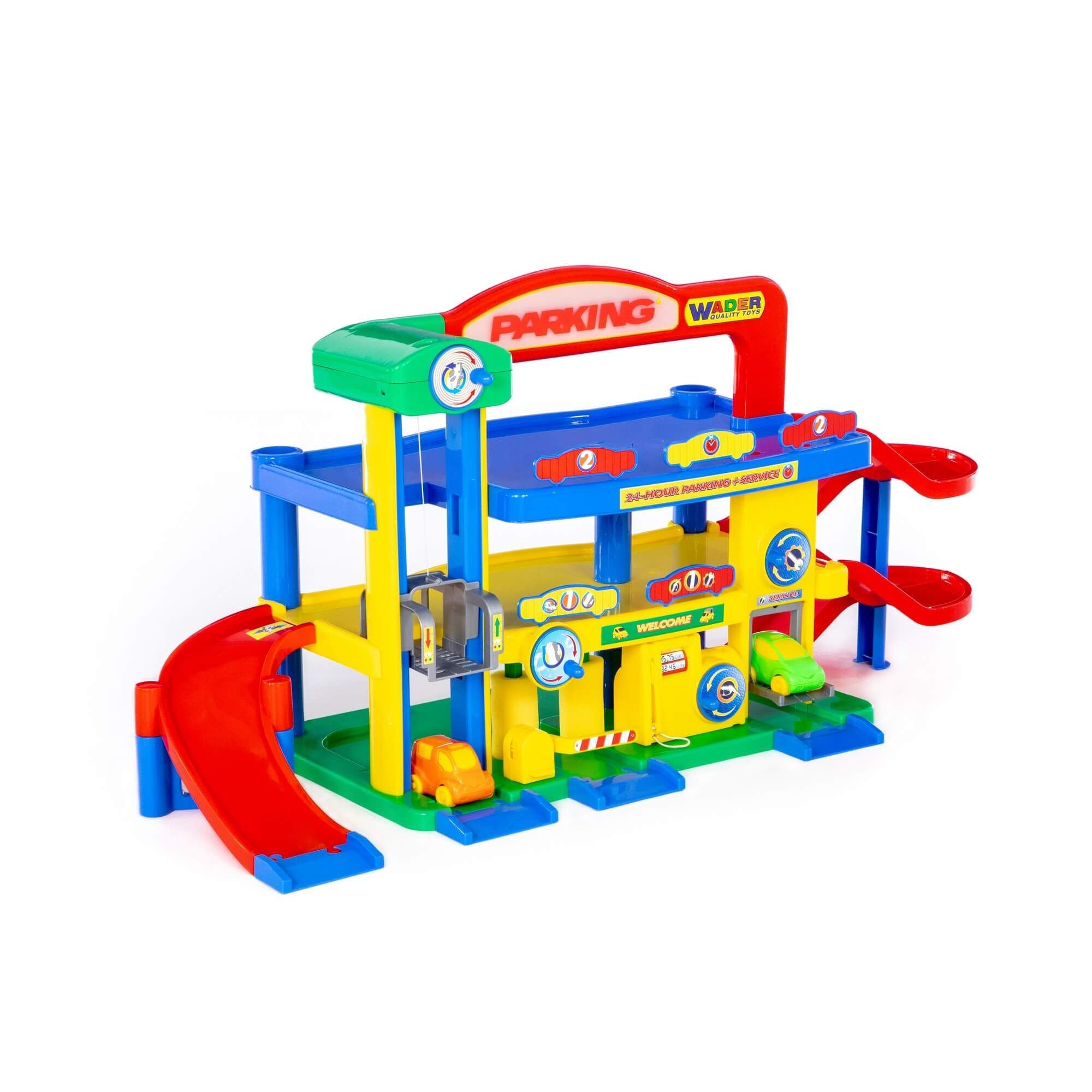 Гараж представляет собой трехуровневую парковку для входящих в набор автомобилей (2 шт.). Вывеска гаража "PARKING" с подсветкой. На первом уровне паркинга находятся заправочная станция, автомастерская (подъемник), автомойка. На второй и третий уровень автомобили могут попасть на лифте, а спуститься по съездам. Все указанные игровые элементы приводятся в движение с помощью ручного привода, то есть для игры ребенку нужно повернуть рукоятку возле подвижного элемента.