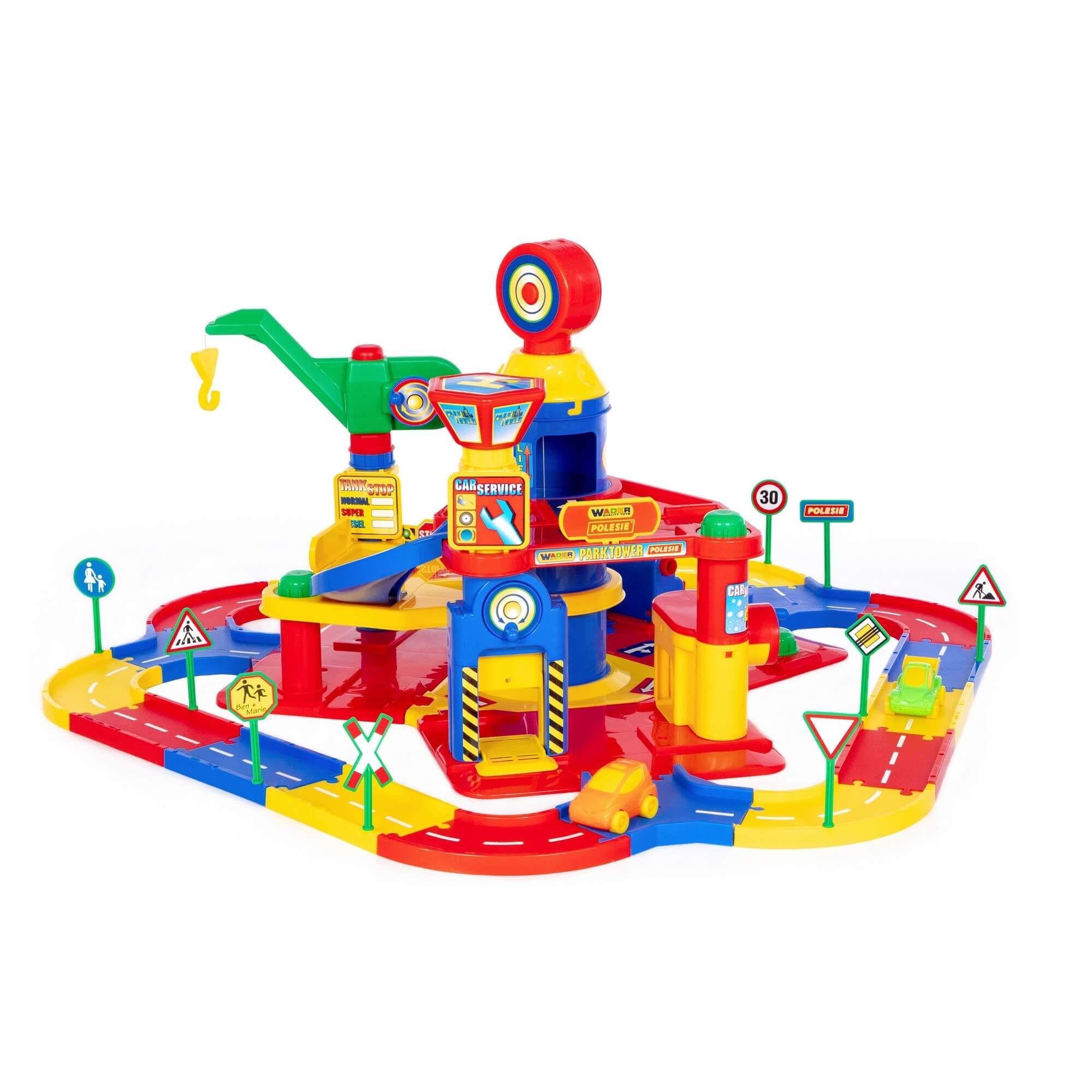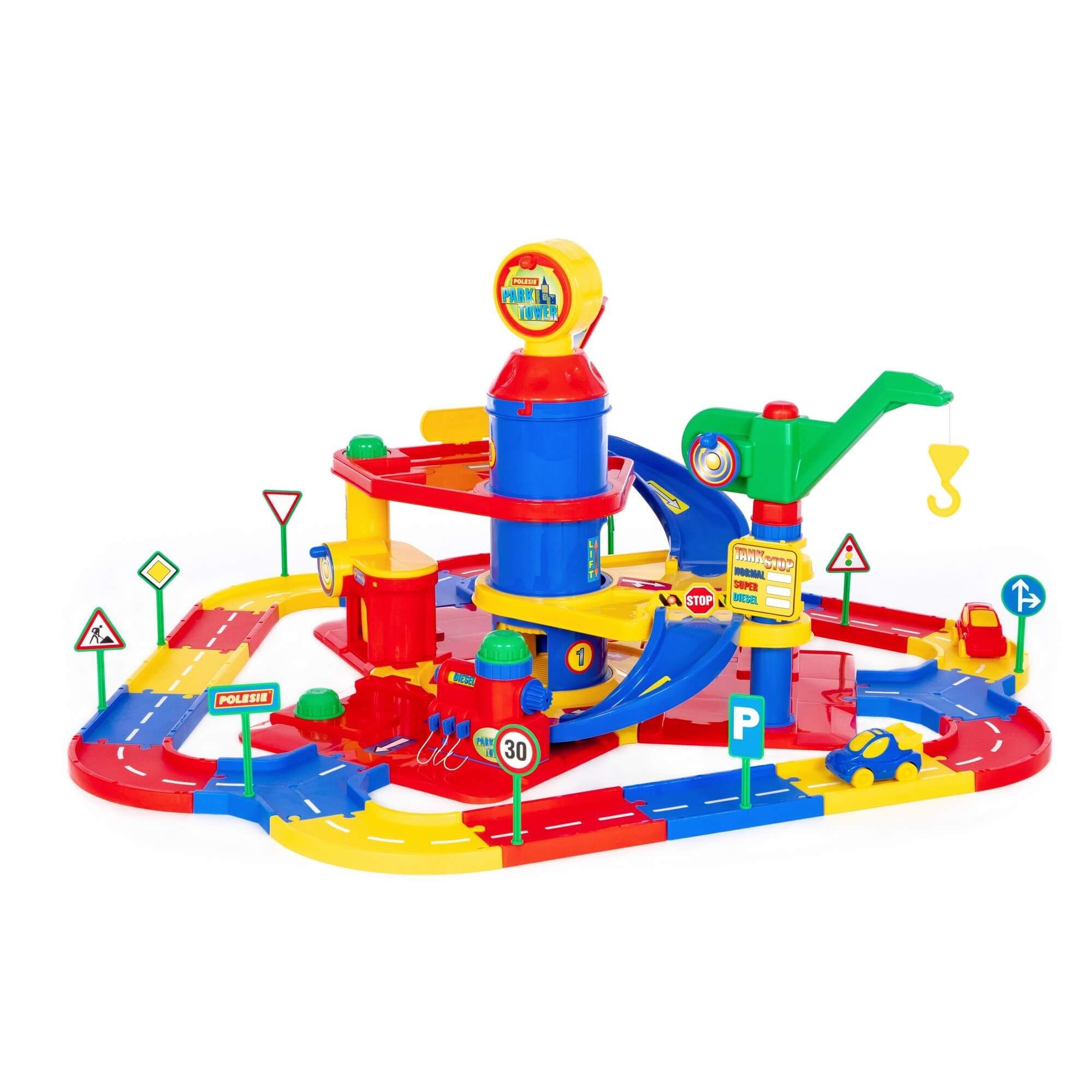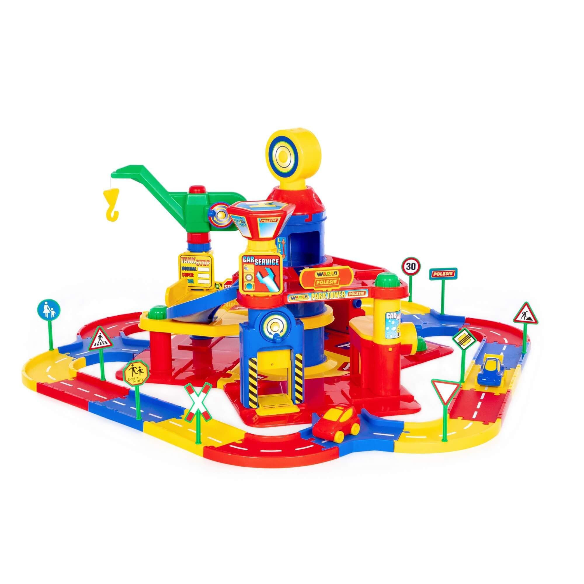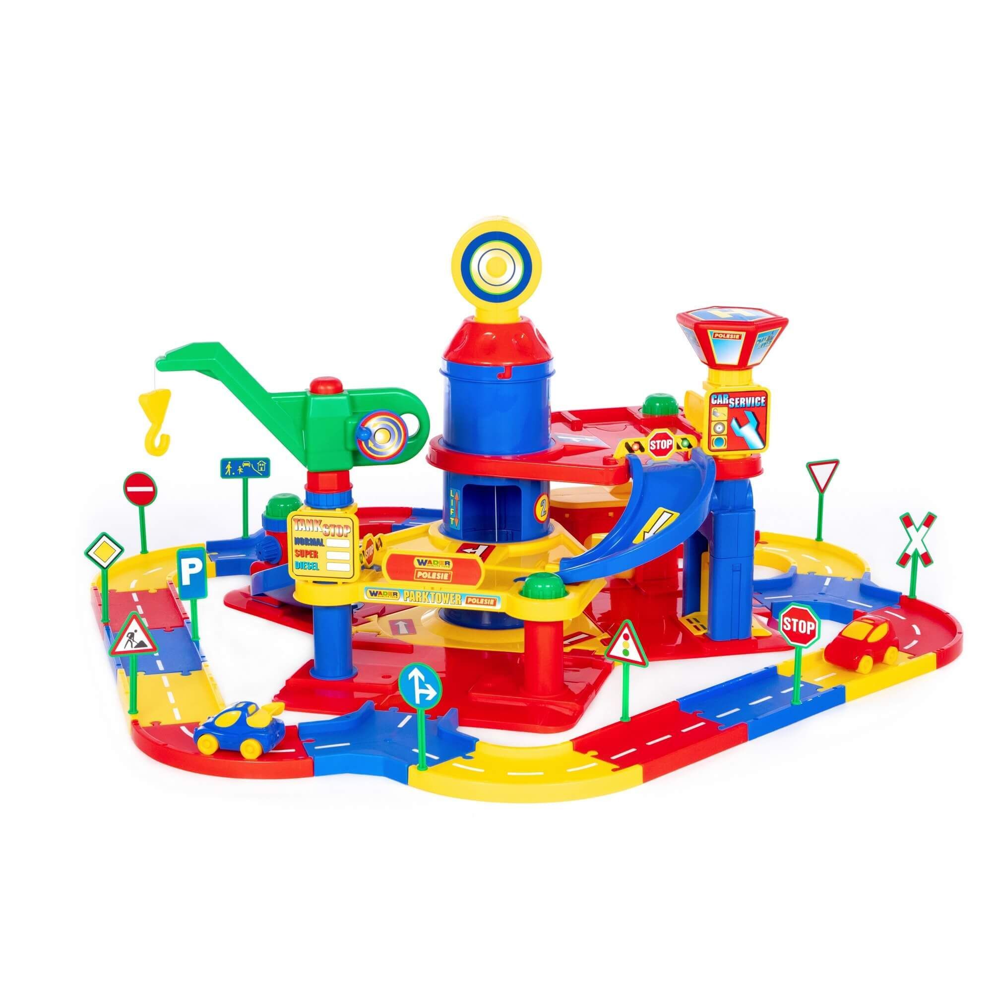 Паркинг представляет собой трехуровневую парковку, куда автомобили можно поднимать на лифте, а спускать по съездам. Машинки (2 шт.), входящие в набор, можно обслужить в игрушечном автосервисе: проверить автомобиль на подъёмнике, "помыть" на автомойке, а заправить на АЗС. Лифт, мойка и эстакада приводятся в движение при вращении рукояток, так же как и подъёмный кран. Паркинг оснащён дорогой с 10 дорожными знаками.
