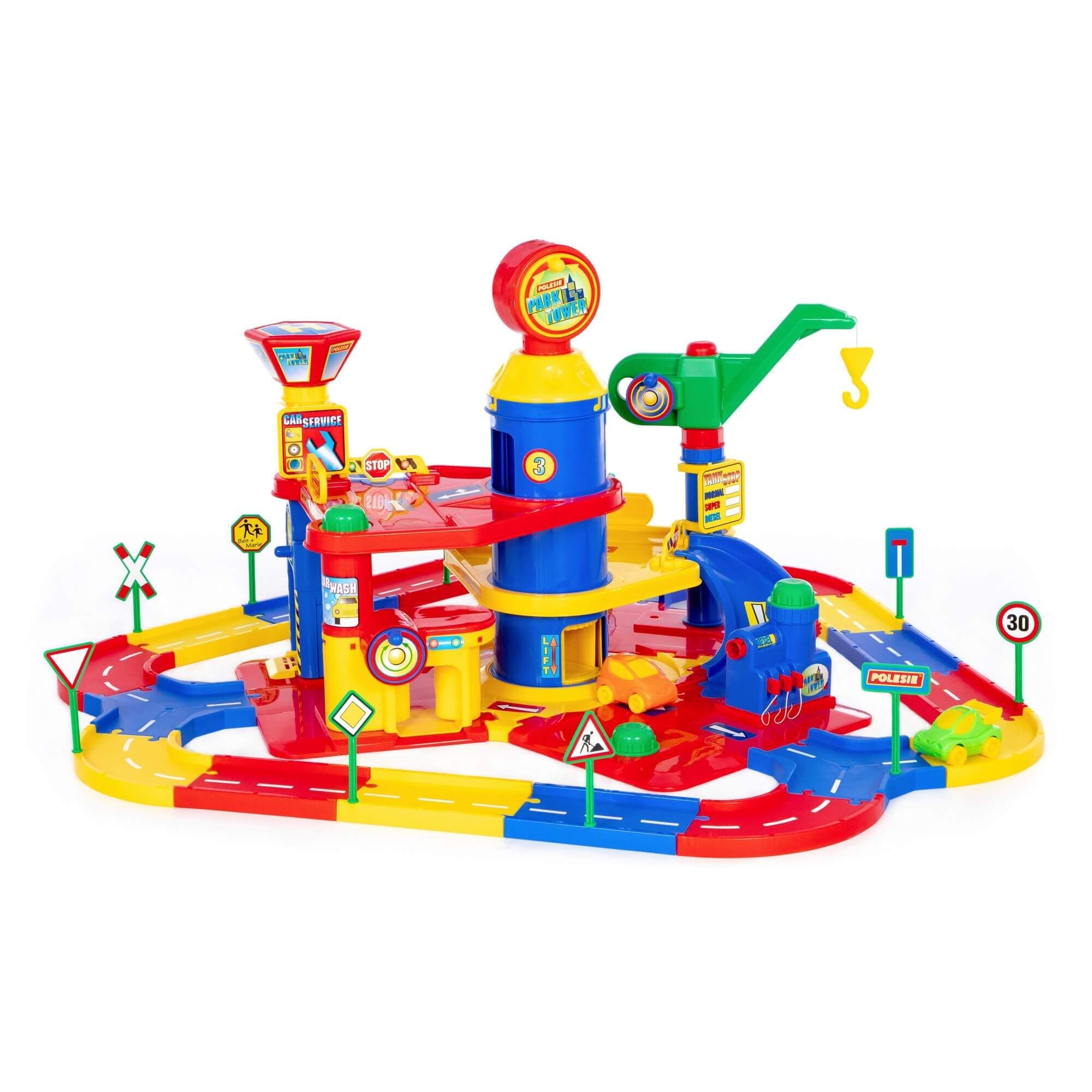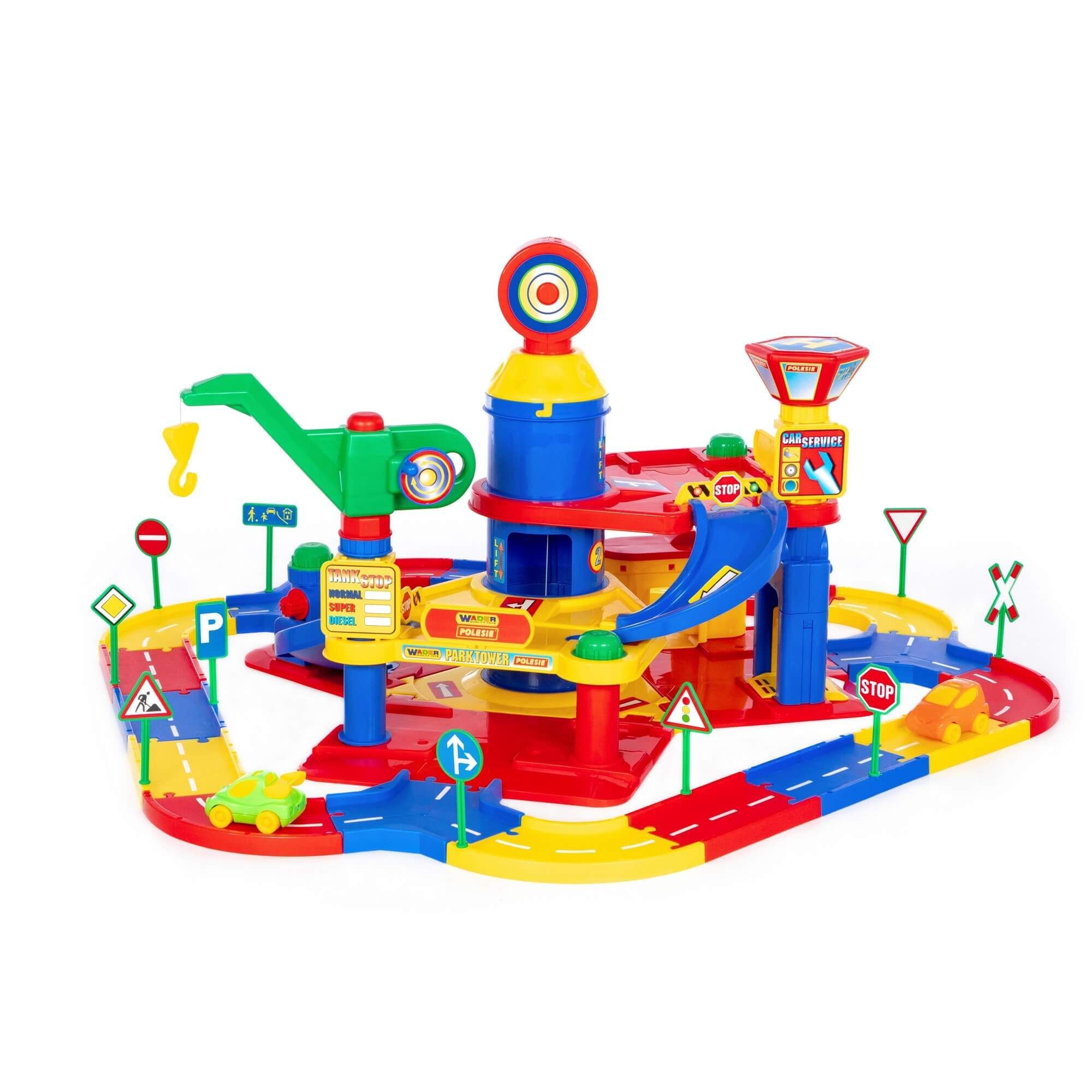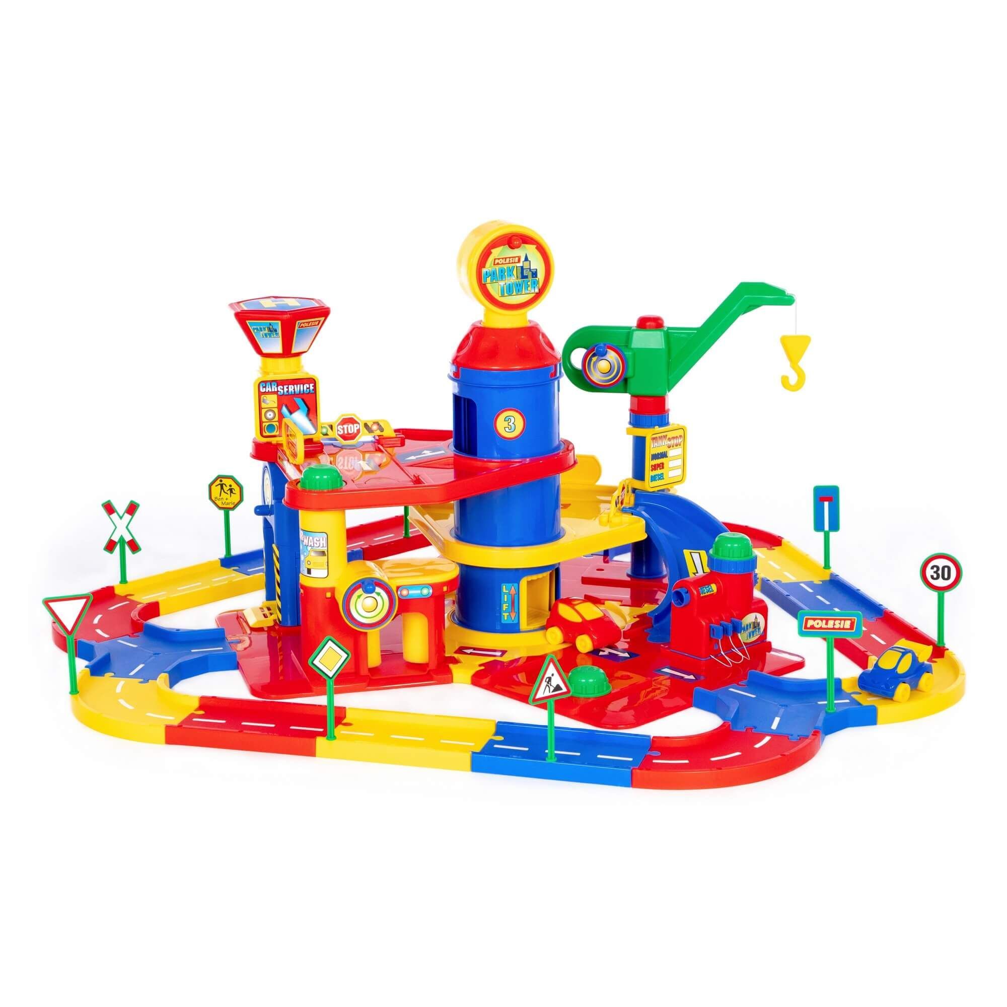 Паркинг представляет собой трехуровневую парковку, куда автомобили можно поднимать на лифте, а спускать по съездам. Машинки (2 шт.), входящие в набор, можно обслужить в игрушечном автосервисе: проверить автомобиль на подъёмнике, "помыть" на автомойке, а заправить на АЗС. Лифт, мойка и эстакада приводятся в движение при вращении рукояток, так же как и подъёмный кран. Паркинг оснащён дорогой с 10 дорожными знаками.