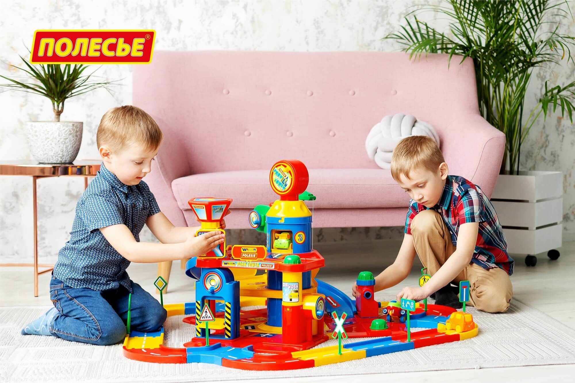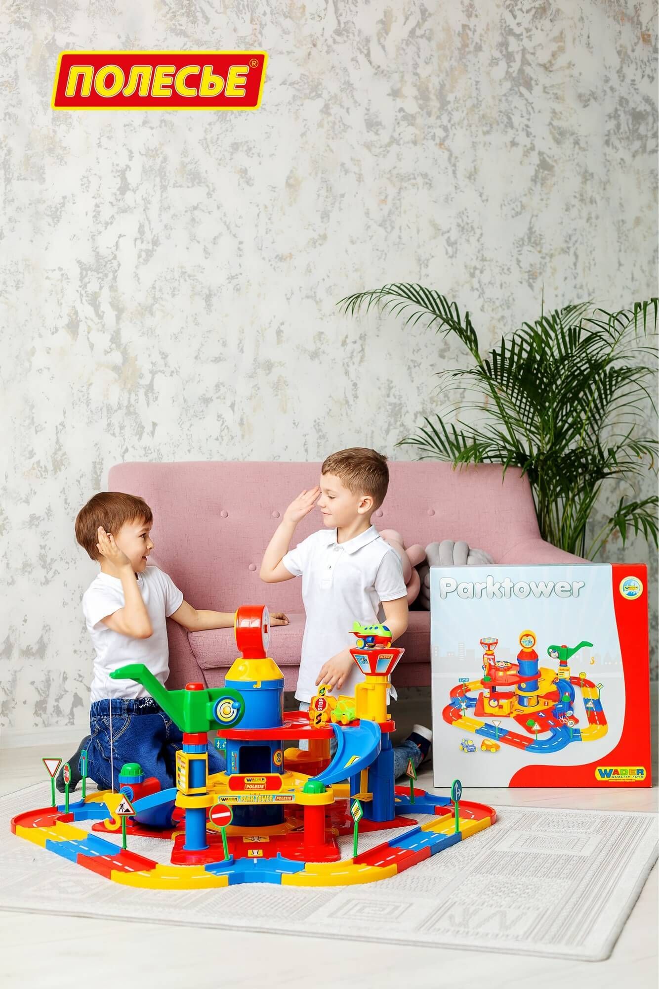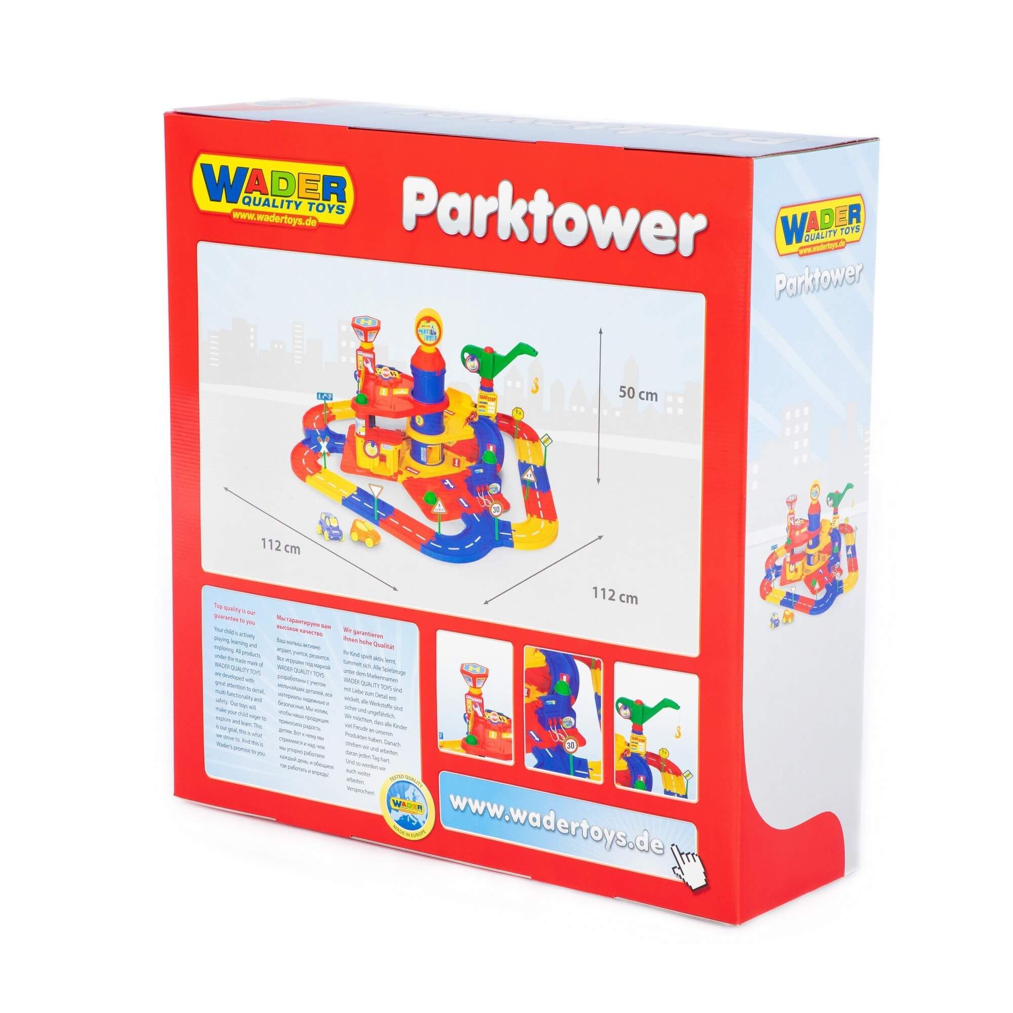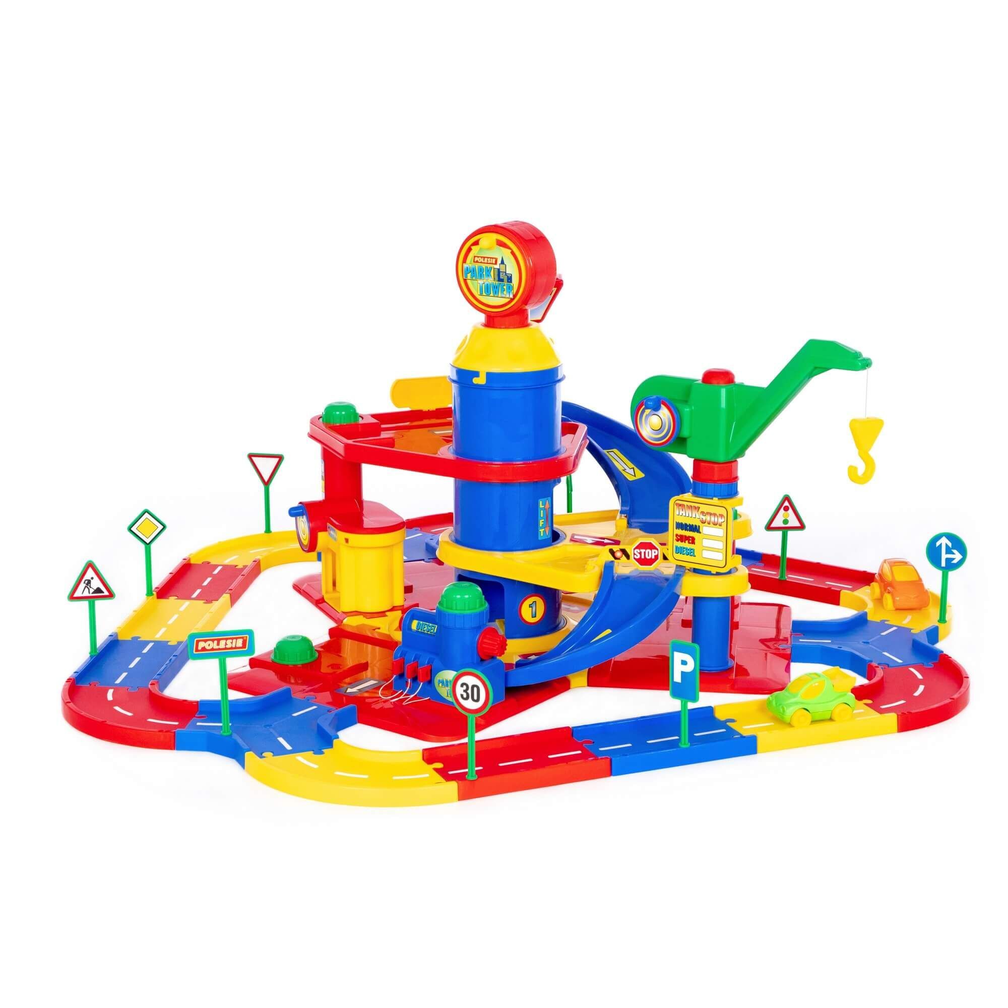 Паркинг представляет собой трехуровневую парковку, куда автомобили можно поднимать на лифте, а спускать по съездам. Машинки (2 шт.), входящие в набор, можно обслужить в игрушечном автосервисе: проверить автомобиль на подъёмнике, "помыть" на автомойке, а заправить на АЗС. Лифт, мойка и эстакада приводятся в движение при вращении рукояток, так же как и подъёмный кран. Паркинг оснащён дорогой с 10 дорожными знаками.