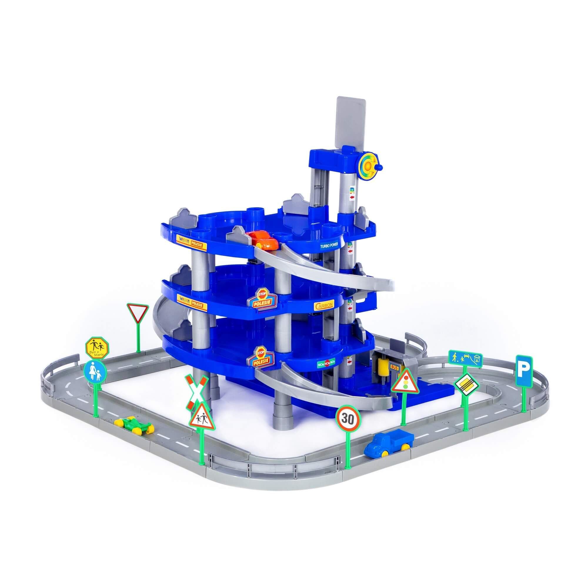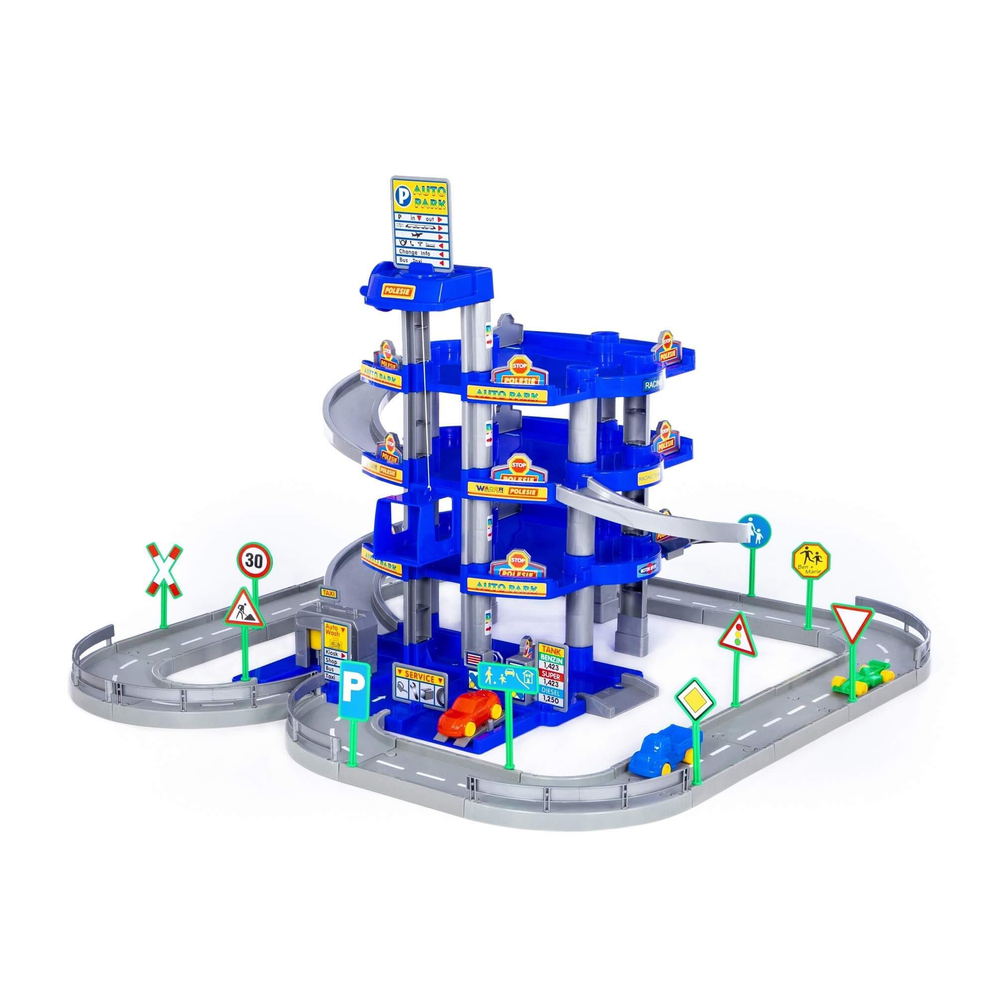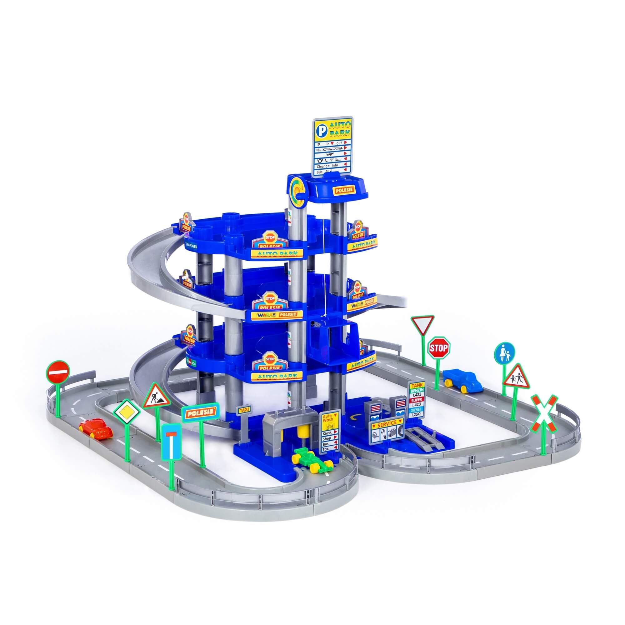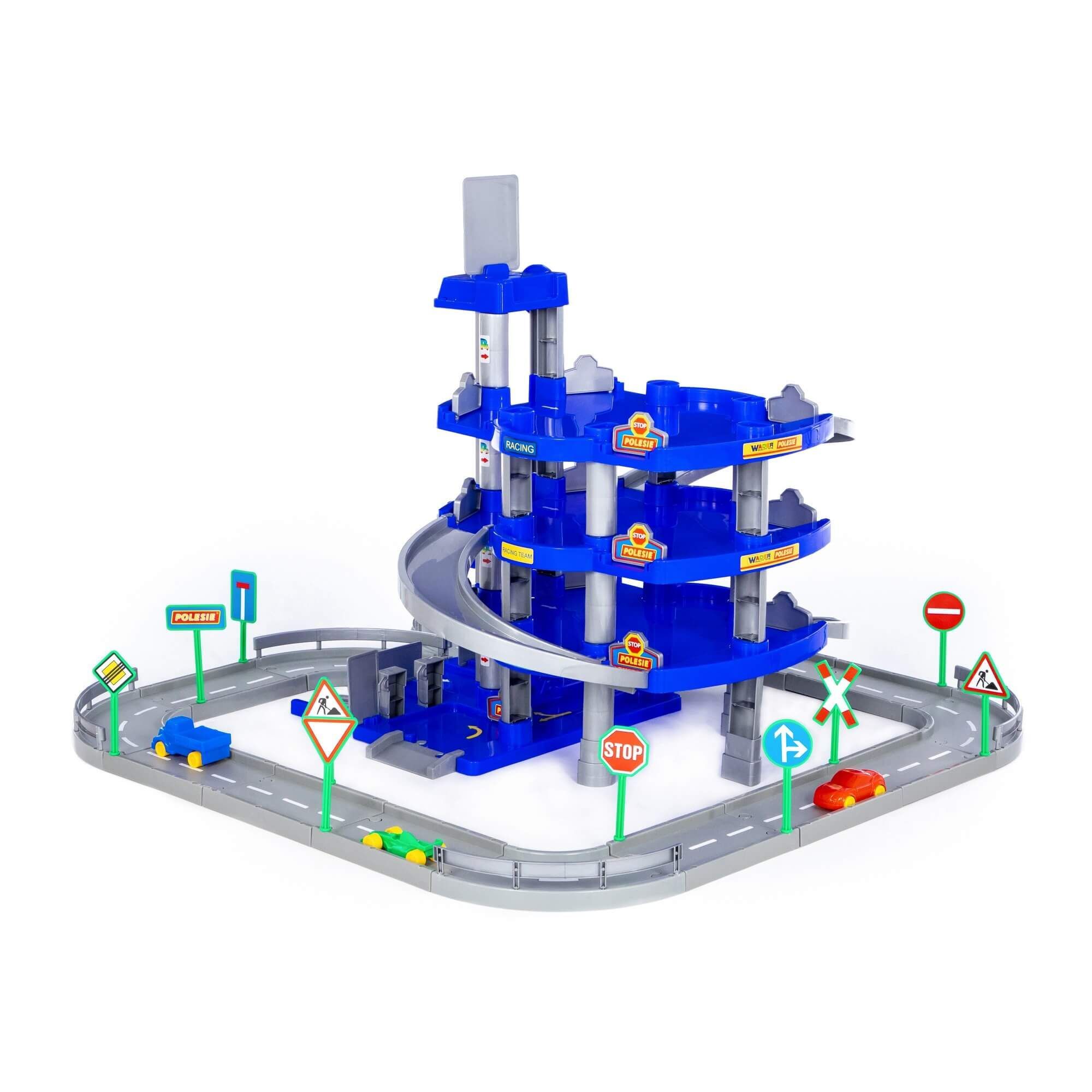 Красивый четырехуровневый паркинг с тремя мини-автомобилями, дорогой и дорожными знаками (10 шт.). На первом уровне паркинга расположены автомойка, автозаправка, автосервис с эстакадой. На остальные уровни автомобили поднимаются на лифте с ручным приводом, то есть для движения лифта ребенку нужно поворачивать рукоятку на верхнем уровне.