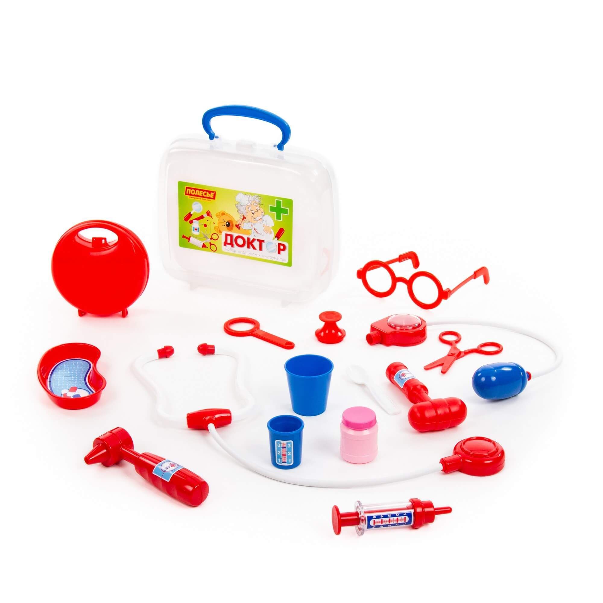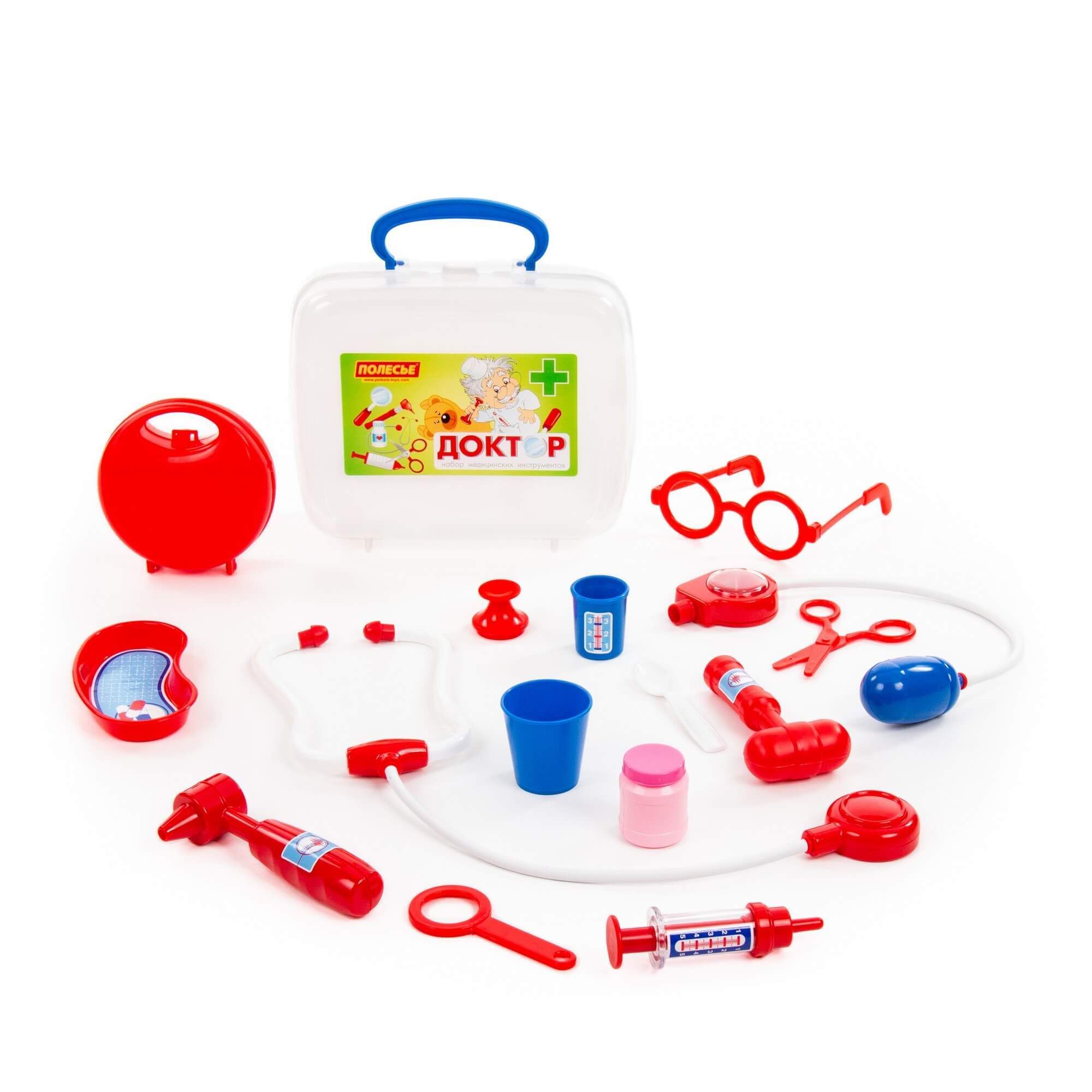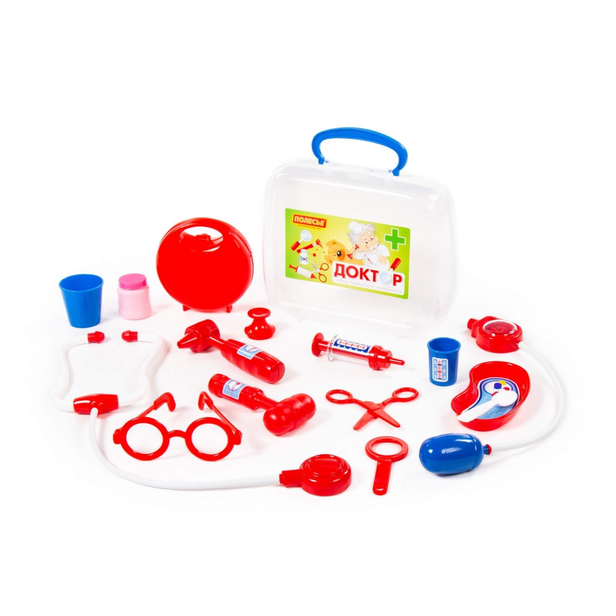 Игра «в доктора» станет ещё интереснее с набором от компании «Полесье». Малыш сможет быстро оказать помощь своим пациентам и, возможно, именно с этой игрушки у ребёнка проснётся интерес к профессии врача. В этом ему помогут игрушечные медицинские принадлежности в чемоданчике, которые удобно хранить и перемещать. В состав набора входят: