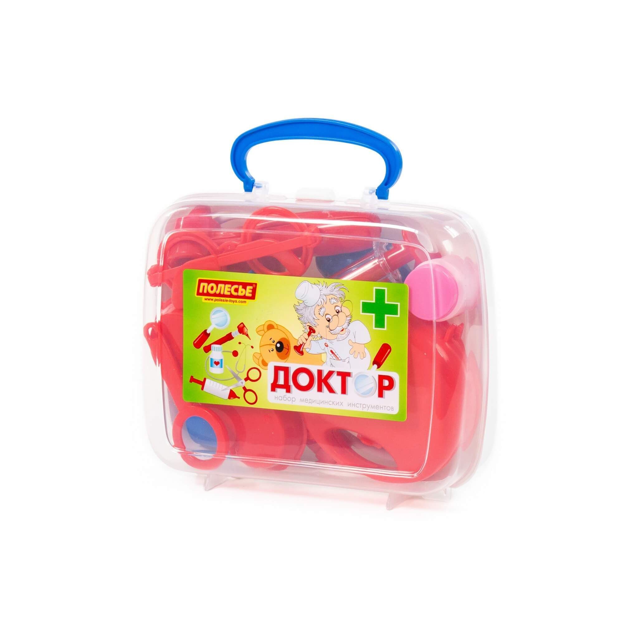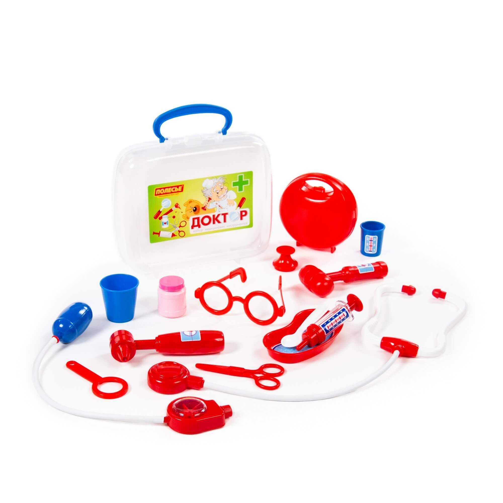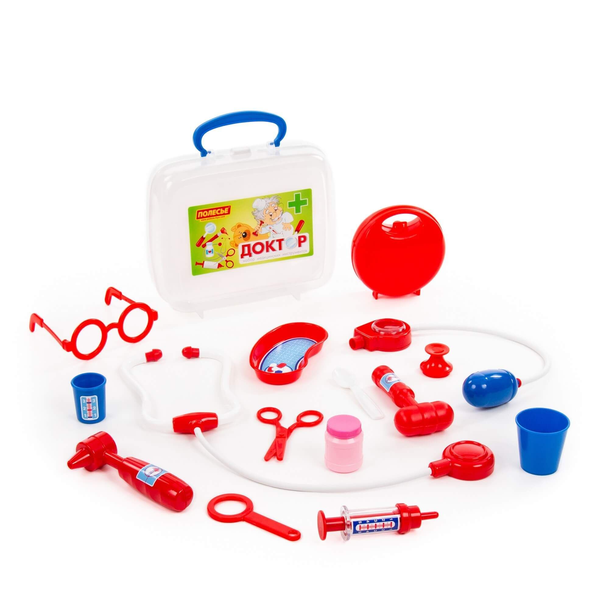 Игра «в доктора» станет ещё интереснее с набором от компании «Полесье». Малыш сможет быстро оказать помощь своим пациентам и, возможно, именно с этой игрушки у ребёнка проснётся интерес к профессии врача. В этом ему помогут игрушечные медицинские принадлежности в чемоданчике, которые удобно хранить и перемещать. В состав набора входят:
