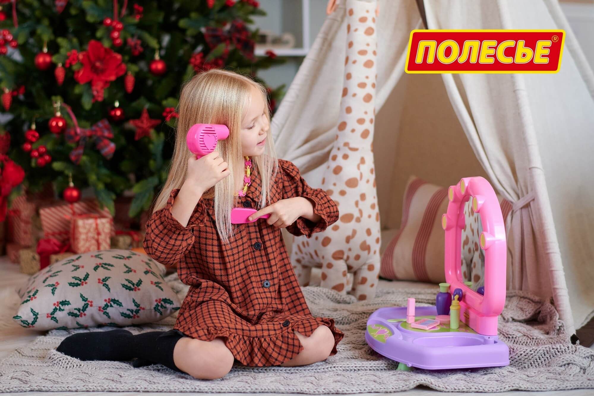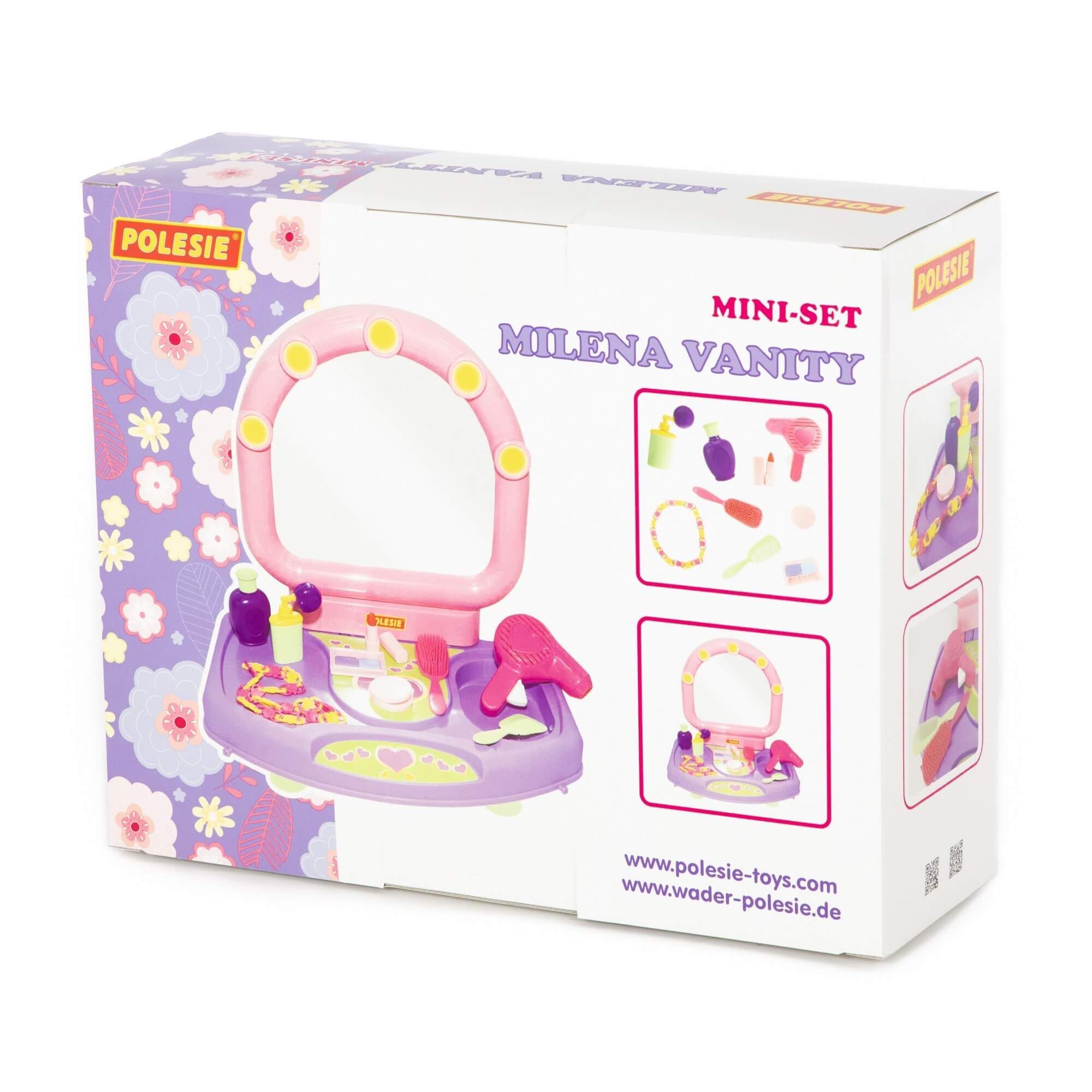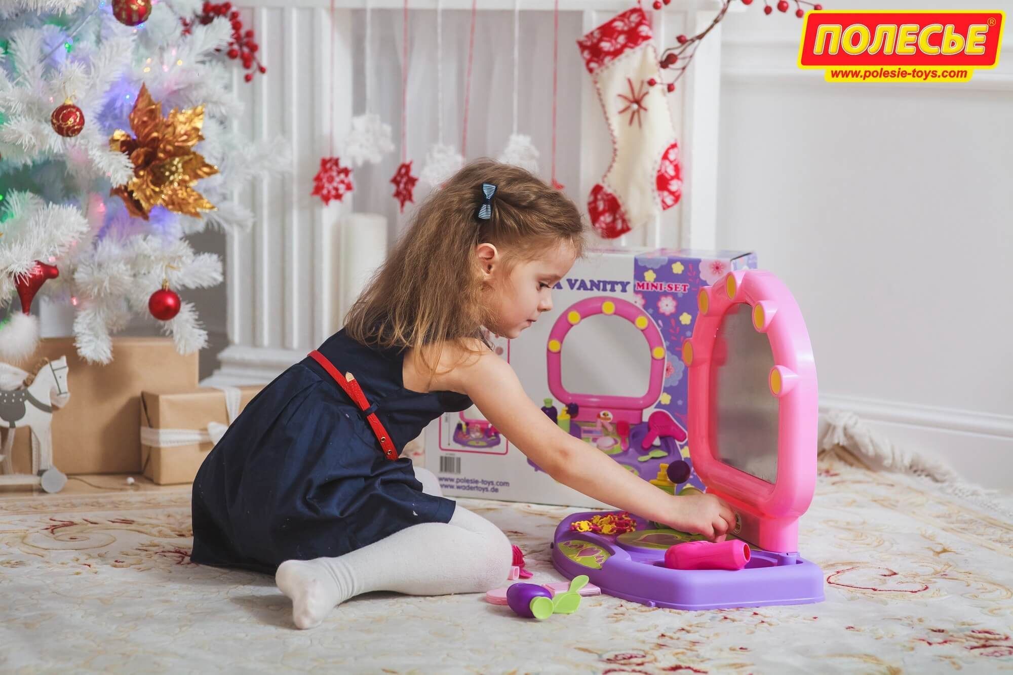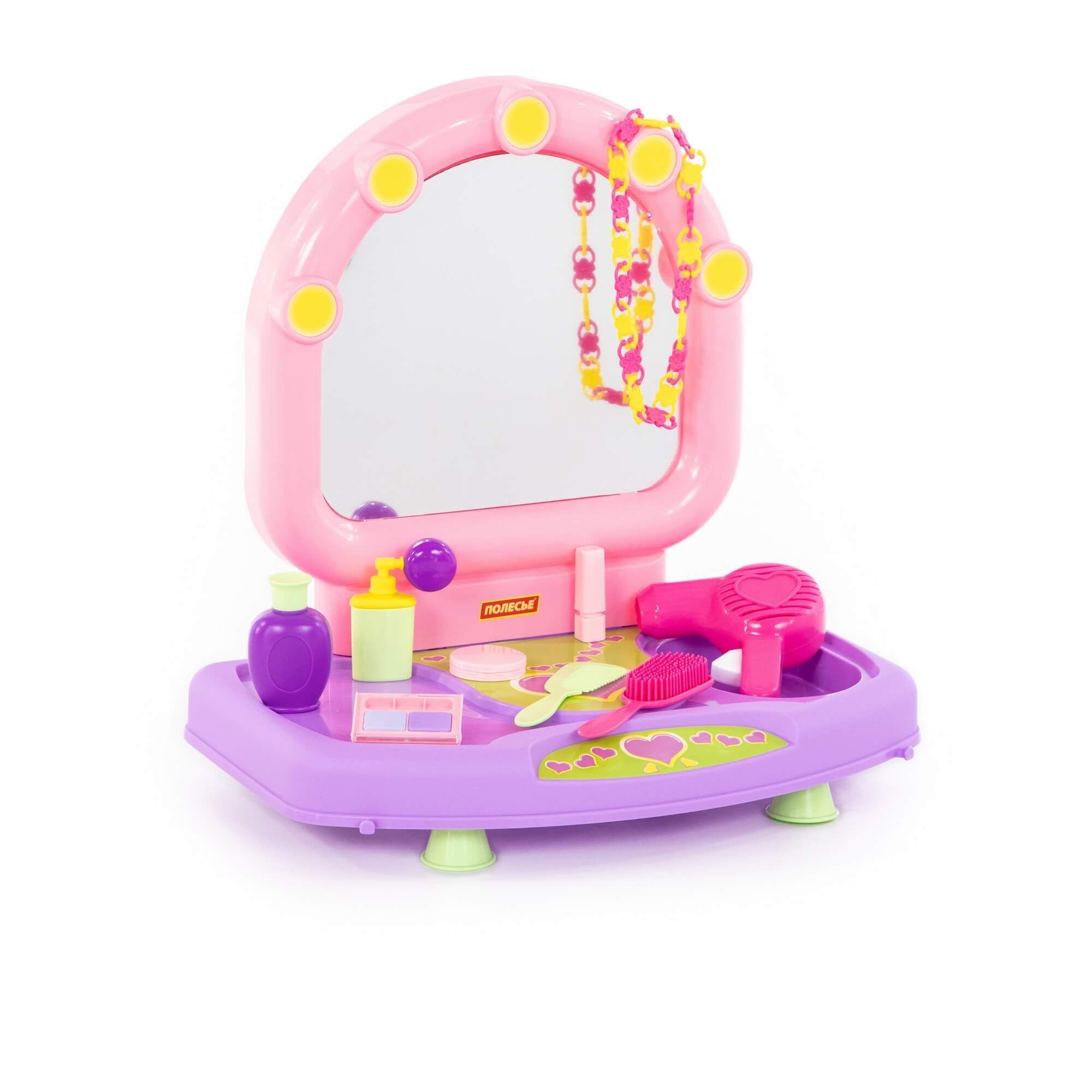 Настольный салон красоты для маленьких красавиц представляет собой туалетный столик с зеркальцем. В набор входят игрушечные принадлежности: фен, расчески (2 шт.), ожерелье, пудреница, тени для век, помада, флакончики для косметических средств. С помощью набора маленькая модница сможет организовать свой салон красоты и примерить на себя роль парикмахера, визажиста или стилиста.
