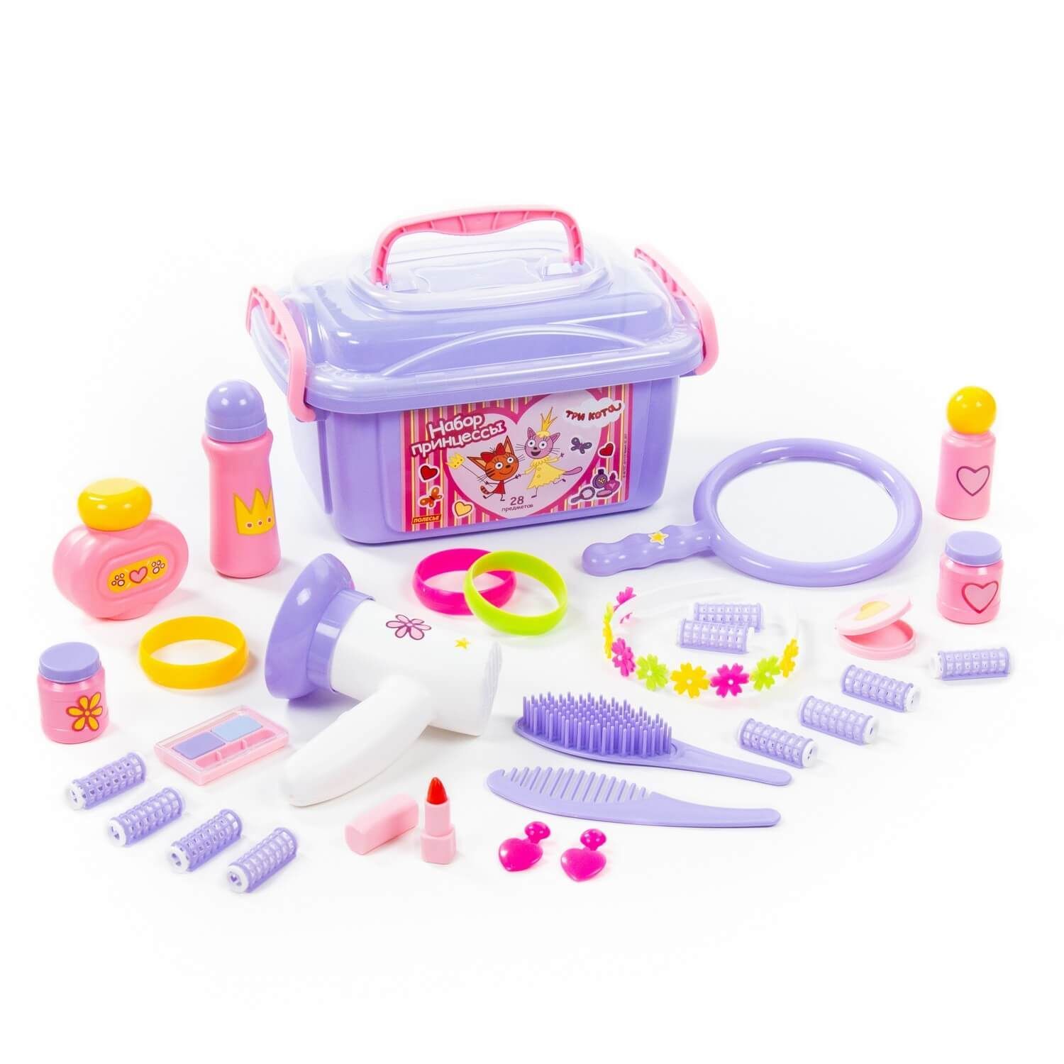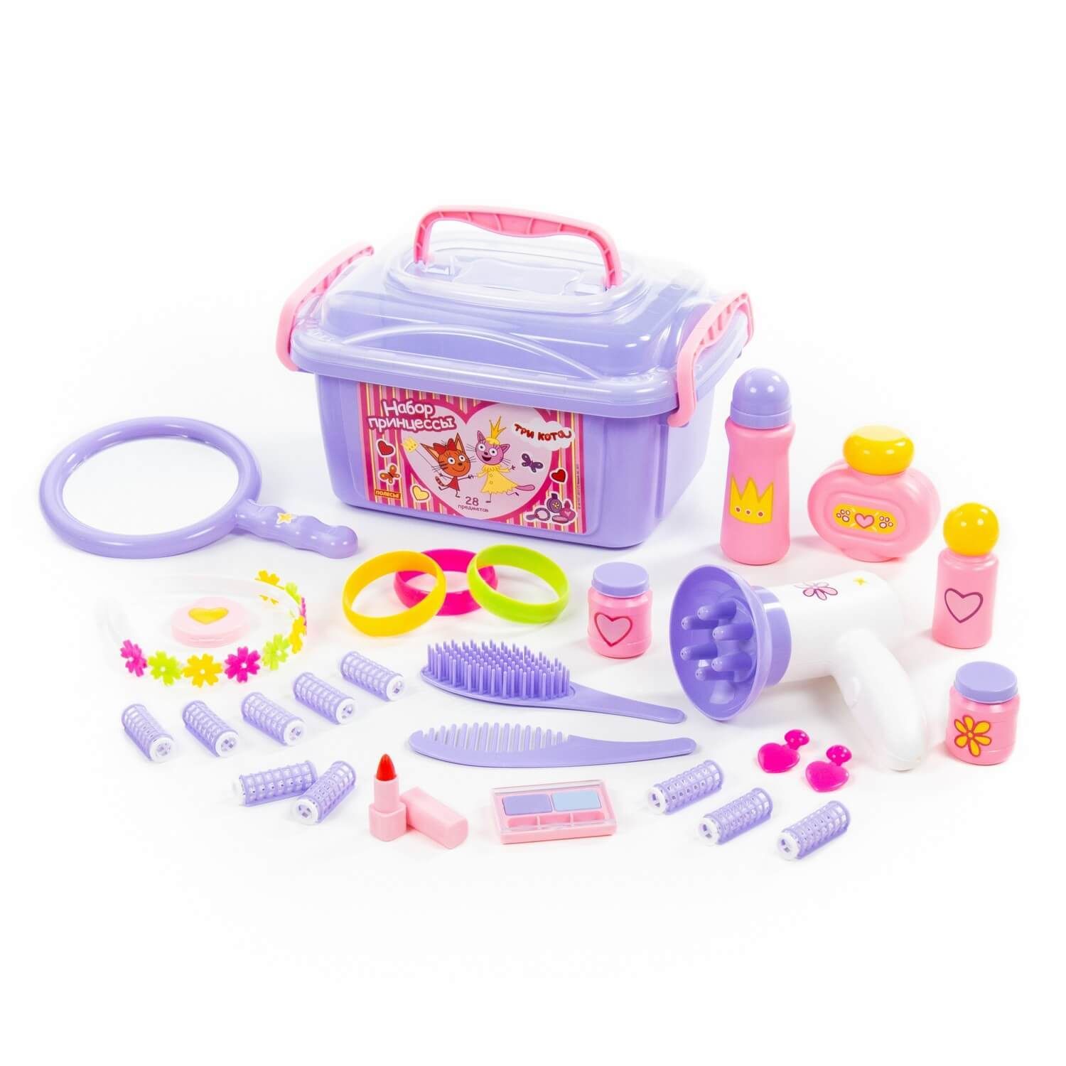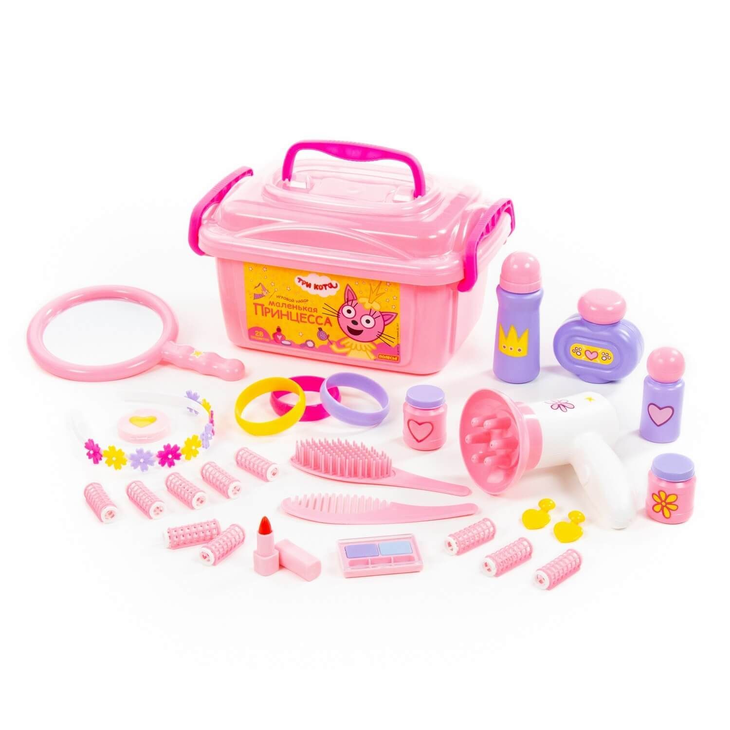 Игрушки упакованы в контейнер, куда юная модница может поместить и другие свои аксессуары для волос. С набором "Три Кота" "Принцессы" девочки могут организовать свой салон красоты или парикмахерскую, тем самым развивать воображение и фантазию.
