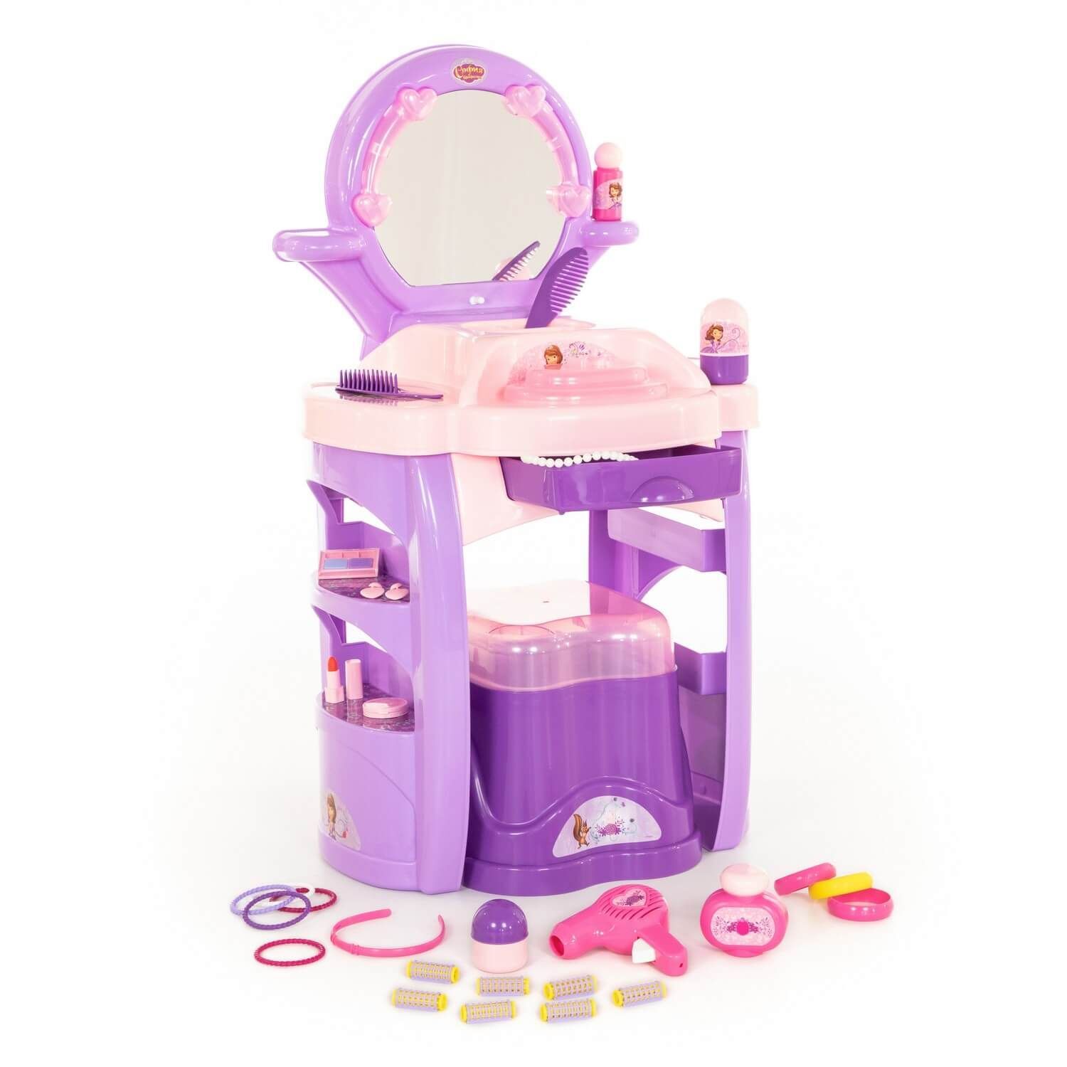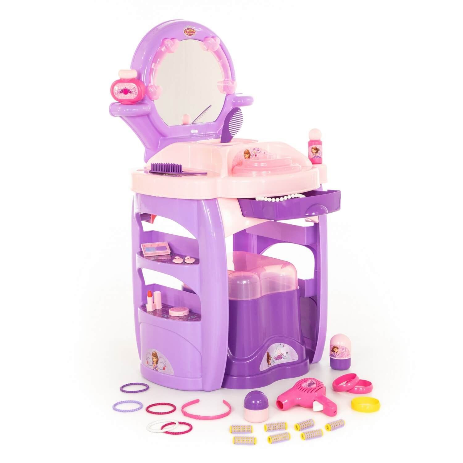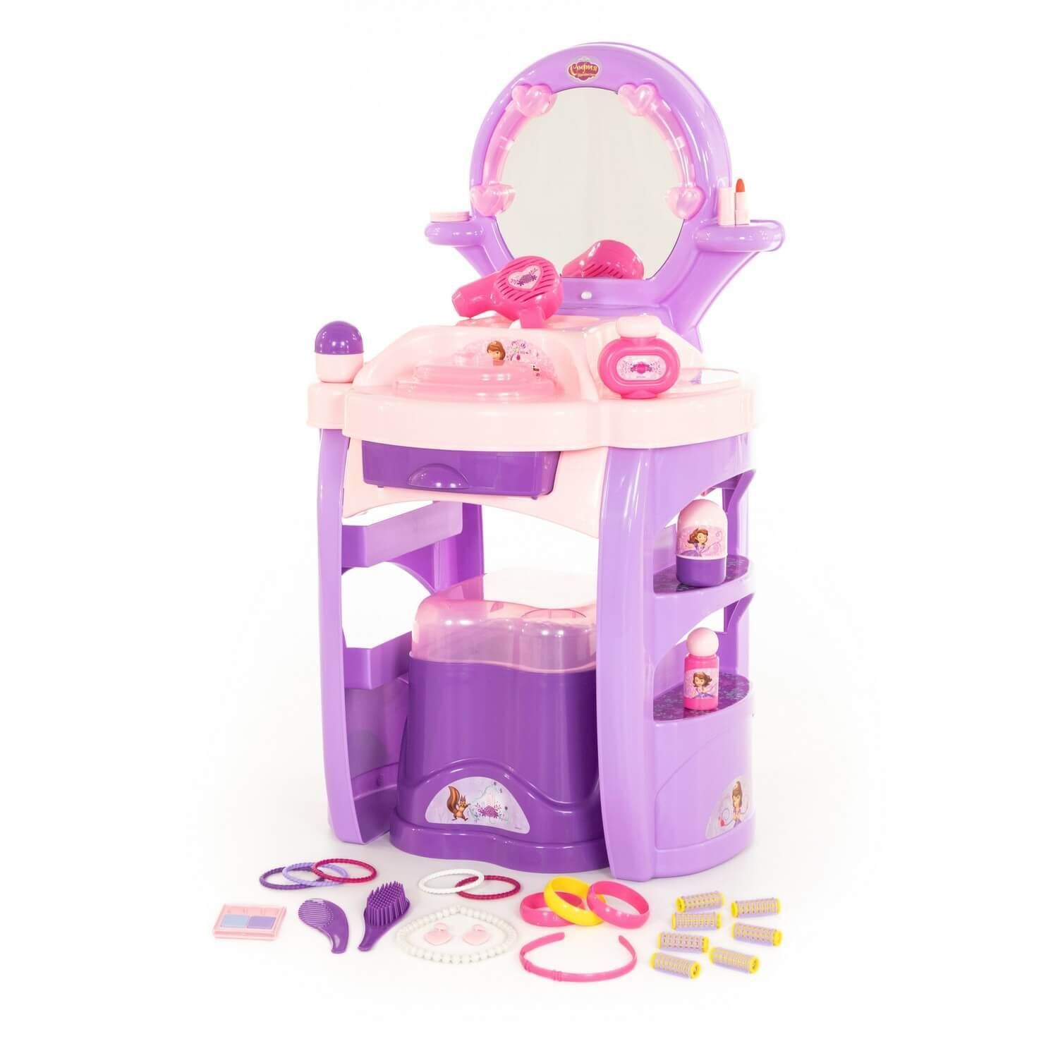 Почувствуй себя самой настоящей принцессой Disney вместе с новым набором от фабрики «Полесье»! Набор « Салон красоты Disney «София Прекрасная» состоит из столика с зеркалом и стульчика. Зеркало оснащено подсветкой, благодаря которой отлично видно отражение. Парикмахерские принадлежности и украшения удобно хранить в шкатулке и выдвижном ящике столика, а также на специальных полочках. В набор входят: фен, бигуди (7 шт.), расчески (2 шт.), флакончики (4 шт.), браслетики двух видов (8 шт.), клипсы, бусы, обруч, а также игрушечные тени для век, губная помада и пудра. Набор «Салон красоты Disney «София Прекрасная» станет отличным подарком для маленькой поклонницы анимационного сериала «София Прекрасная».