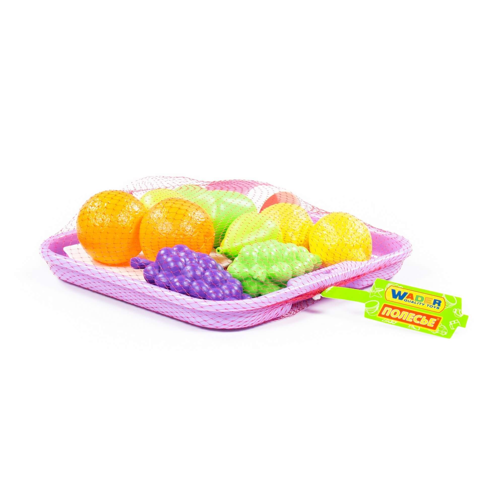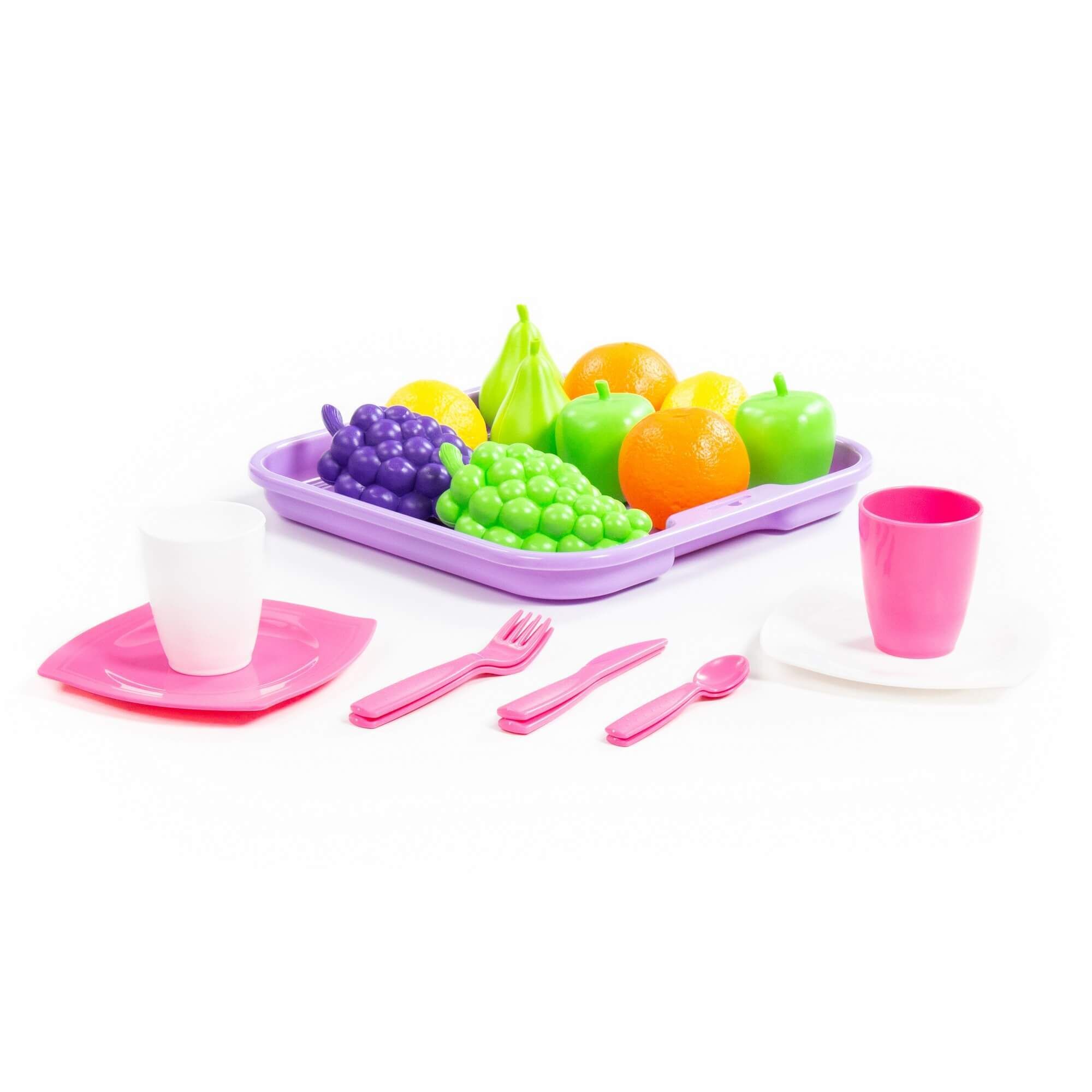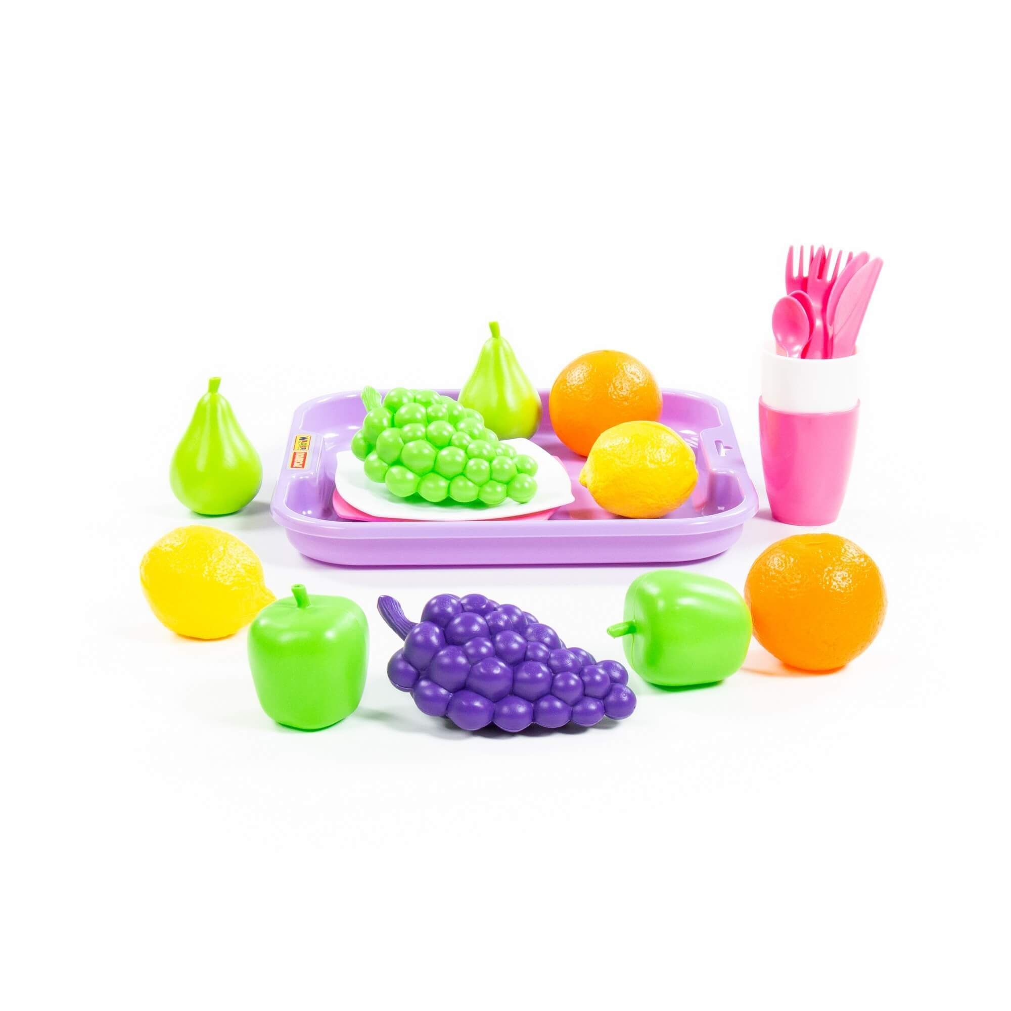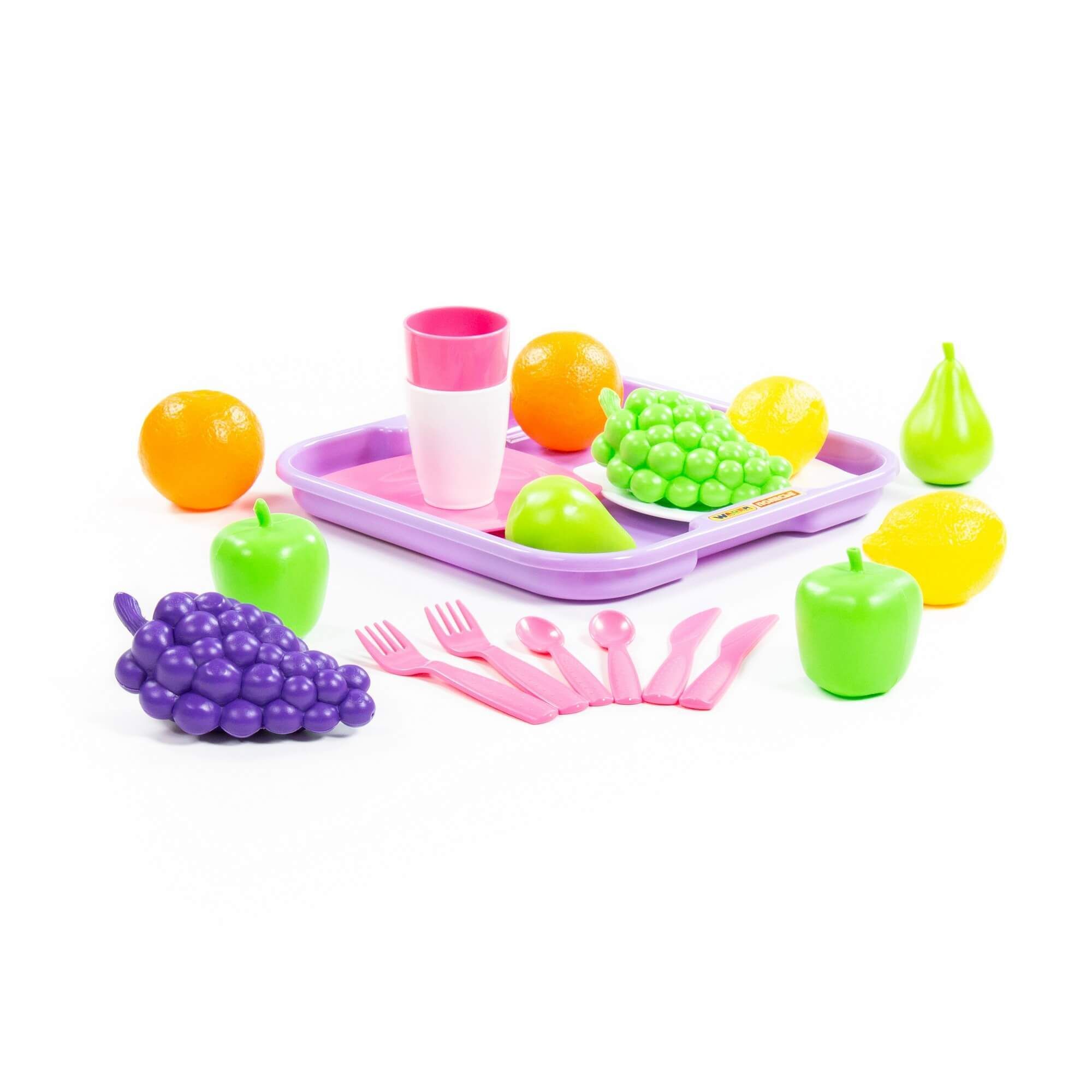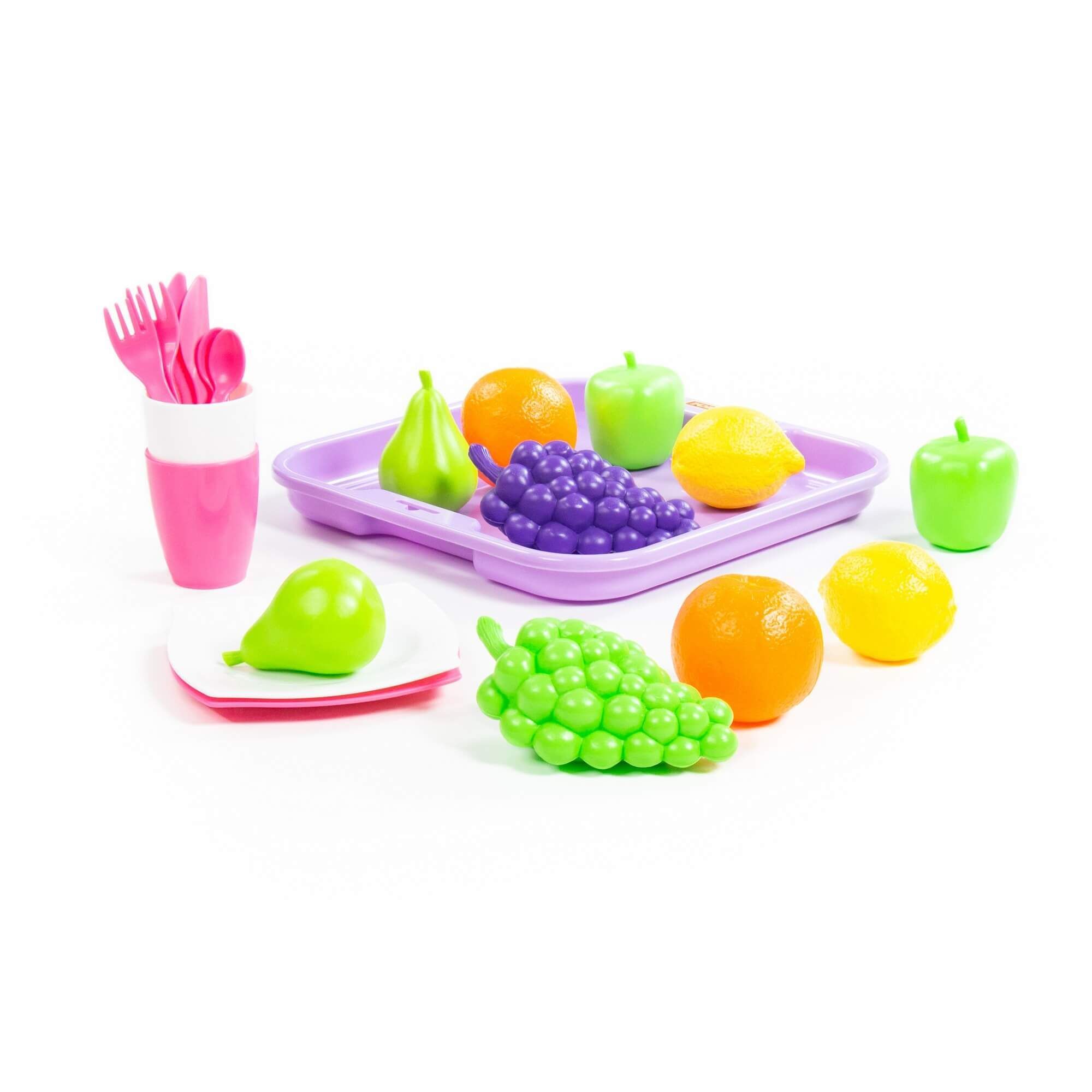 Набор продуктов включает в себя набор посуды, поднос и фрукты: