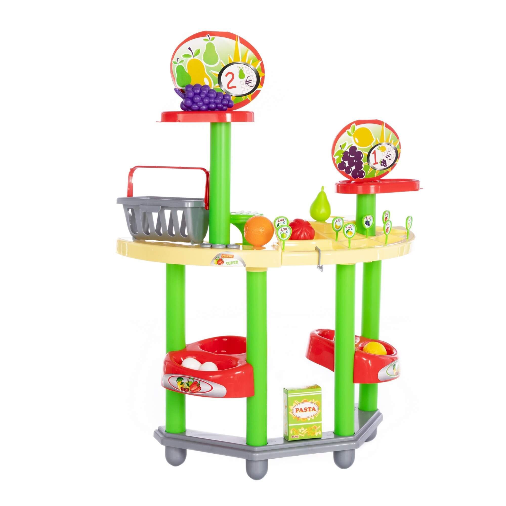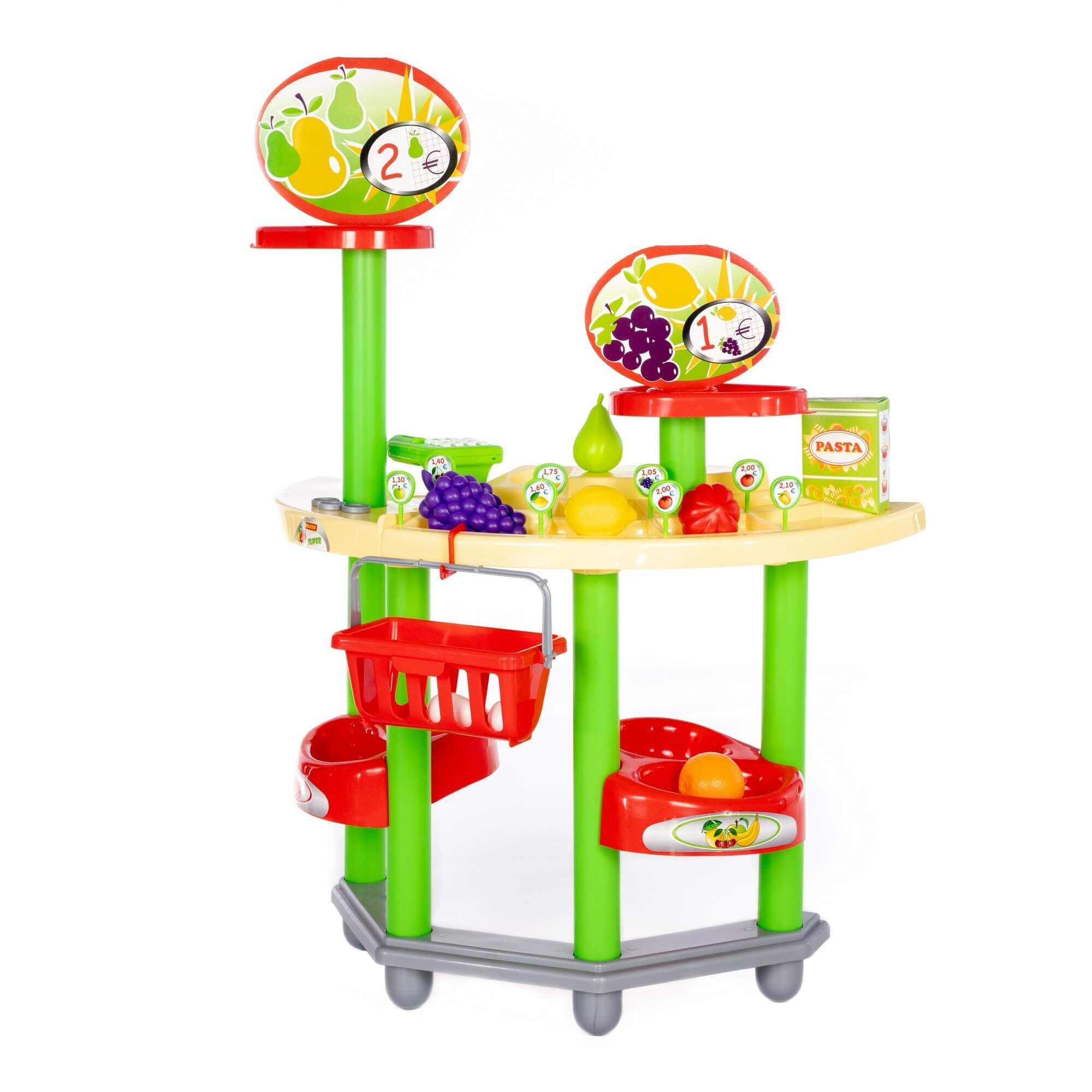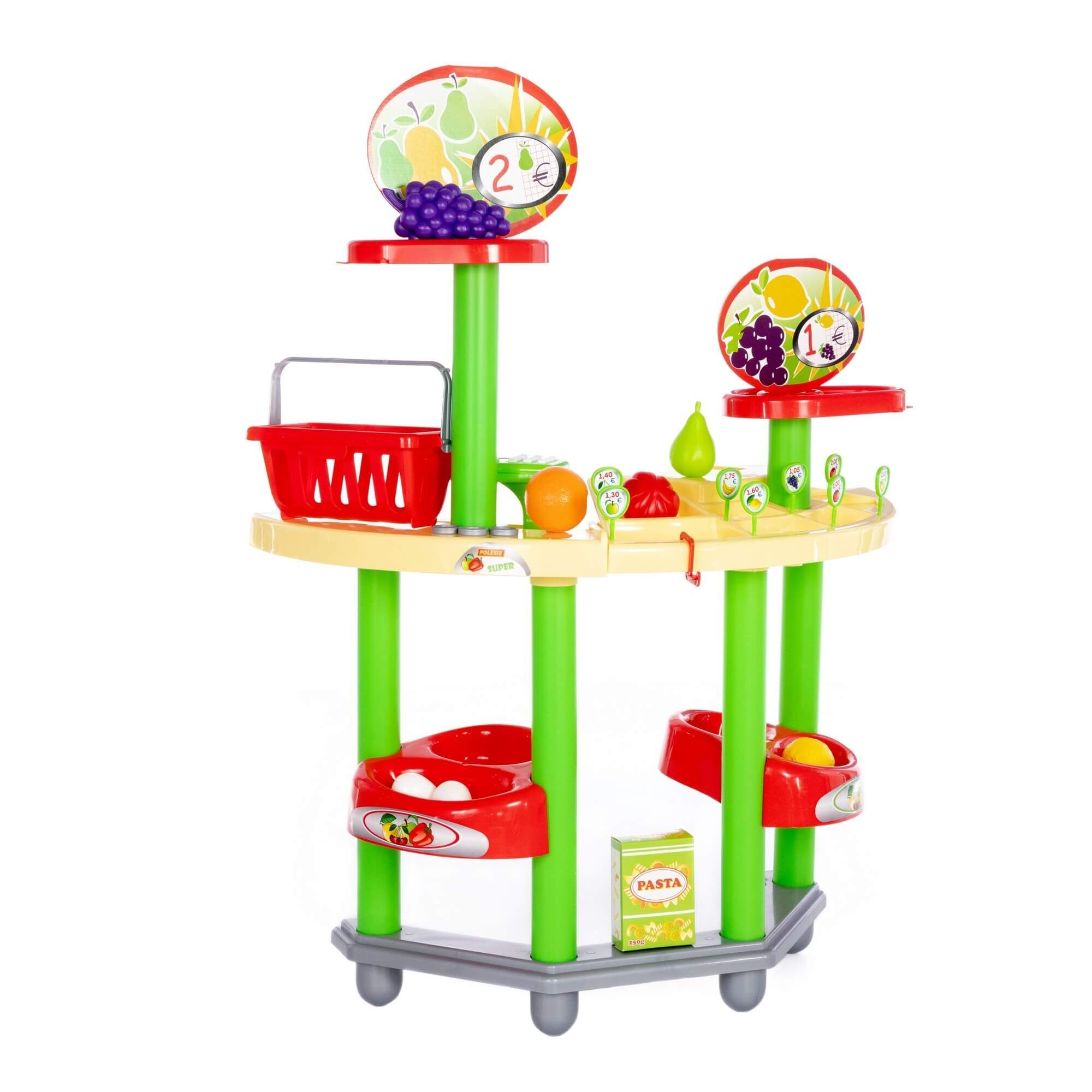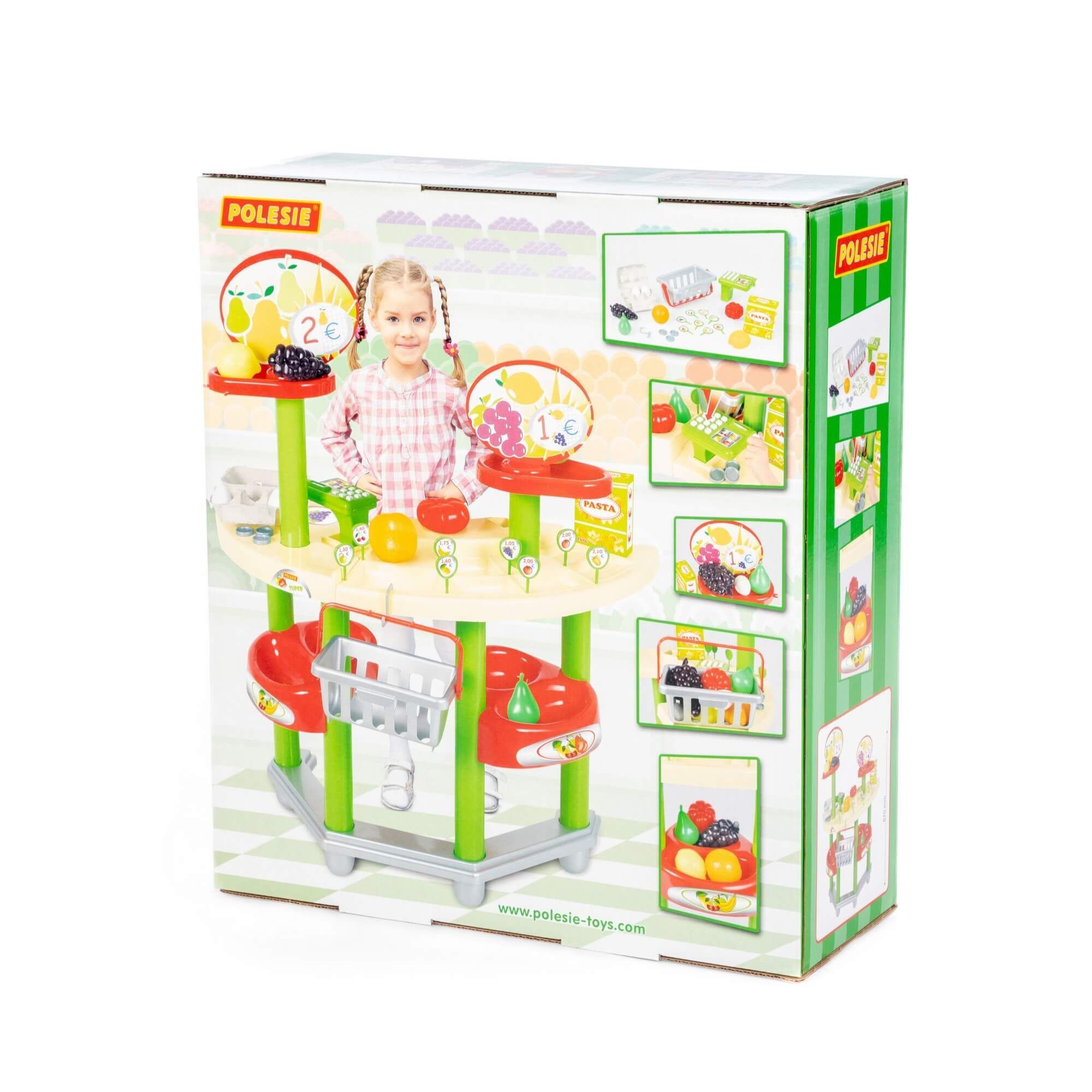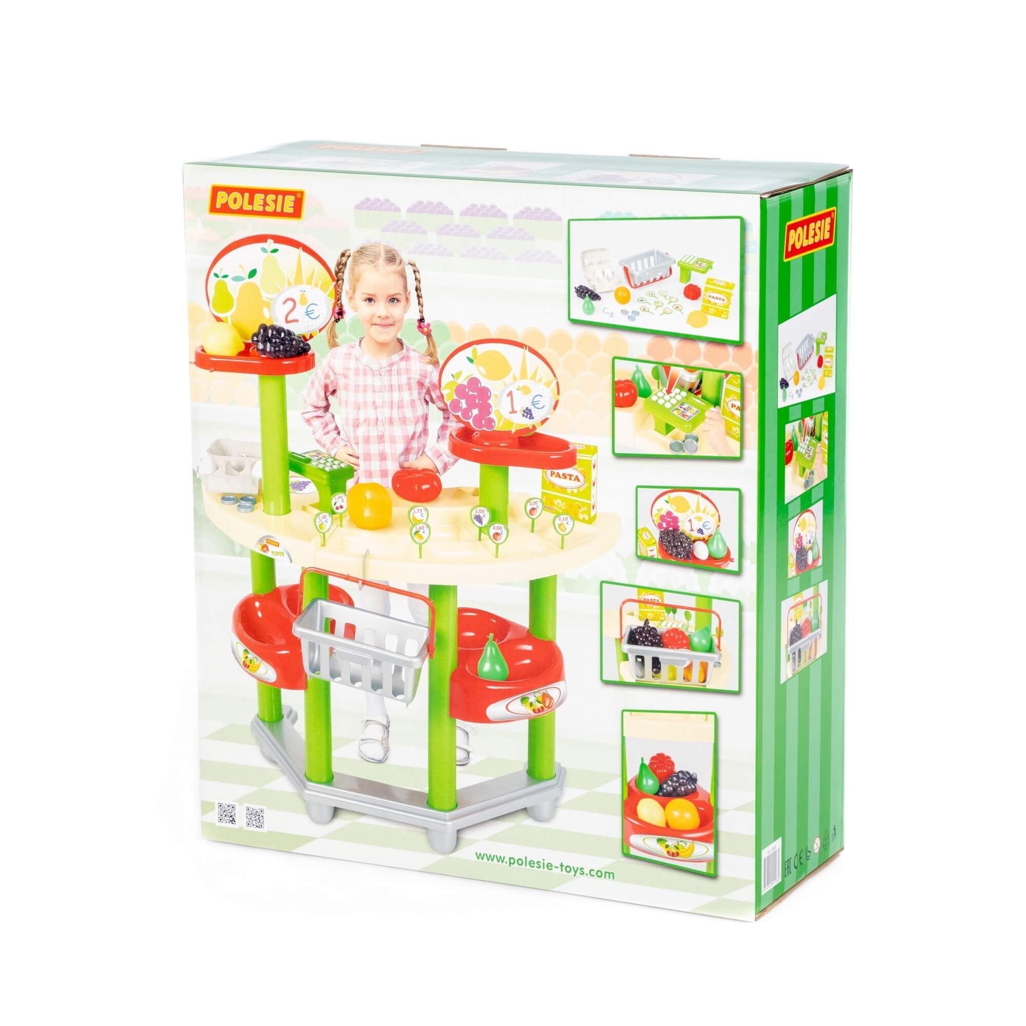 Игровой комплекс представляет собой витрину магазина с ячейками и полками, где можно выложить для продажи фрукты, овощи и другие продукты. В набор входят кассовый аппарат, корзинка для покупок, 8 ценников, пара монеток. В комплекте предусмотрены продукты: куриные яйца (2 шт.), груша, помидор, апельсин, лимон, виноград, имитация упаковки макаронных изделий.