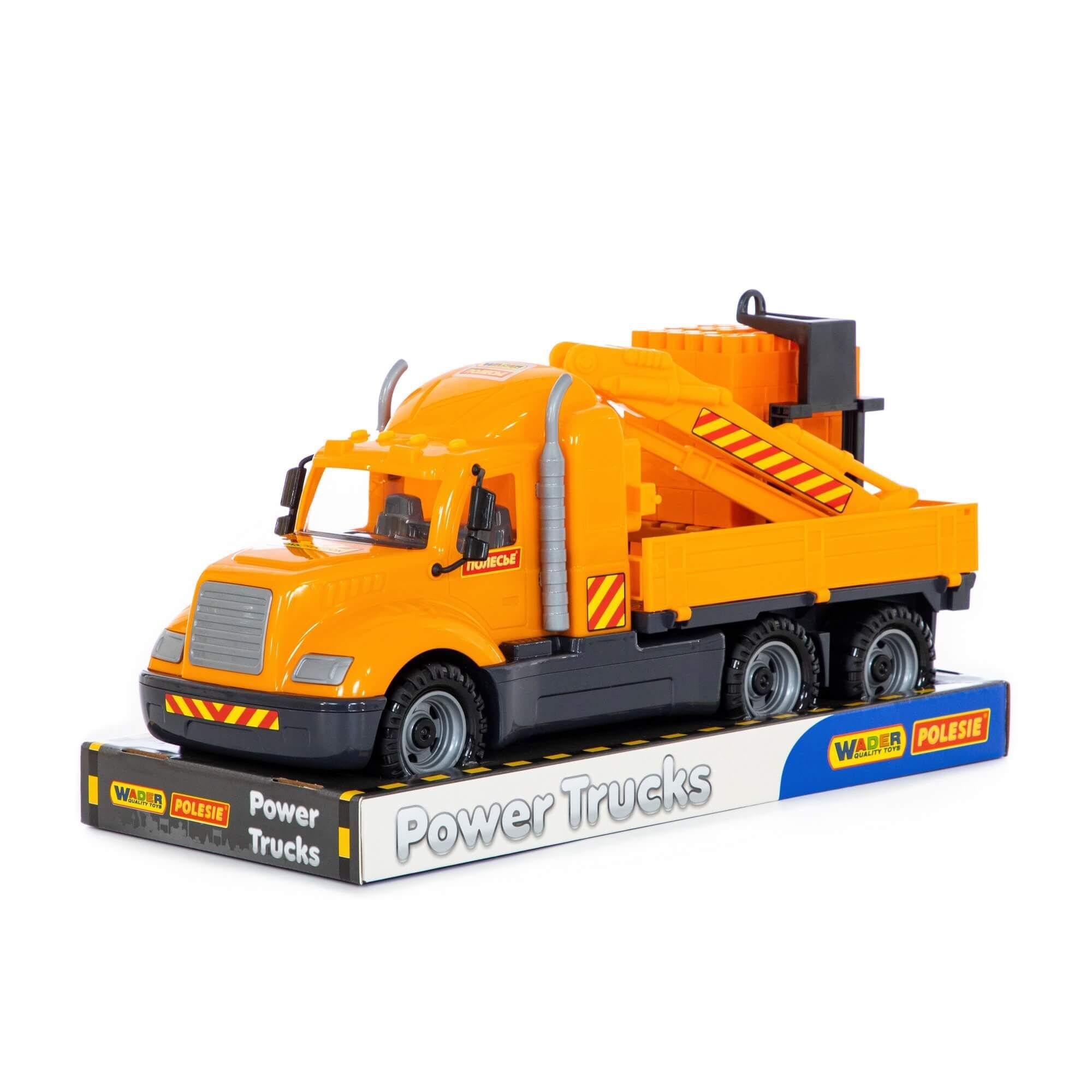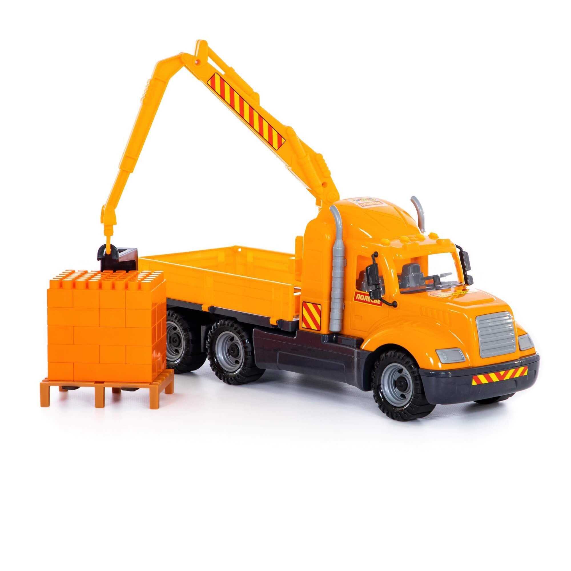 "Майк" – это подарочный автомобиль, он оснащен краном с манипулятором, которым можно загружать и разгружать кузов бортового автомобиля. В набор входит 30 элементов конструктора на поддоне, который также можно подцепить краном. Играя с конструктором и автомобилем, малыш развивает логику, воображение, фантазию и пространственное мышление.