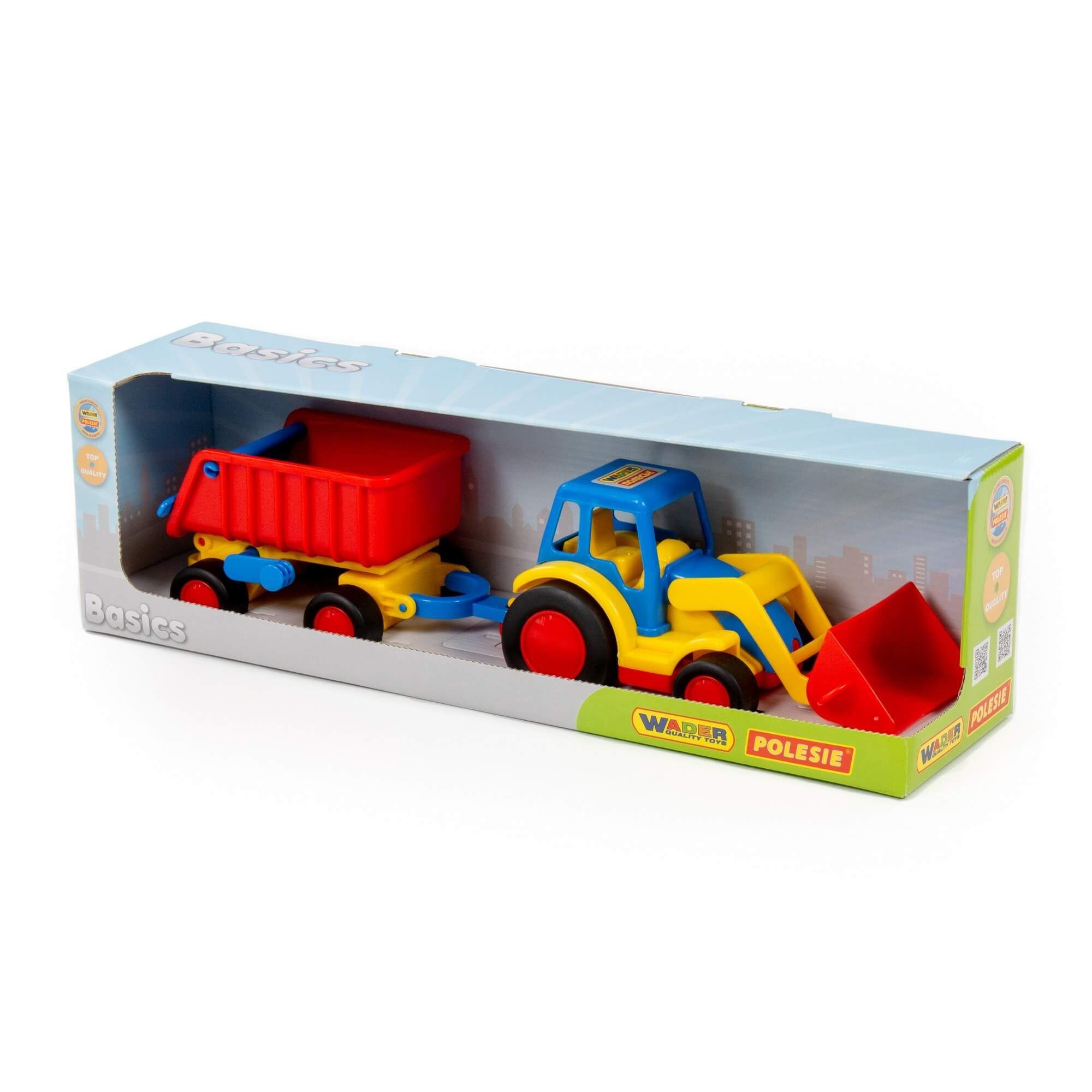 Стильные, удобные и небольшие машинки для малыша от фабрики «Полесье» — это серия «Базик». Они отличаются компактным размером, продуманной эргономикой, расцветкой и функционалом. Трактор-погрузчик имеет подвижный ковш. В дополнение предусмотрен прицеп, задний борт которого открывается. В прицеп можно загружать грузы и подымать кузов прицепа за специальную рукоятку. Колёса погрузчика и прицепа — с резиновыми накладками, что обеспечивает практически бесшумное катание игрушки на любой поверхности. А наличие буксировочной петли позволяет возить игрушку за собой на верёвочке.