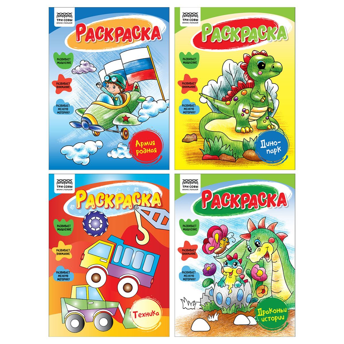 Раскраски «ТРИ СОВЫ» – это не только интересное, но и полезное занятие для ребенка. Задача ребенка раскрасить разными цветами чёрно-белое изображение, не выходя за контуры. Внутренний блок – 16 страниц плотной бумаги формата А5, которая подходит для раскрашивания карандашам, фломастерами или красками. При раскрашивании ребёнок учится правильно держать ручку, различать цвета и их оттенки. Раскраски помогают развить такие качества, как усидчивость и аккуратность, а также фантазию и воображение. В запайке 4 разных раскраски на темы: Армия родная, Динопарк, Драконьи истории, Техника. Эти изображения точно понравятся мальчишке. «ТРИ СОВЫ» – время с пользой! • Тип: стандартная; • Формат: А5; • Количество листов: 8; • Тип скрепления: скрепка.