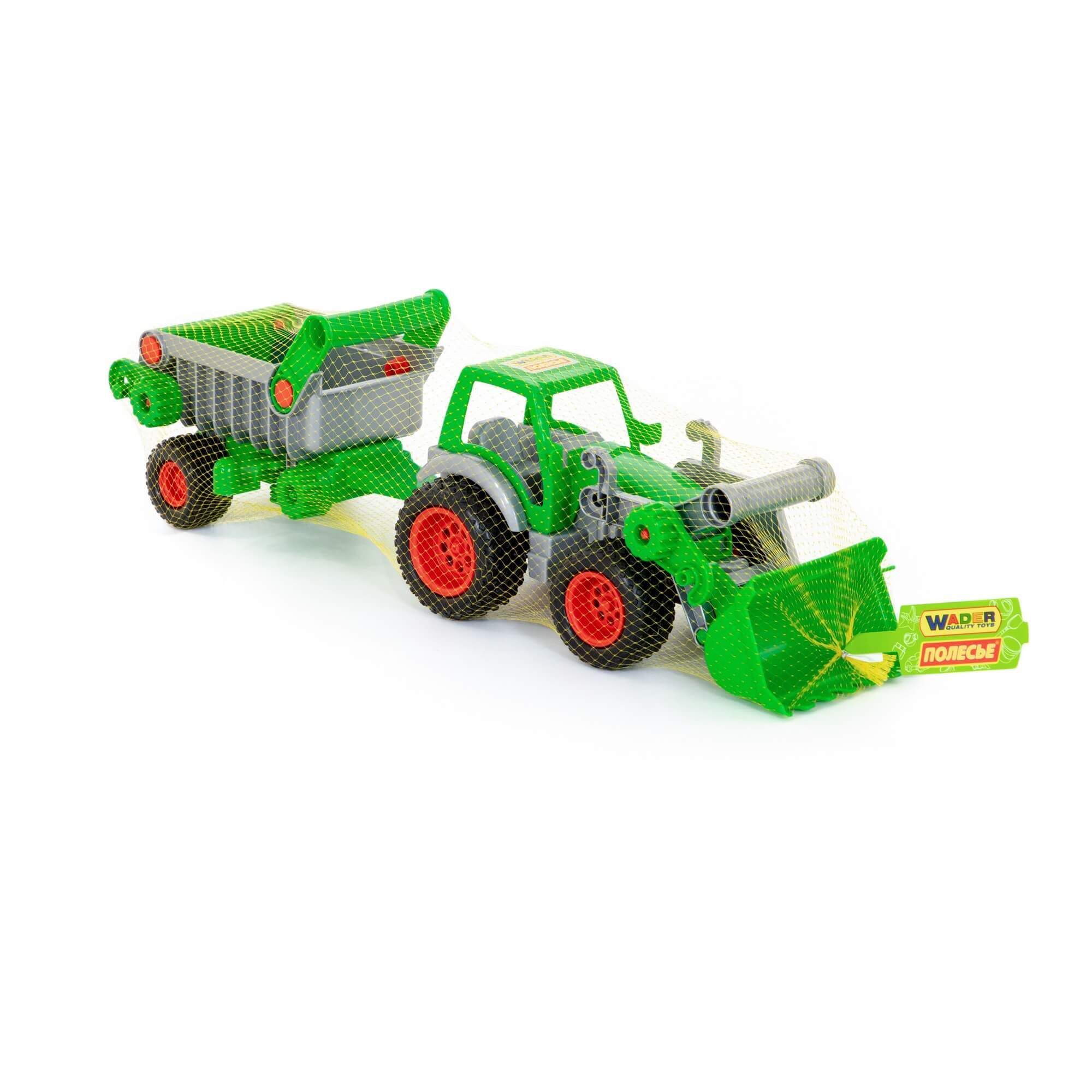 Трактор-погрузчик с полуприцепом из серии «Фермер-техник» - многофункциональная игрушка. Ковш трактора и борта прицепа подвижны, что добавляет реалистичности и удобства во время игры дома и на свежем воздухе. Полуприцеп можно отсоединить, что позволит использовать только кабину с ковшом. Колеса трактора имеют резиновые покрышки, которые повышают проходимость игрушки на любой поверхности. Игрушка продается в сеточке.