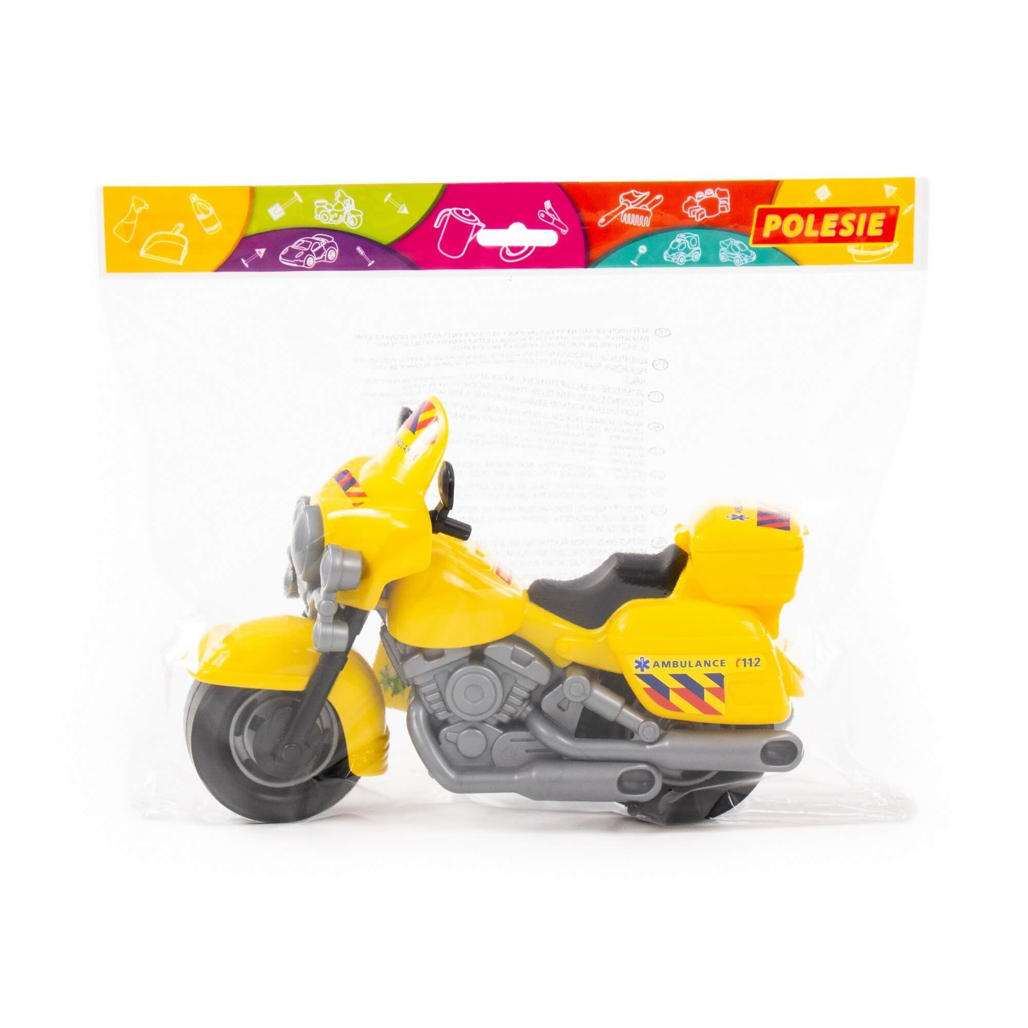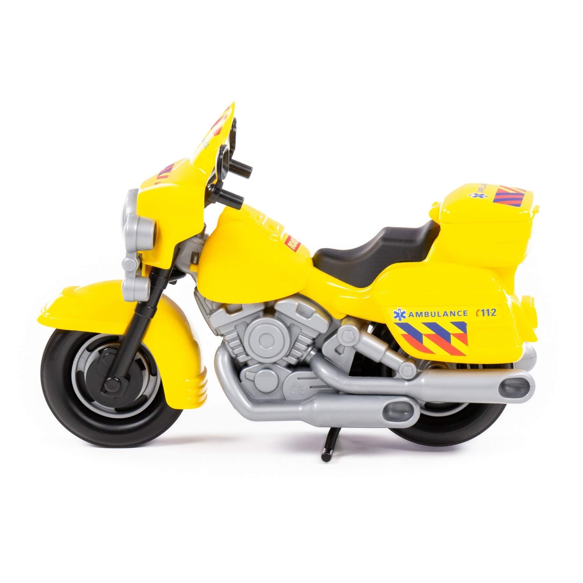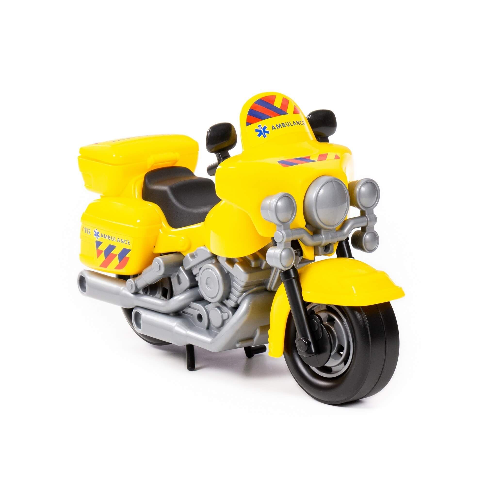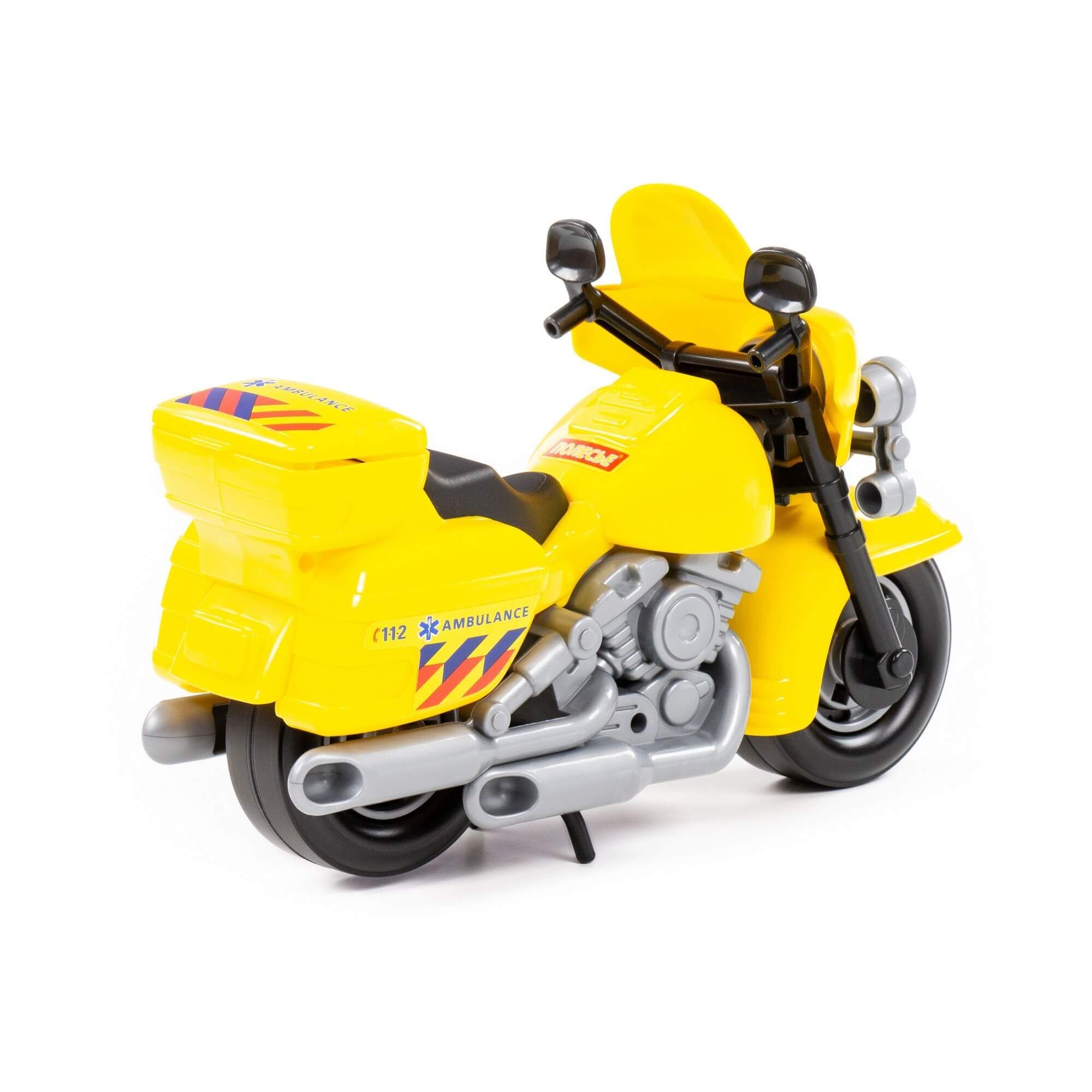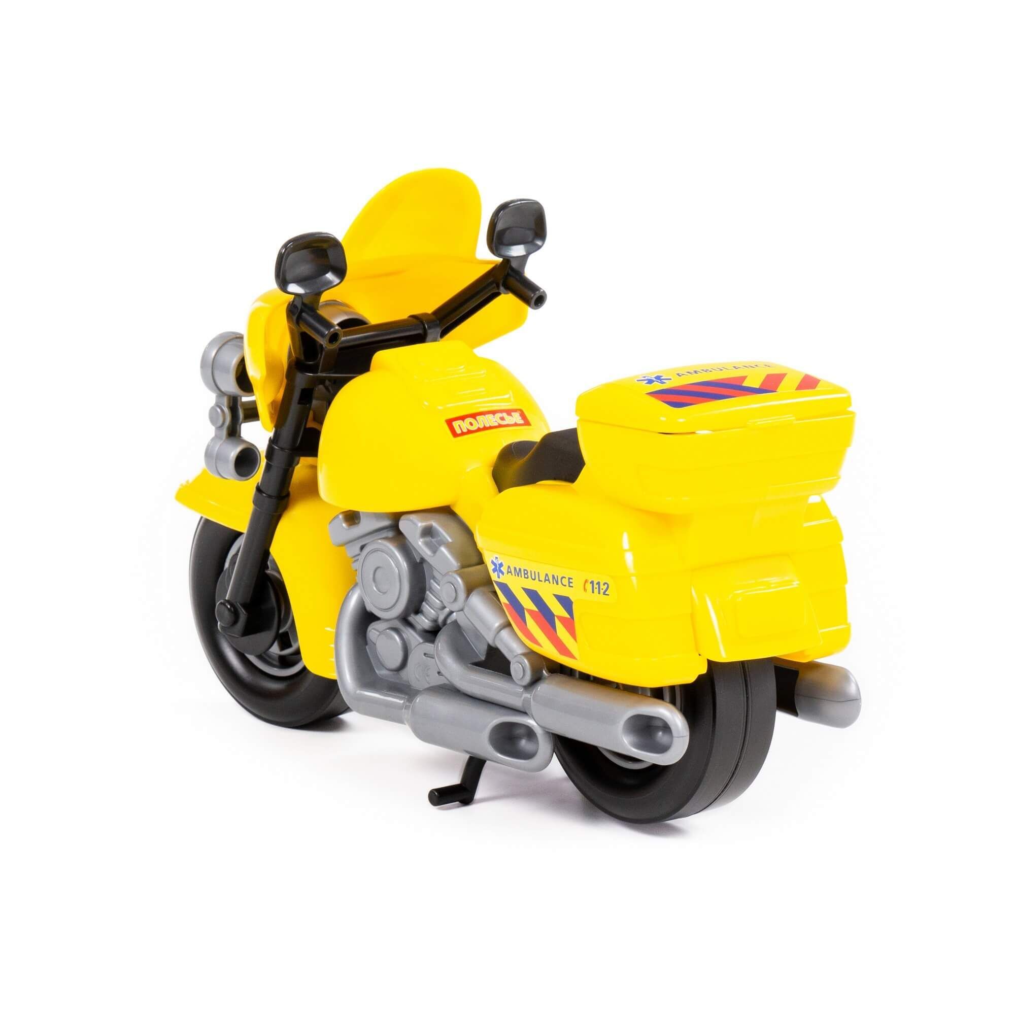 В игрушечном автопарке должно быть место не только для автомобилей, но и для мотоциклов! Фабрика «Полесье» предлагает поиграть миниатюрными моделями байков. Игрушка особенно будет интересна для маленьких лихачей. Дизайн мотоцикла скорая помощь выполнен максимально правдоподобно. Его можно использовать в качестве средства передвижения игрушечного героя. Руль байка поворачивается, имеются выдвижные/задвижные подножки, крышка багажника открывается. Таким образом, дети знакомятся с разными видами транспорта и находят в них отличия.
