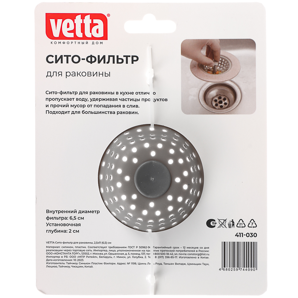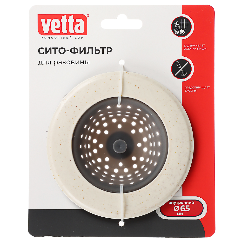Сито-фильтр для раковины VETTA с внутренним диаметром 65 мм и установочной глубиной 2 см эффективно предотвращает засоры, удерживая частички пищи от попадания в слив во время мытья посуды. Отлично пропускает воду, имеет приятный дизайн, легко моется и подходит для большинства раковин. Изготовлено из пластика.