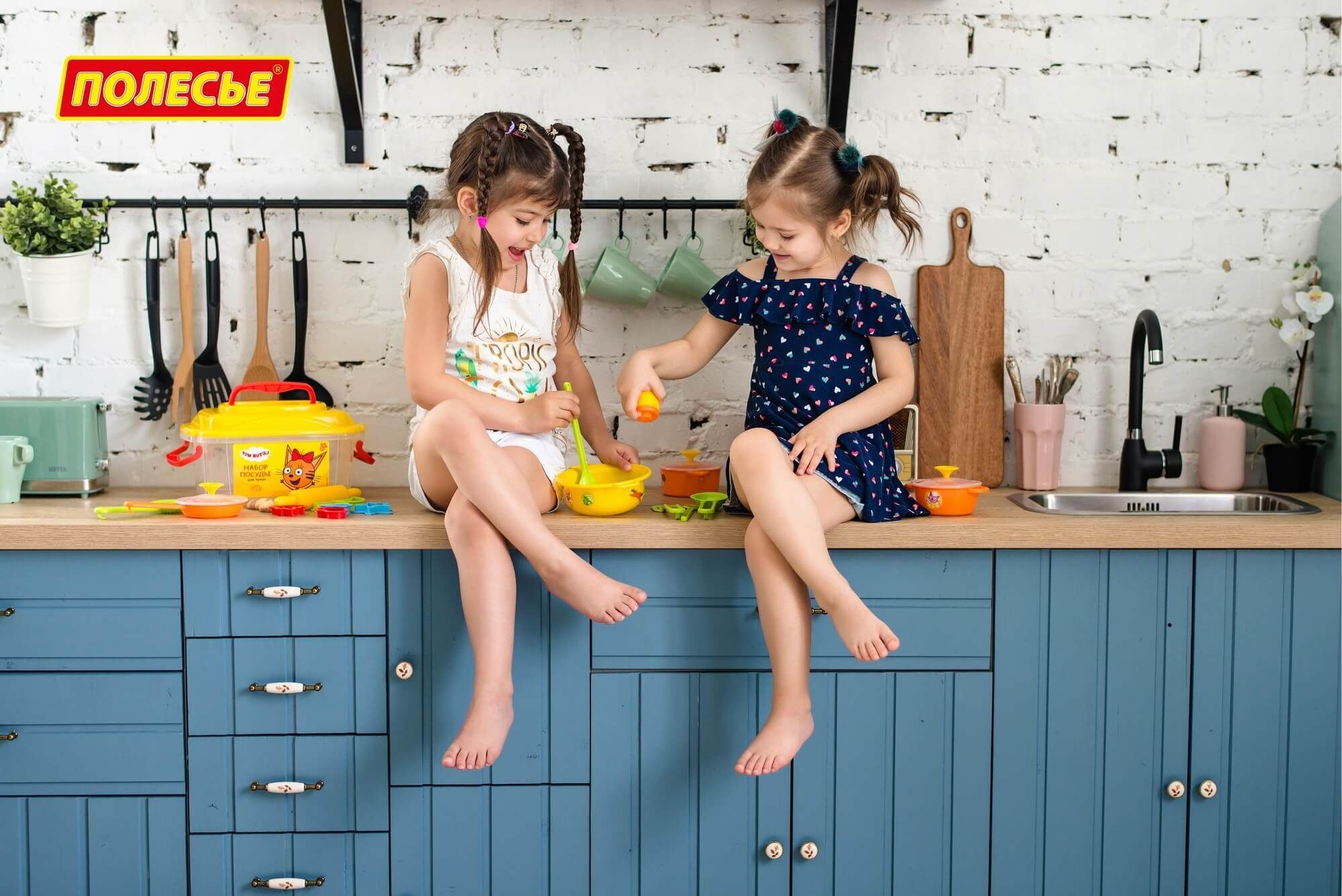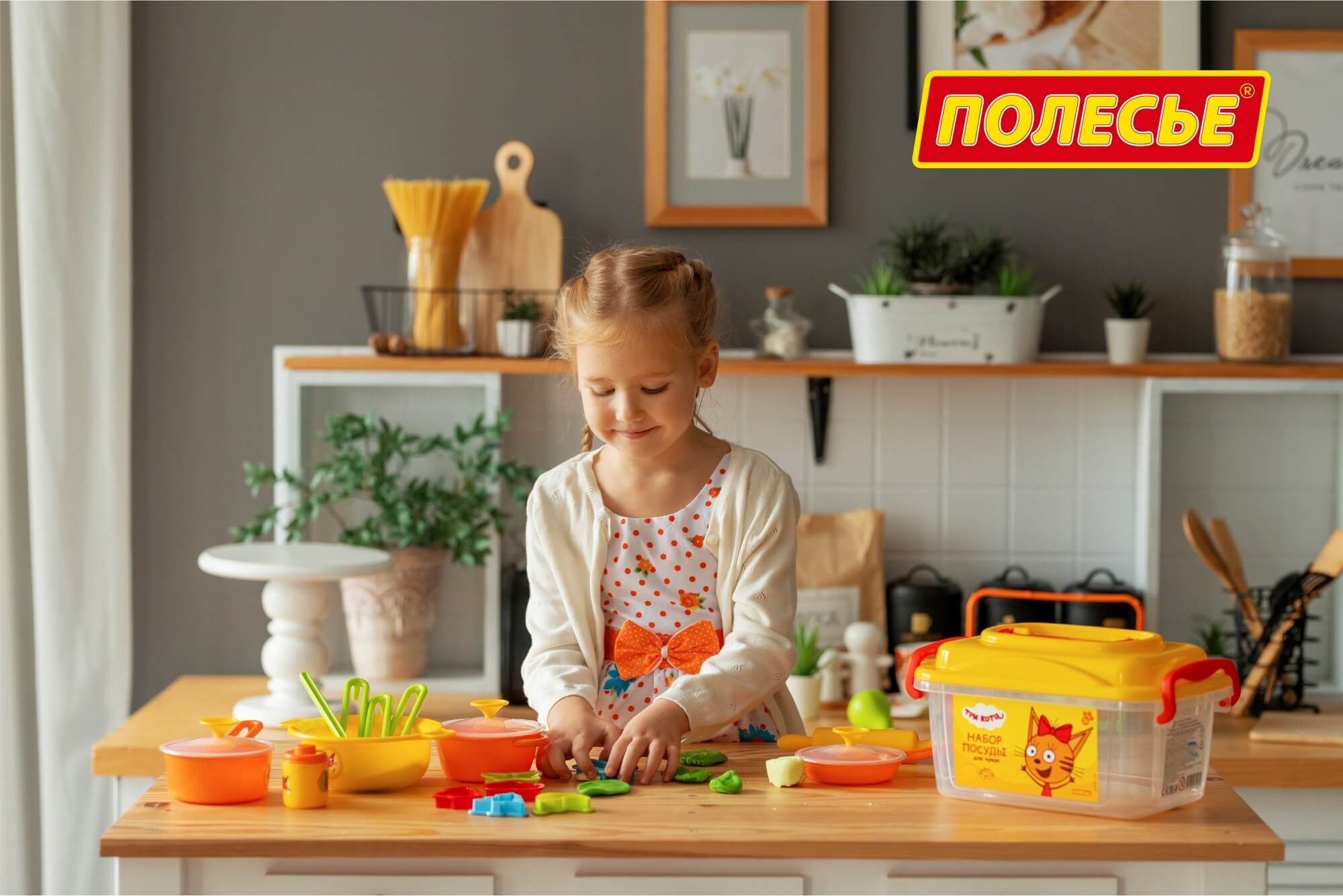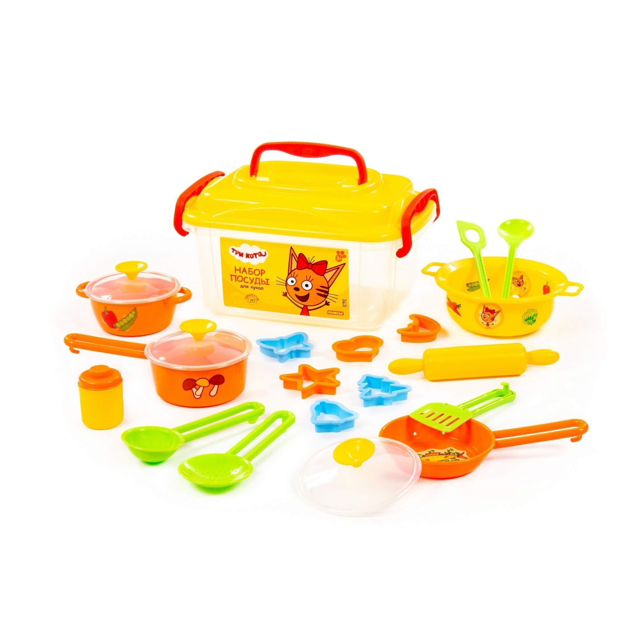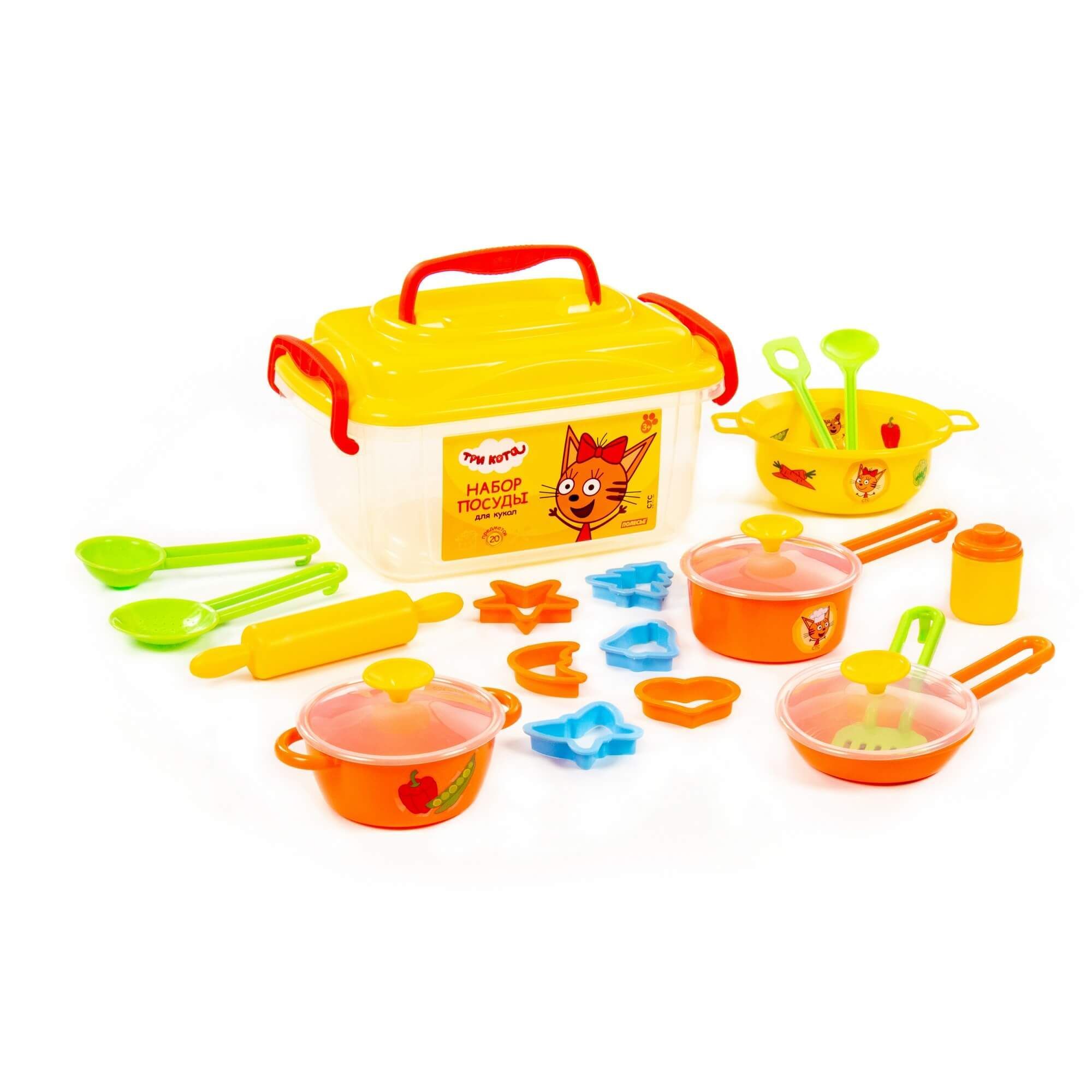 кастрюлька с ручкой и крышечкой — 1 шт., сковорода с крышечкой — 1 шт., миска глубокая с ручками — 1 шт., скалка — 1 шт., формочки — 6 шт., баночка с крышечкой — 1 шт., нож для теста — 1 шт., ложка — 1 шт., черпак — 1 шт., лопатка — 1 шт., шумовка — 1 шт. Набор упакован в прозрачный контейнер с изображением персонажей мультсериала «Три кота». Таким образом, комплект удобно хранить и перемещать.