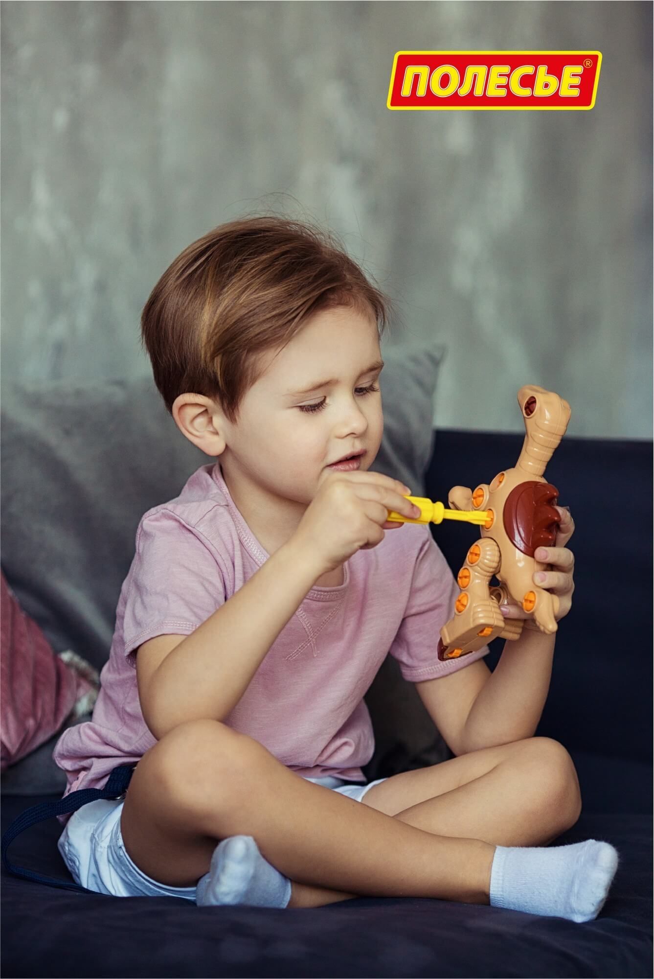 Фабрика «Полесье» предлагает детям стать маленькими палеонтологами и представляет серию конструкторов в виде динозавров. Мальчики и девочки познакомятся с "Тираннозавром", "Стегозавром", "Трицератопсом", "Диплодоком", "Велоцираптором". Игрушка выполнена в ярких цветах, из качественного материала, имеет округлую форму. Все элементы представлены в виде конструктора, который соединяется с помощью пластмассовых шурупов. В набор включена крестообразная отвёртка. Этот инструмент сделает игру интереснее и позволит разбирать\ собирать динозавров. Игра с таким конструктором знакомит ребёнка с древним миром животных. А также развивает фантазию, учит моделированию и конструированию.
