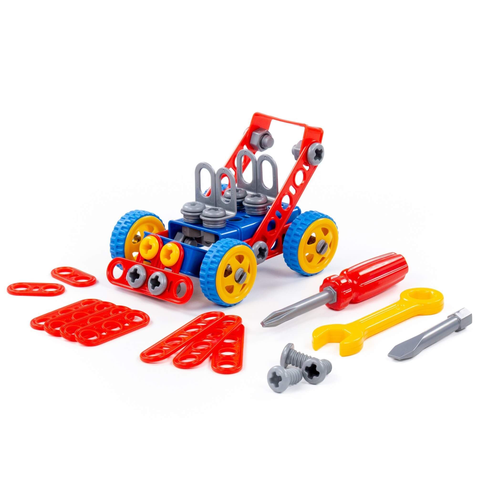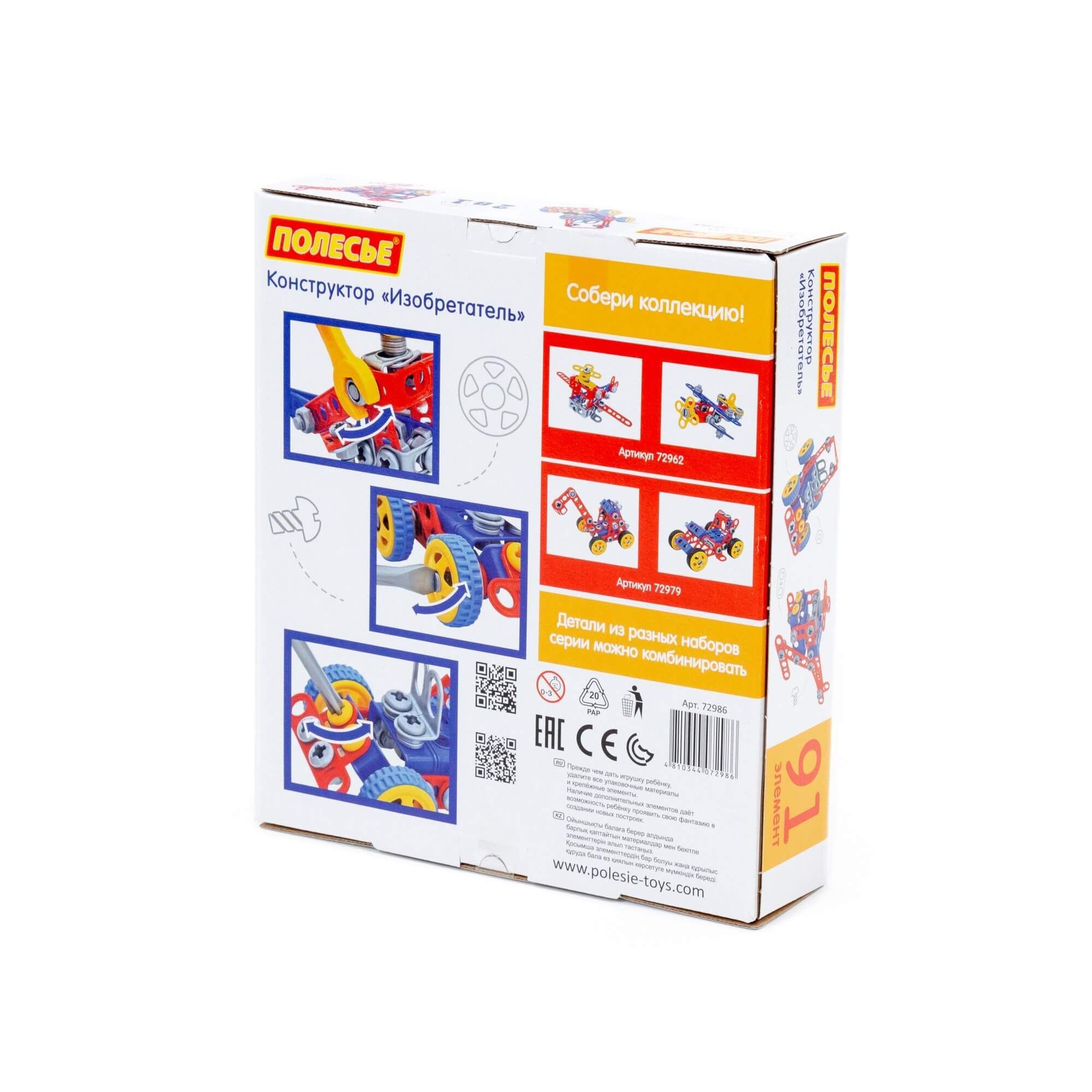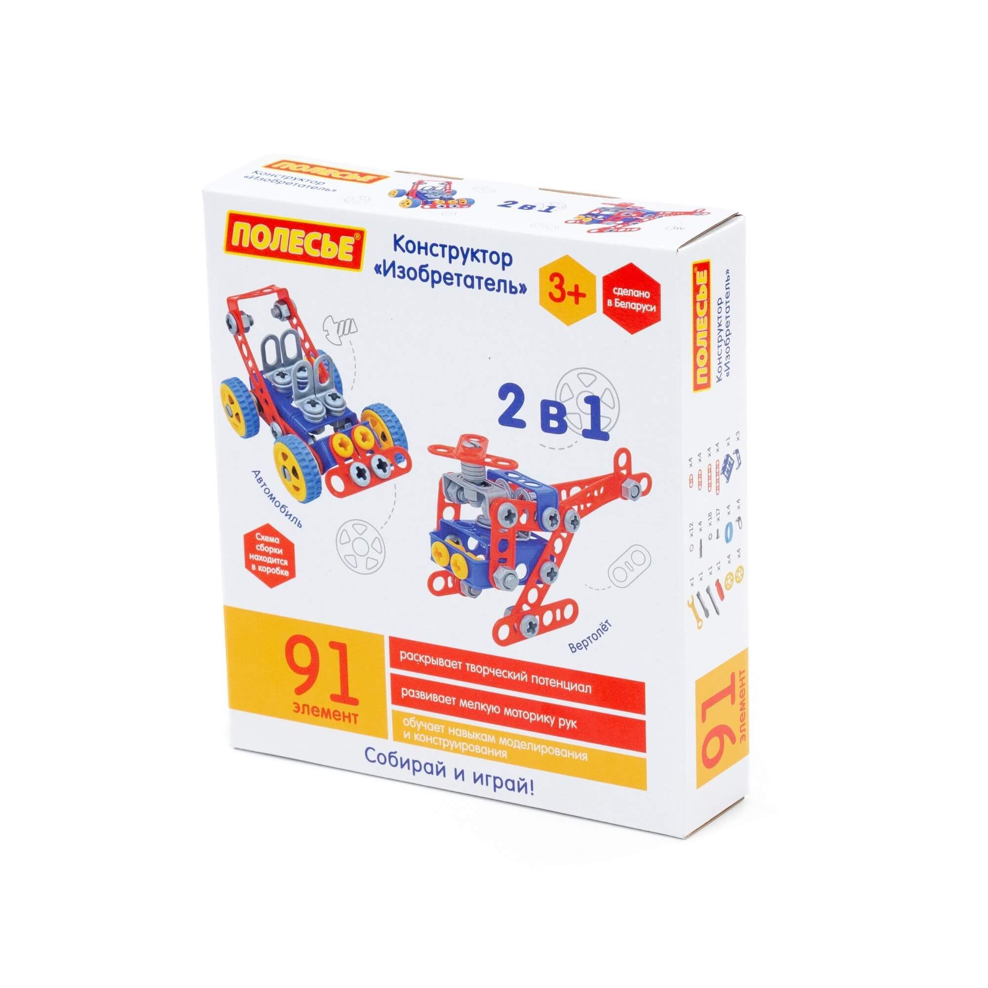Конструктор «Изобретатель» (91 элемент) от фабрики «Полесье» отличается особым функционалом. Элементы выполнены в виде планок, пазы которых соединяются при помощи болтов и гаек. В комплект конструктора входят подробные инструкции, следуя которым можно собрать модели, представленные на упаковке игрушки. При этом ребёнок будет развивать усидчивость и внимание. Игра с данной серией конструкторов не ограничивается сборкой моделей по инструкции, дети всегда могут попробовать создать что-то новое, используя свою фантазию, пространственное и ассоциативное мышление. Игры с конструктором могут определить будущую профессию малыша, раскрыв в нём творческий потенциал. Все конструкторы серии «Изобретатель» совершенно разные, поэтому из них можно собрать целую коллекцию, которая превратится в творческую мастерскую Вашего ребёнка!