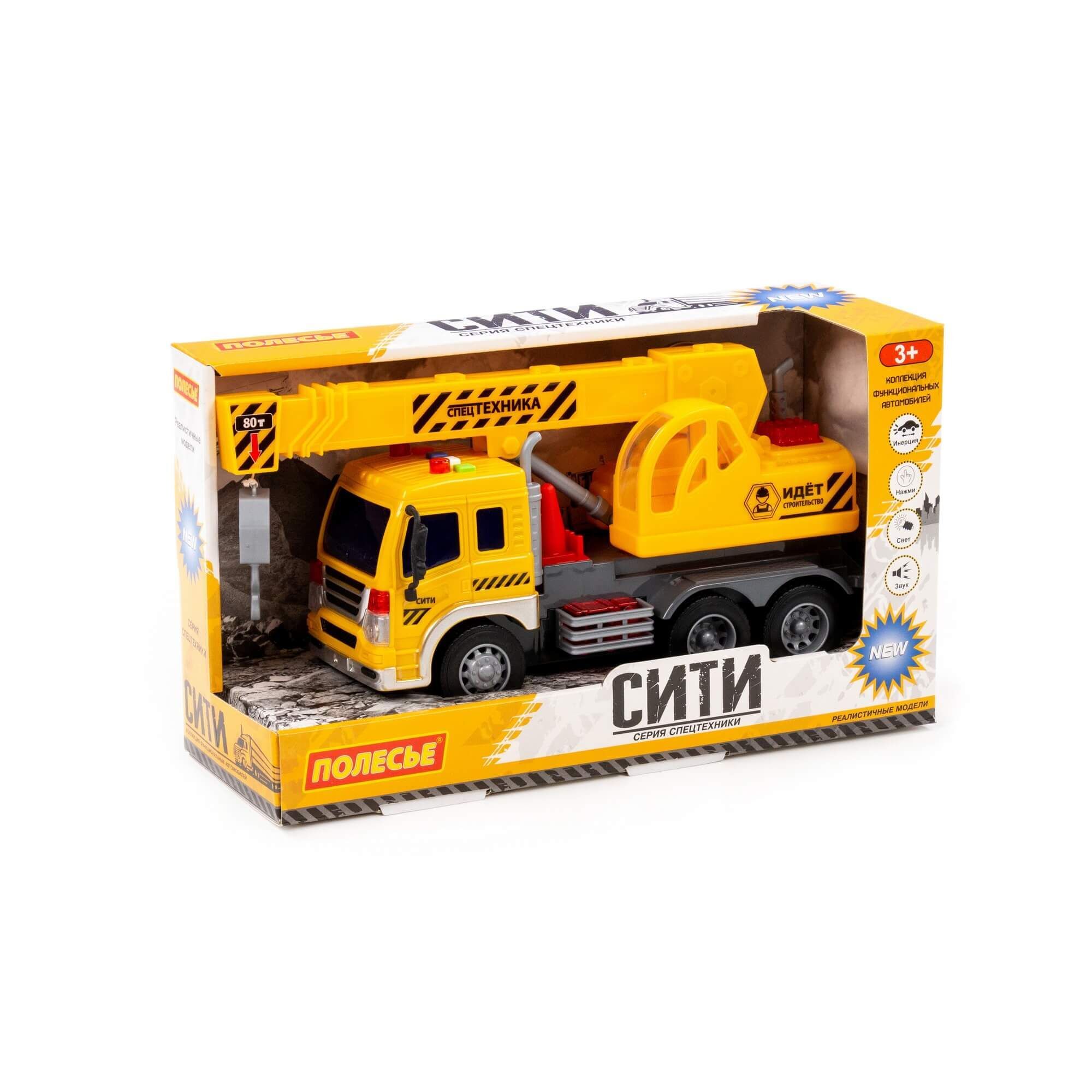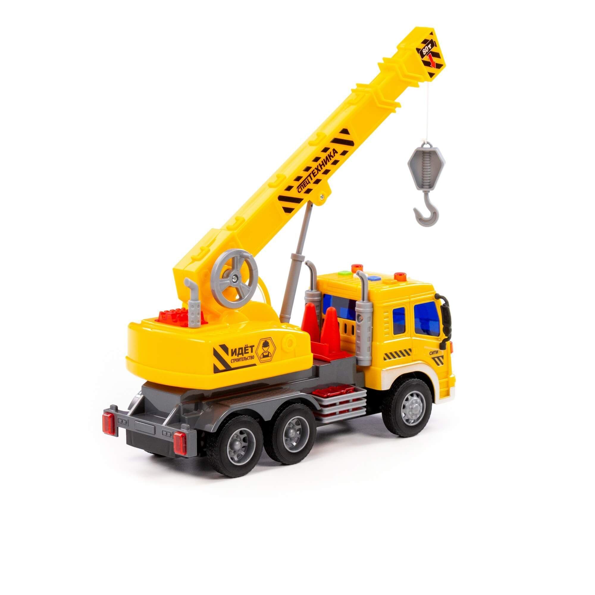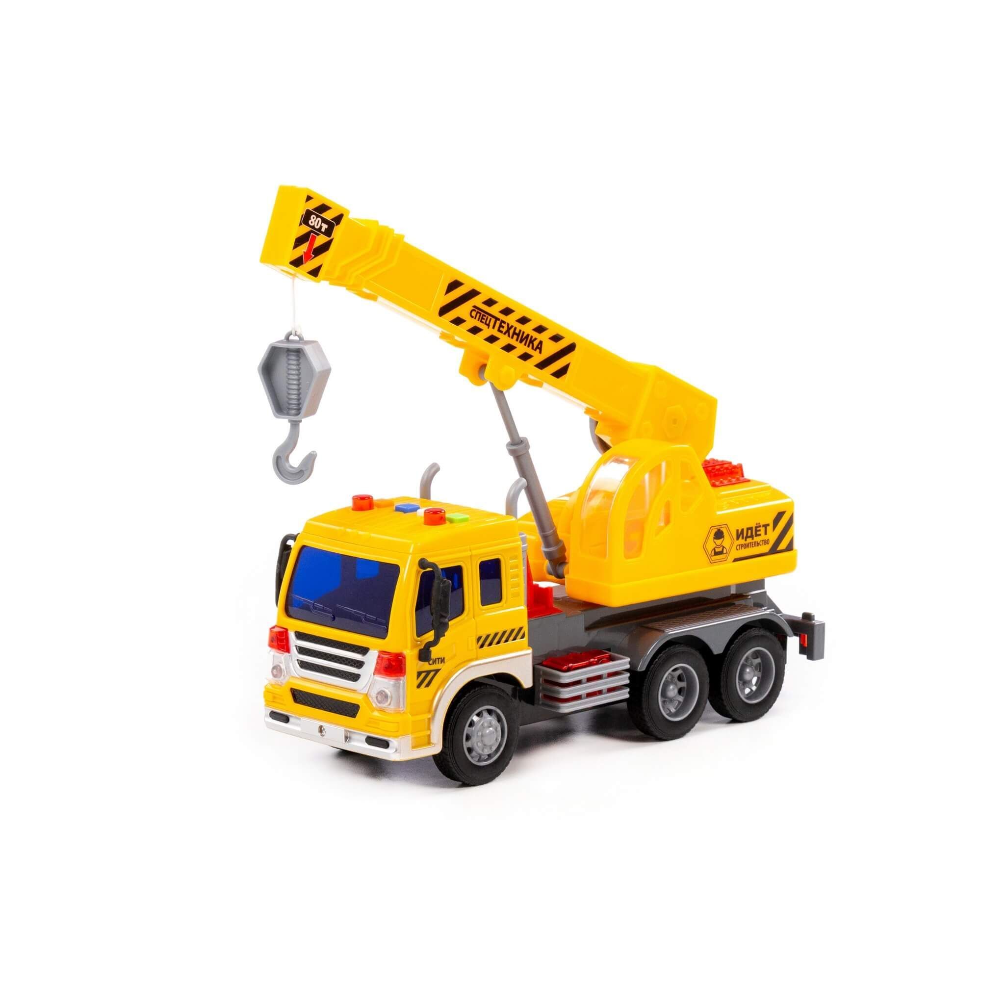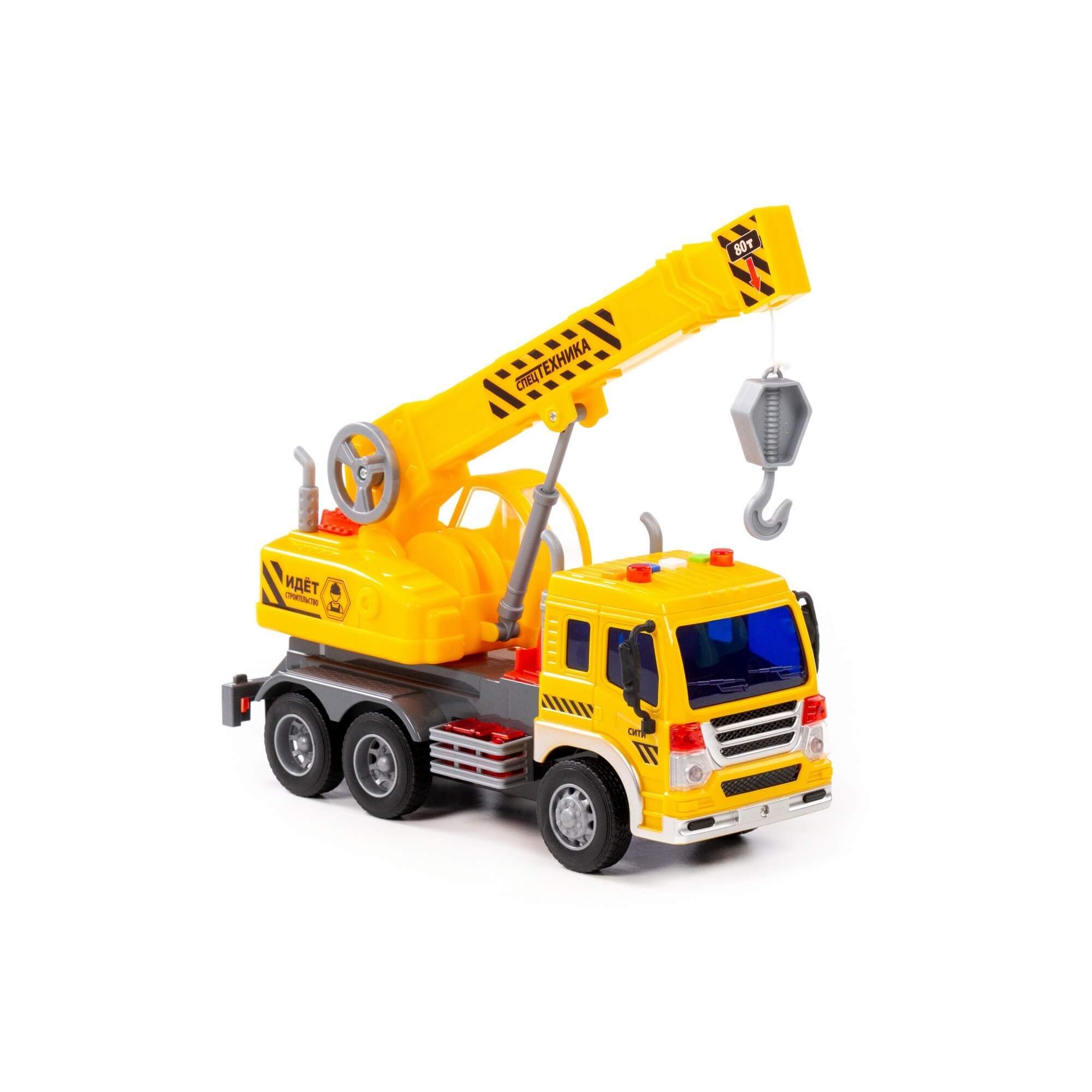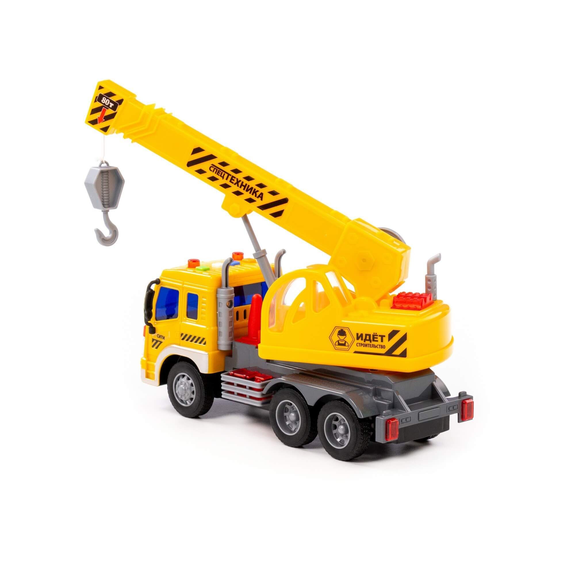 Автомобиль-кран инерционный «Сити» от фабрики «Полесье» - это качественная реалистичная игрушка, конструкция которой полностью повторяет дизайн настоящей техники. Спецмашина имеет три пары колёс на металлических осях, кроме того, она оснащена поворотной платформой с подвижным краном, который позволит придумывать различные сценарии игры. На кабине авто имеется 4 кнопки управления звуковыми и световыми эффектами.