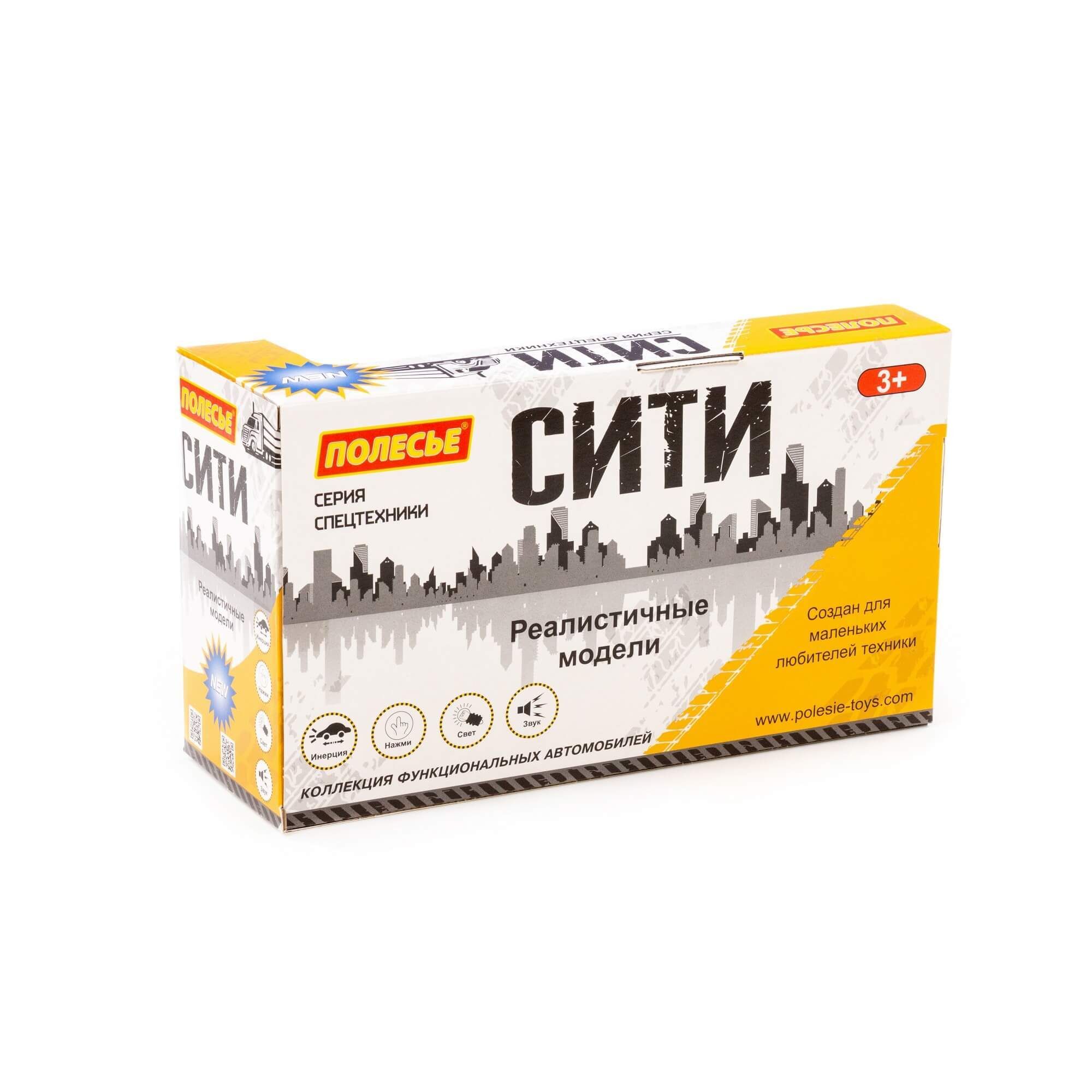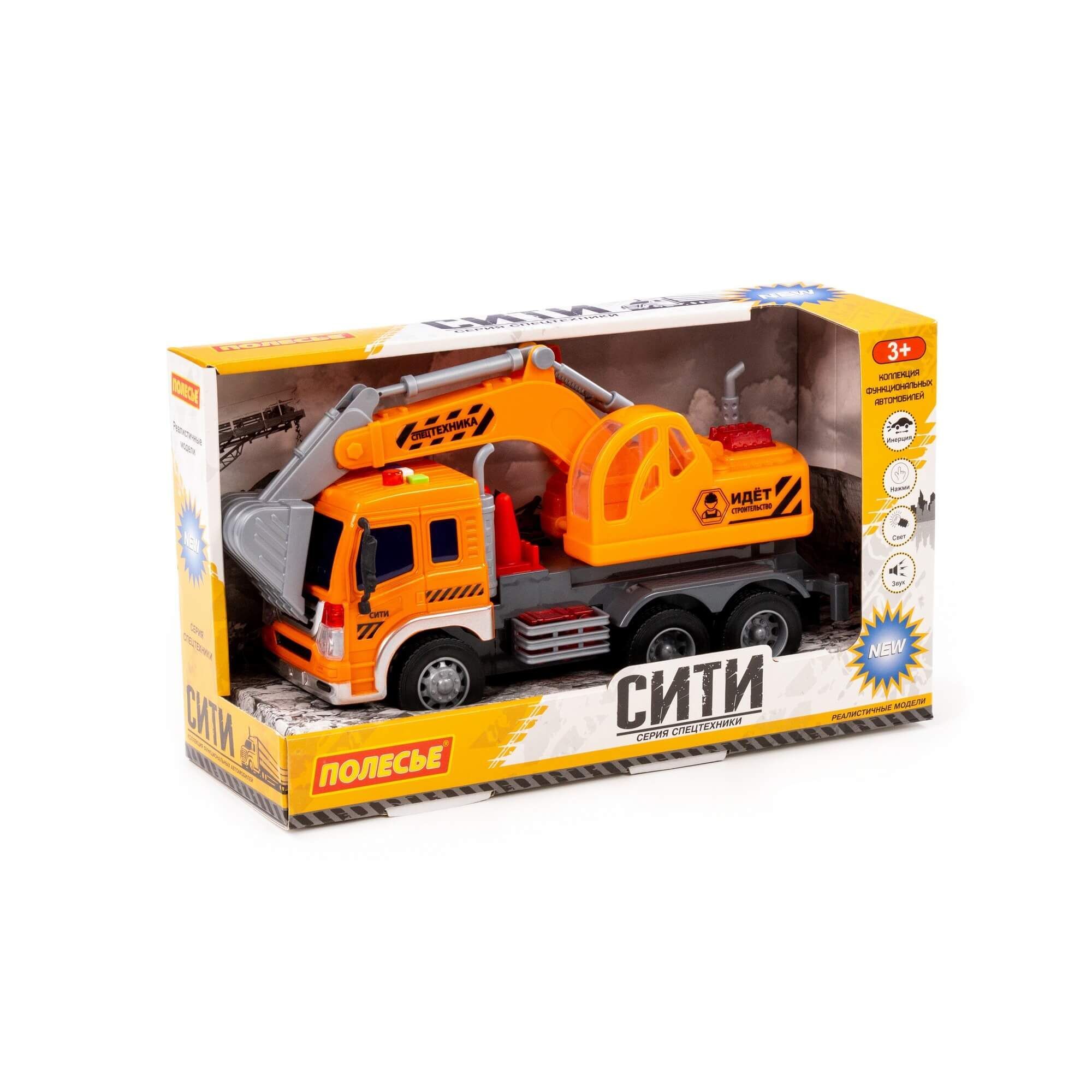 Автомобиль-экскаватор инерционный «Сити» от фабрики «Полесье» - это качественная реалистичная игрушка, конструкция которой полностью повторяет дизайн настоящей техники. Спецмашина имеет три пары колёс на металлических осях, кроме того, она оснащена поворотной платформой с подвижным ковшом, который позволит придумывать различные сценарии игры. На кабине авто имеется 4 кнопки управления звуковыми и световыми эффектами.