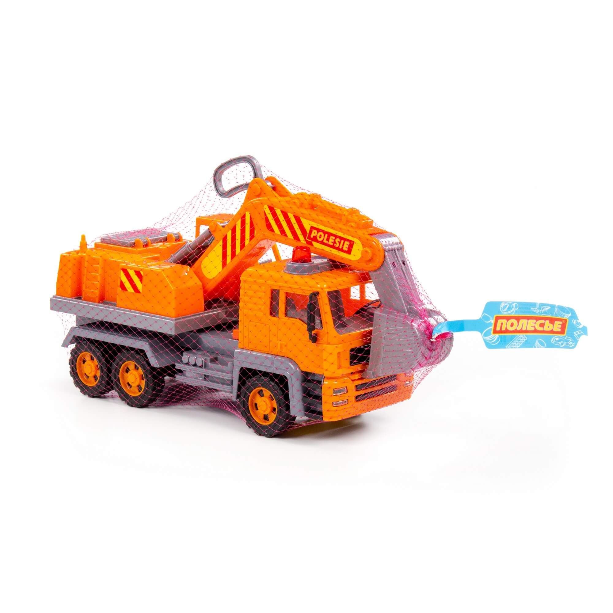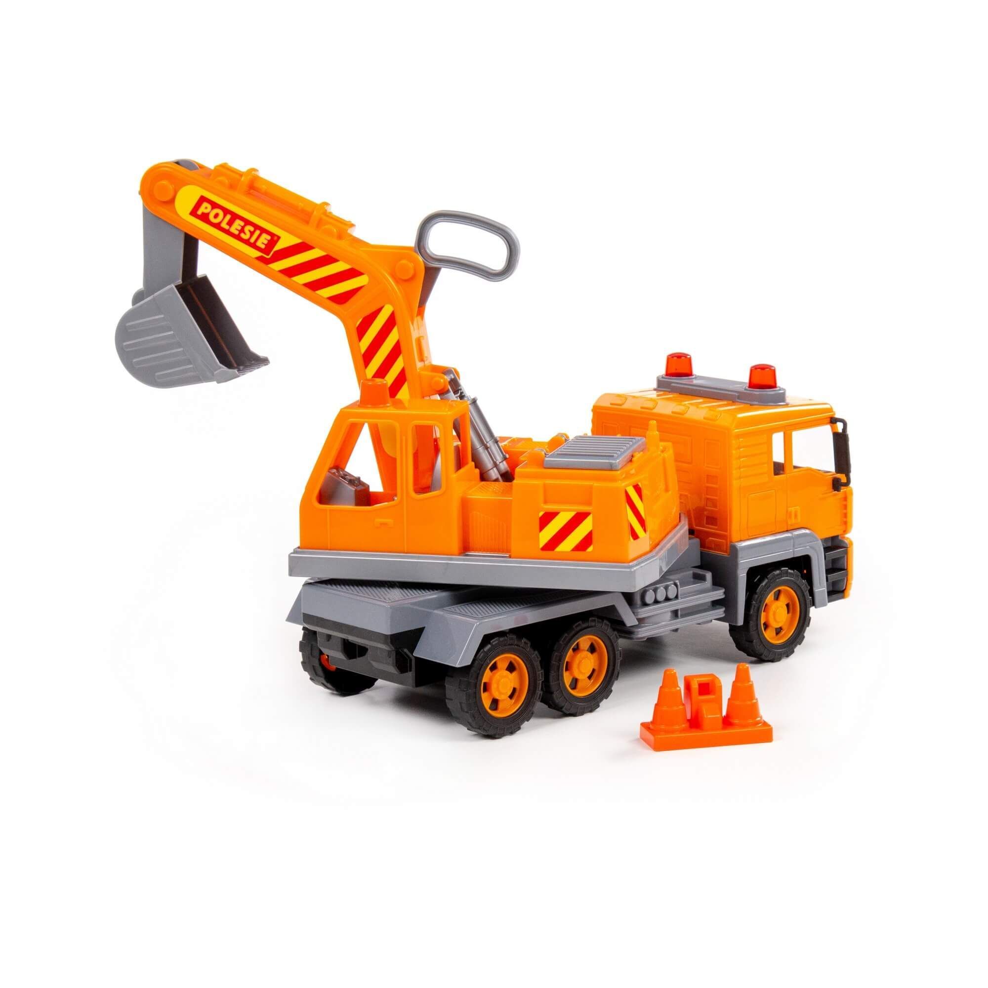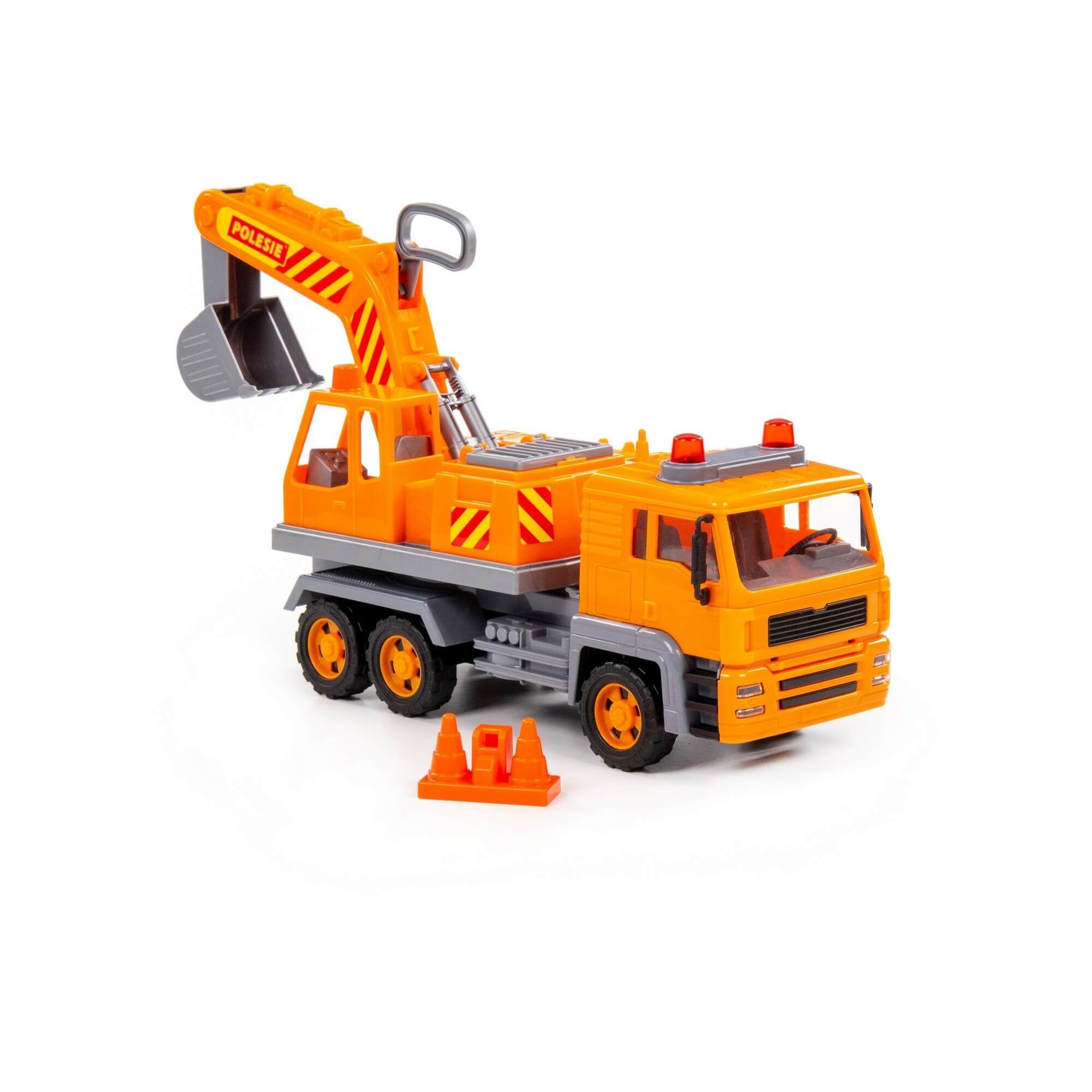 Автомобиль-экскаватор No2 из серии «Алмаз» – один из видов спец. техники, который незаменим при промышленных работах на любой строительной площадке. Игрушка имеет подвижную поворотную платформу. Ковшом можно управлять с помощью специальной рукоятки. Реалистичности автомобилю добавляет наличие фар и проблесковых маячков. Экскаватор оснащен инерционным механизмом, а в комплекте с игрушкой идут строительные конусы, которые разнообразят и дополнят игру.