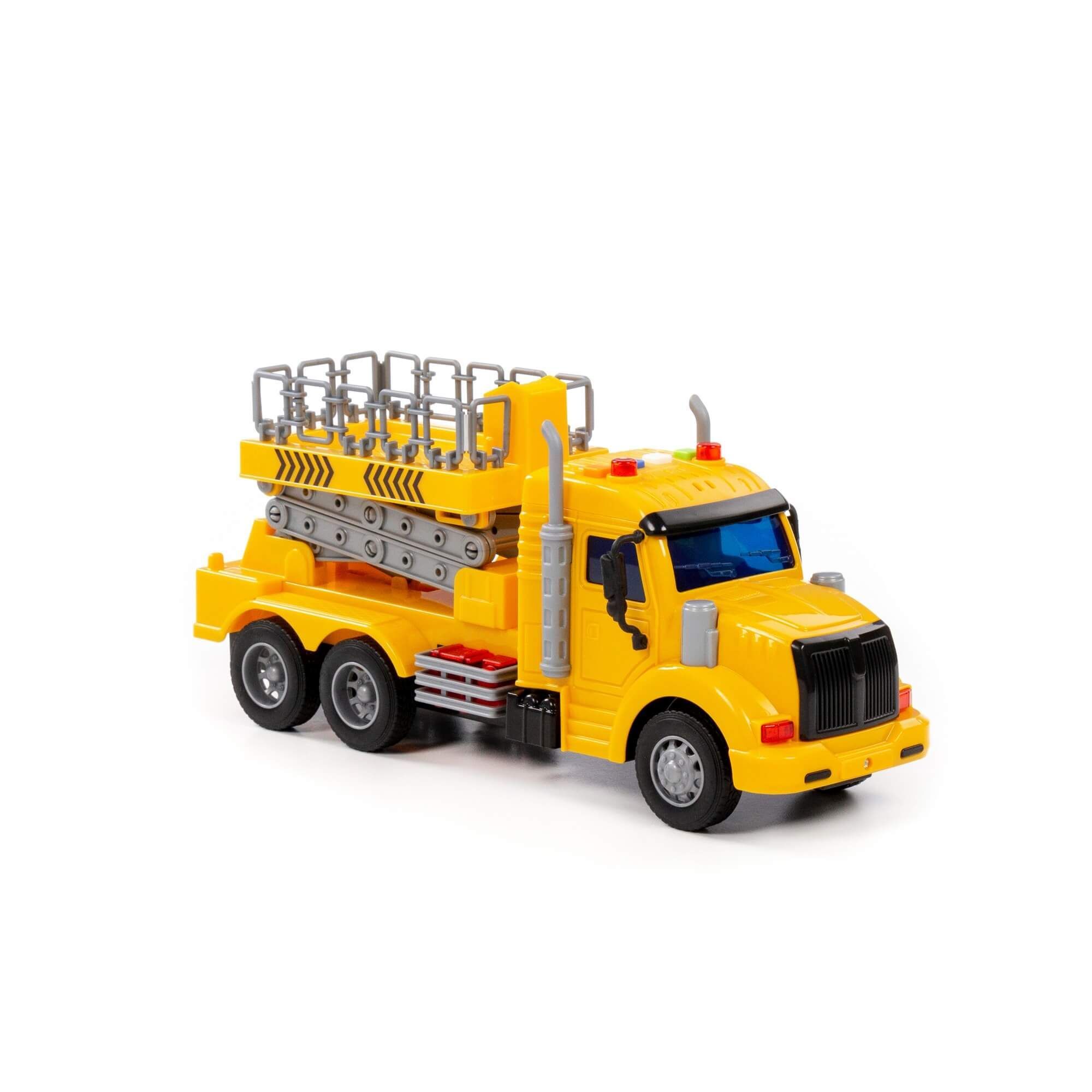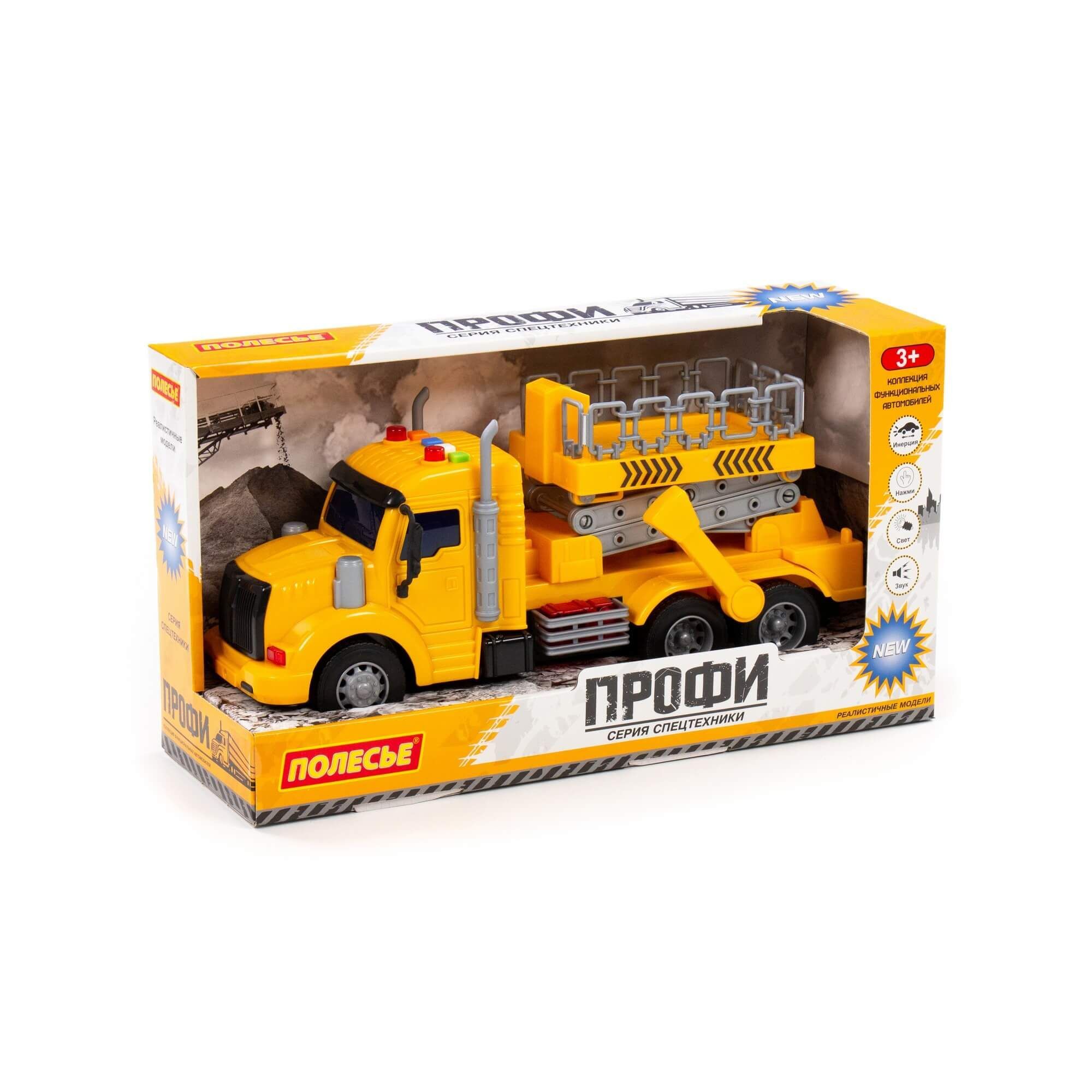 Автомобиль с подъемником инерционный «Профи» от фабрики «Полесье» - это качественная реалистичная игрушка, конструкция которой полностью повторяет дизайн настоящей техники. Спецмашина имеет три пары колёс на металлических осях, кроме того, она оснащена поднимающейся вверх платформой, которая позволит придумывать различные сценарии игры. На кабине авто имеется 4 кнопки управления звуковыми и световыми сигналами.