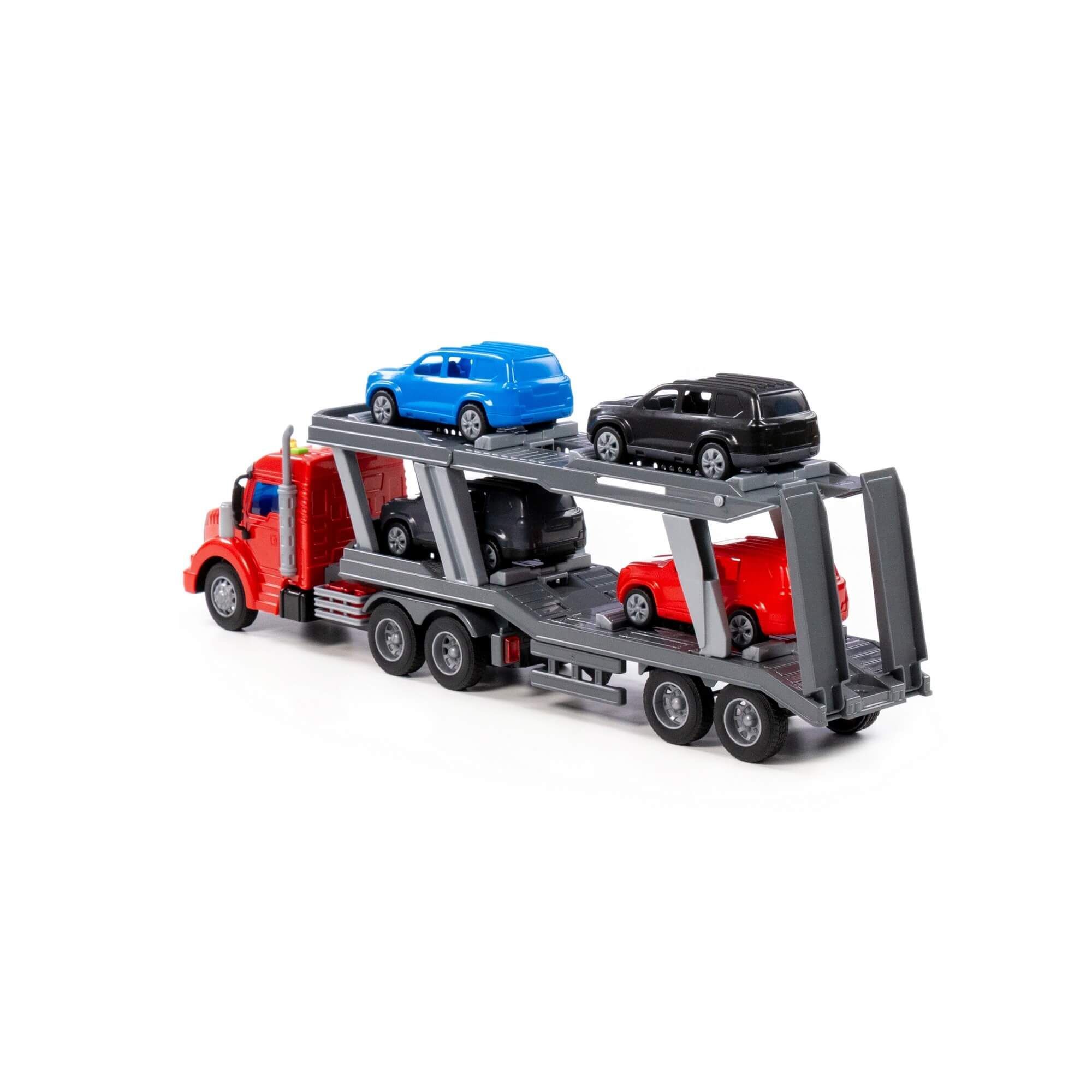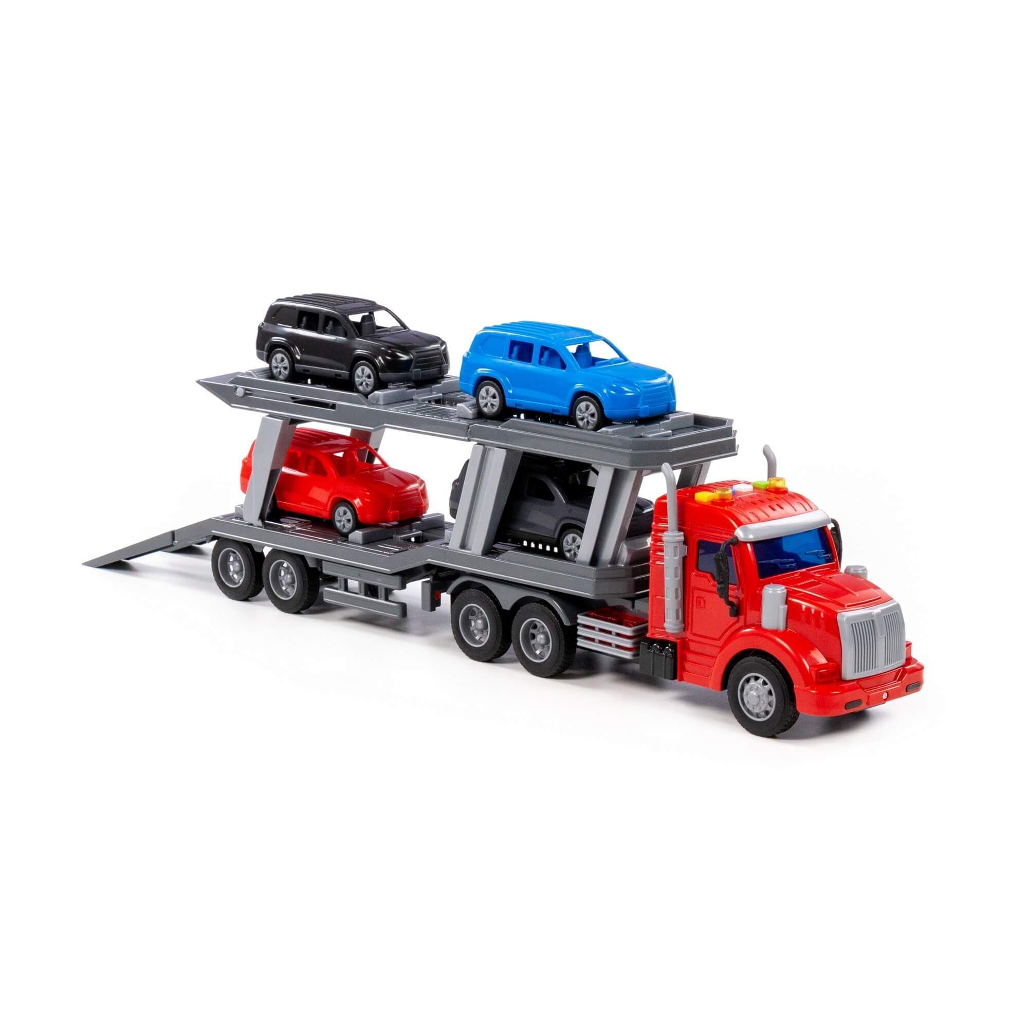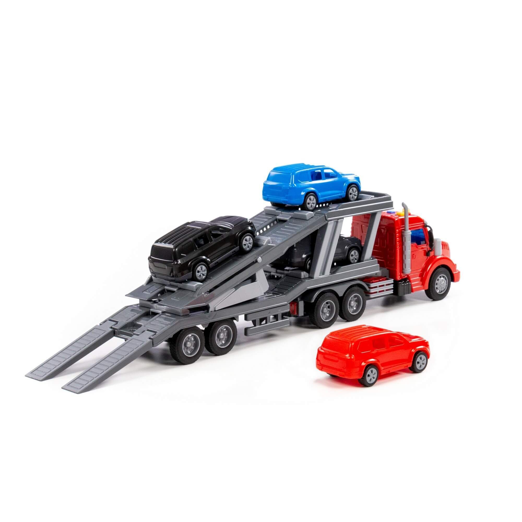 Автомобиль-тягач с полуприцепом от компании «Полесье» - необычная игрушка, которую хотел бы заполучить в свой автопарк любой мальчик. Машинка оснащена инерционным механизмом и сопровождает игру малыша световыми и звуковыми эффектами, благодаря чему ребенок проявляет еще большую заинтересованность в процессе игры, и легко придумывает все новые игровые сценарии. Платформа для автомобильной перевозки имеет удобную конструкцию, которая при необходимости меняет свое положение, для заезда игрушечных машинок. На платформе имеются упоры, предотвращающие откат автомобилей во время движения тягача. На платформе для перевозки размещается четыре ярких автомобиля. В процессе игры ребенок приобретает интерес к различным видам техники, развивает мелкую моторику, ловкость, внимание и фантазию.