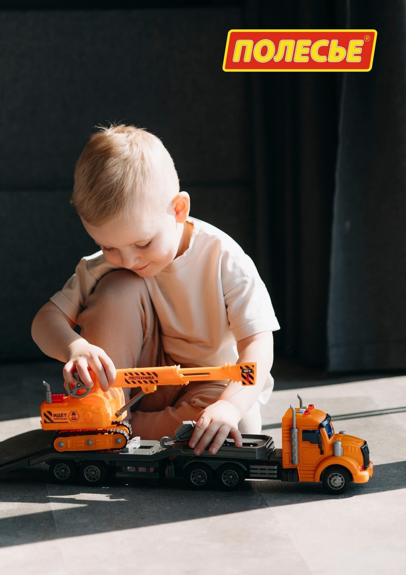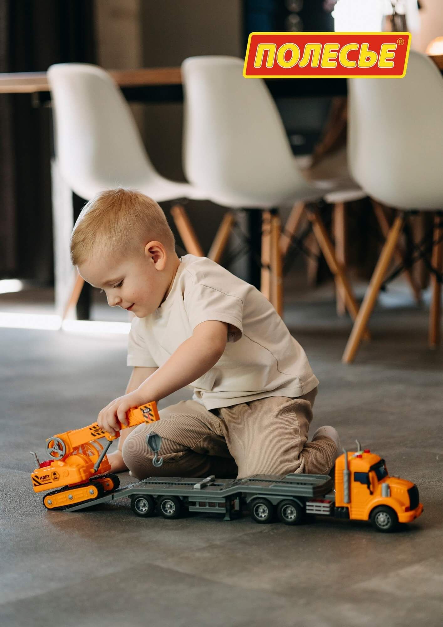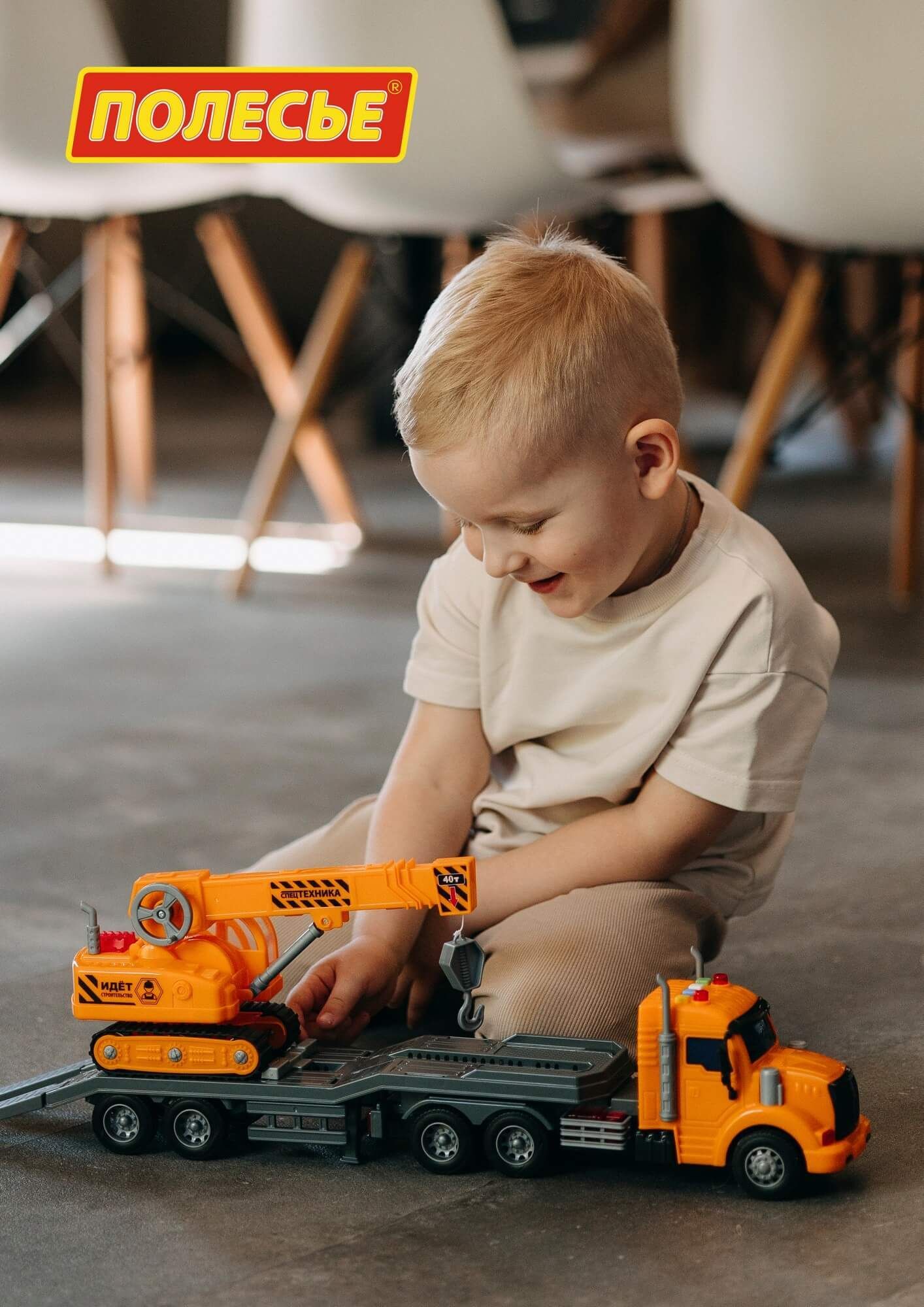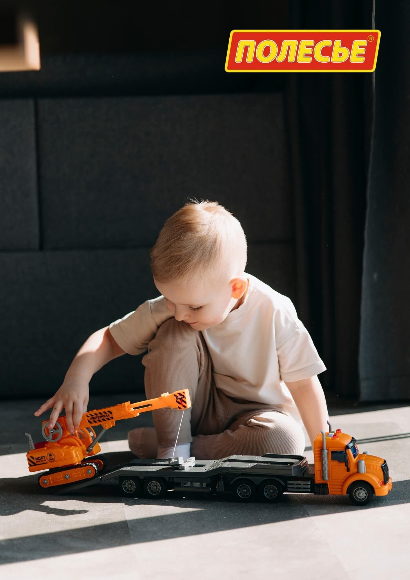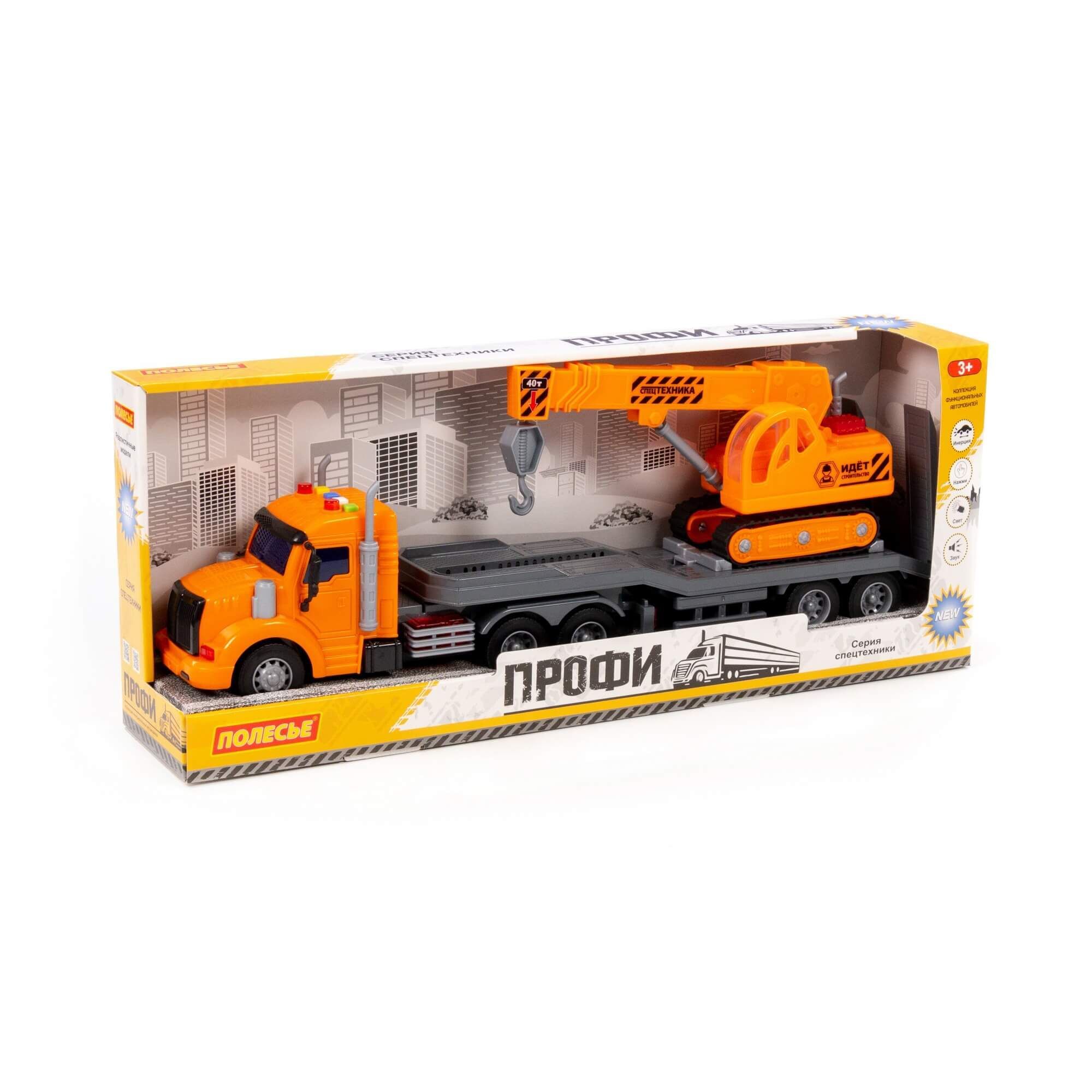 Автомобиль-трейлер «Профи» полностью повторяет конструкцию настоящей техники. В набор входит гусеничный кран, который можно перевозить на платформе трейлера. Автомобиль оснащён инерционным механизмом. На кабине машины 4 кнопки управления звуковыми и световыми эффектами. Продается игрушка в коробке.