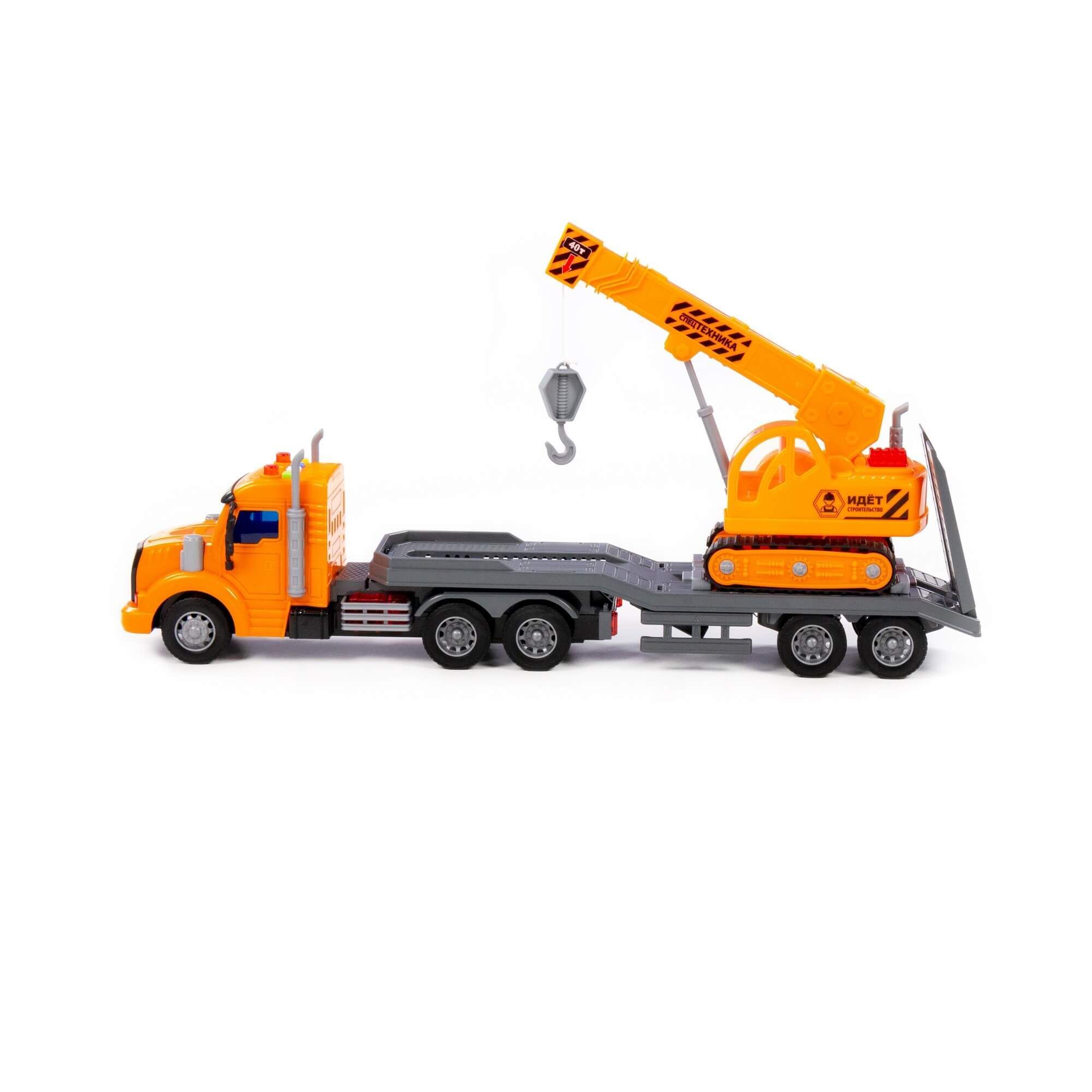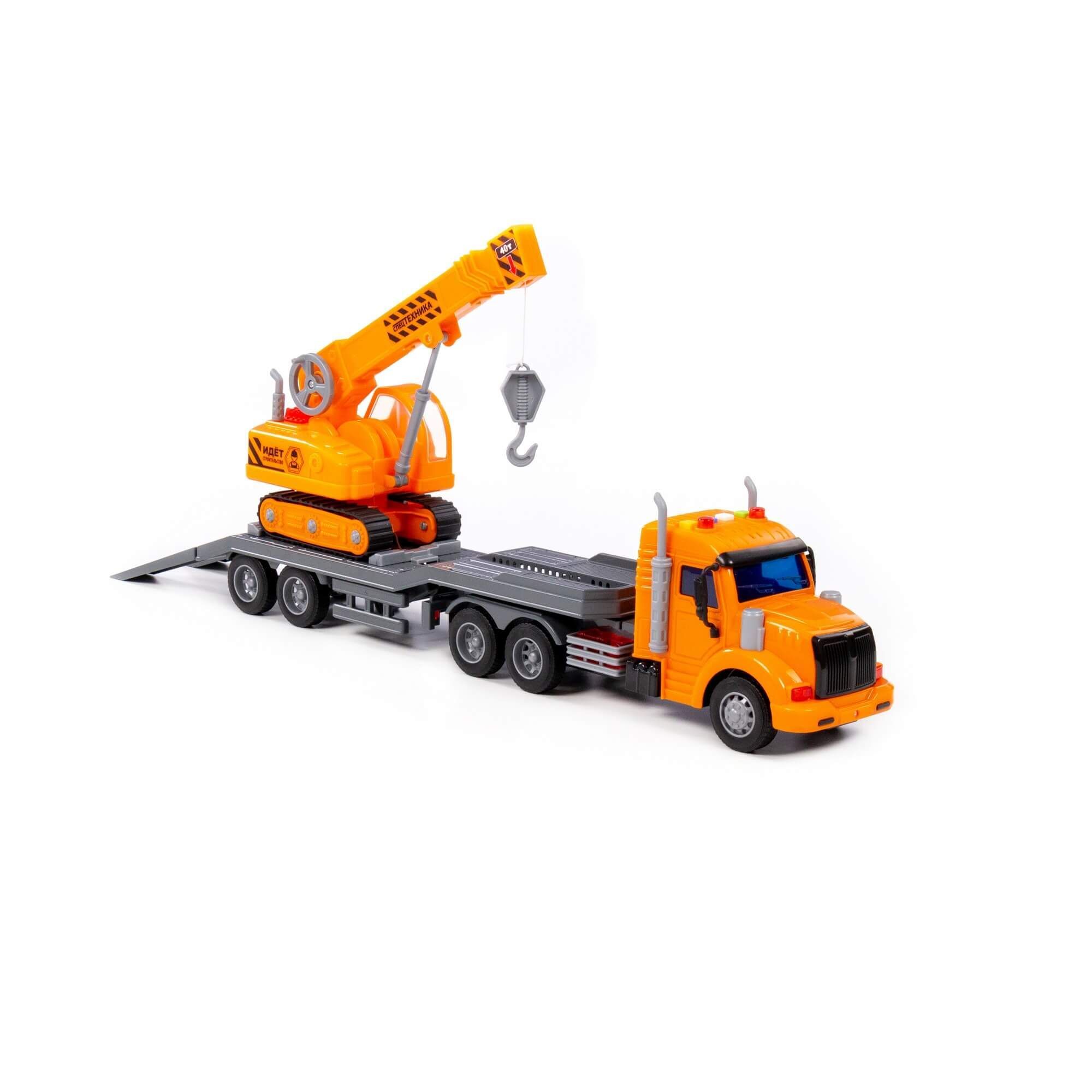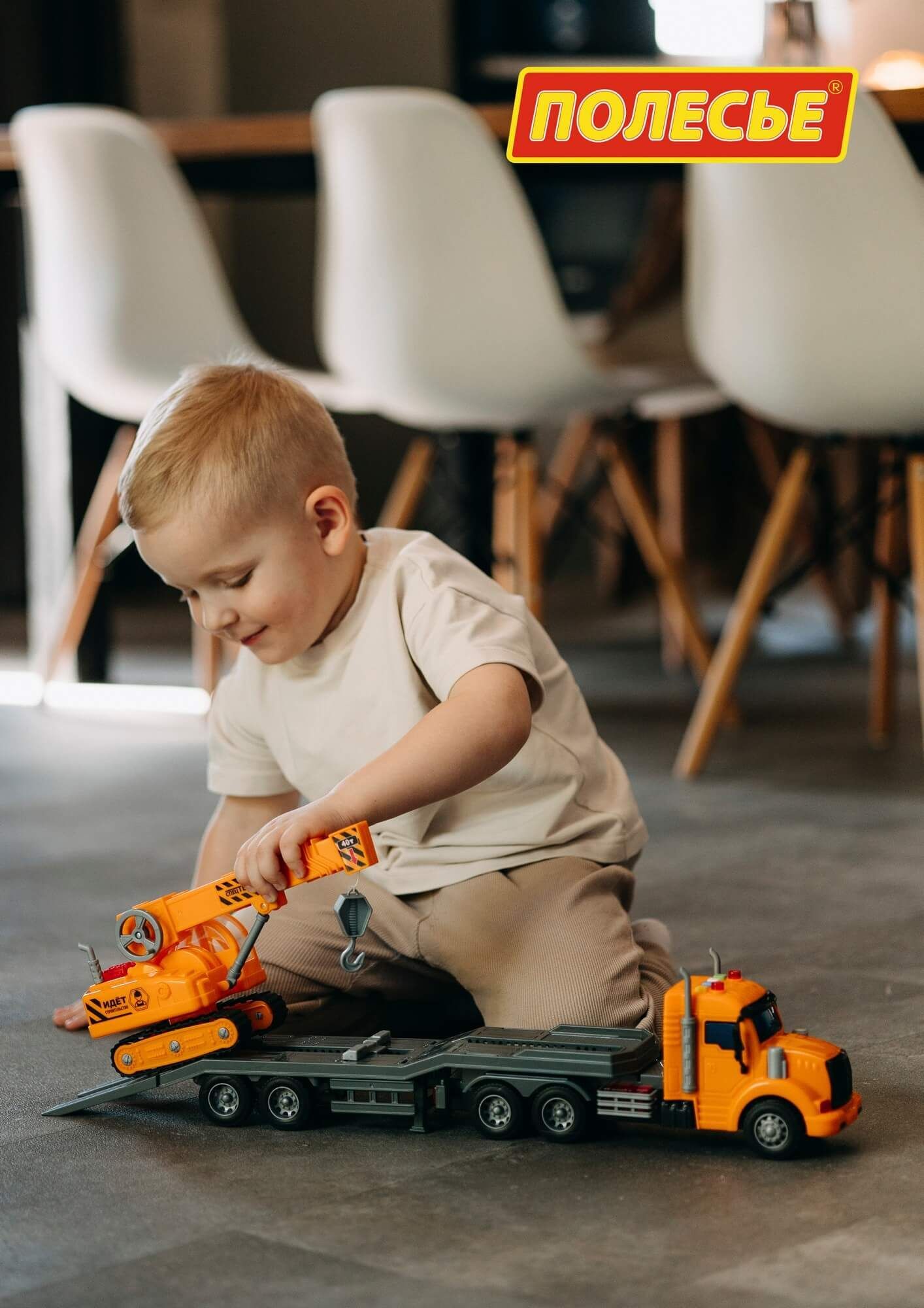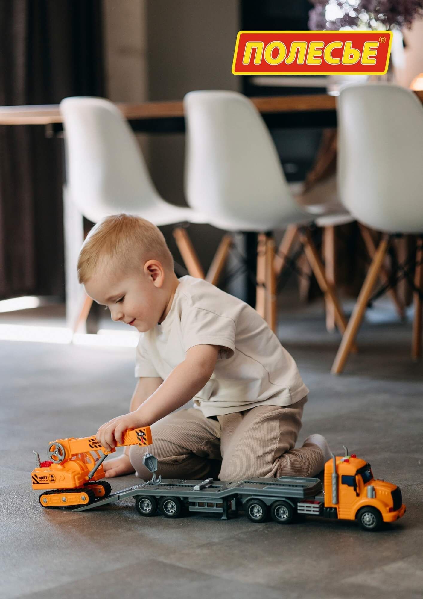 Автомобиль-трейлер «Профи» полностью повторяет конструкцию настоящей техники. В набор входит гусеничный кран, который можно перевозить на платформе трейлера. Автомобиль оснащён инерционным механизмом. На кабине машины 4 кнопки управления звуковыми и световыми эффектами. Продается игрушка в коробке.
